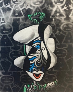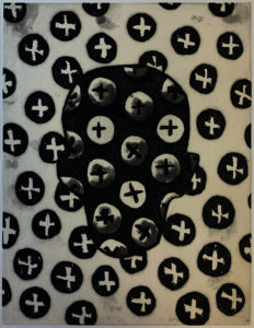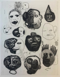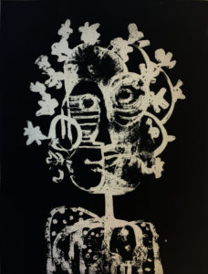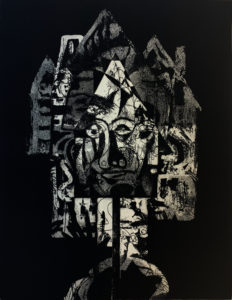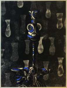 His repertory of imagery—musicians, dancing figures, double-headed men and assorted religious icons—suggests playful bacchanalian rituals. The exotic and mysterious take root as totems in Hansen’s work. The cross appears in different forms in both his paintings and sculpture, as the pagans used it centuries before Christ. Wooden screens are transformed into objects of devotion covered with images of spotted cats, fishermen, flying fish, sun goddesses and sinuous mermaids. By drawing upon religious and artistic sources rooted in both primitive and contemporary culture, James Hansen invests his art with complex, many-layered meanings. He depicts the struggle between faith and fear, love and hate, good and evil.