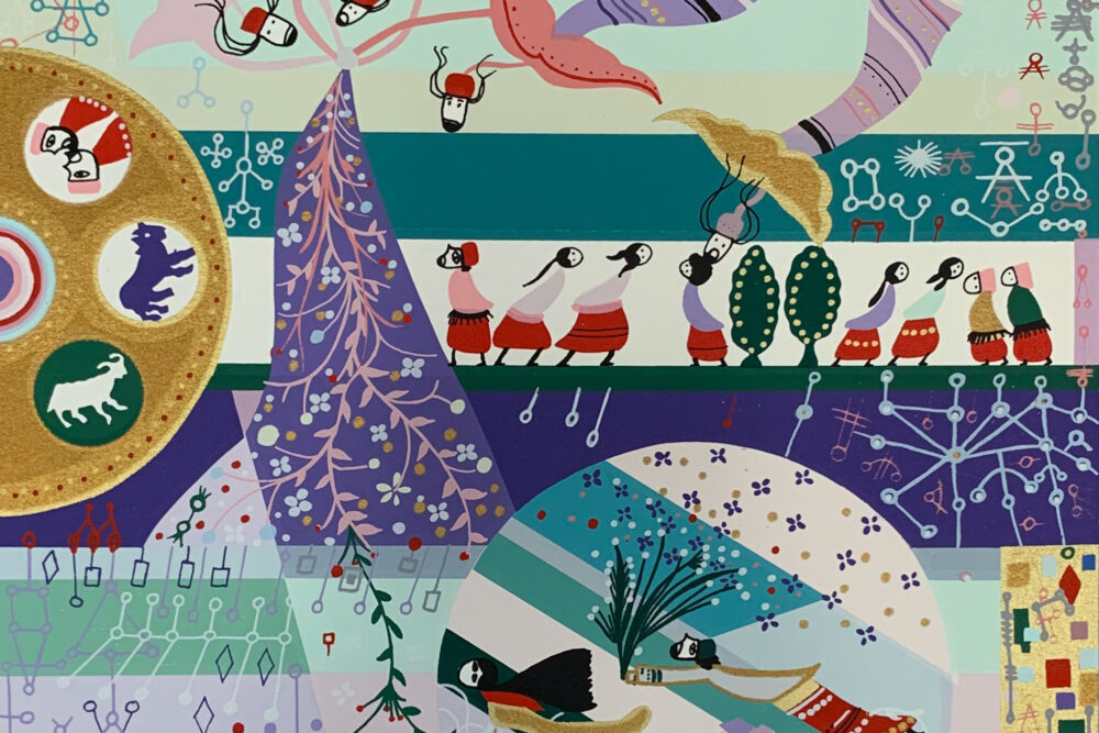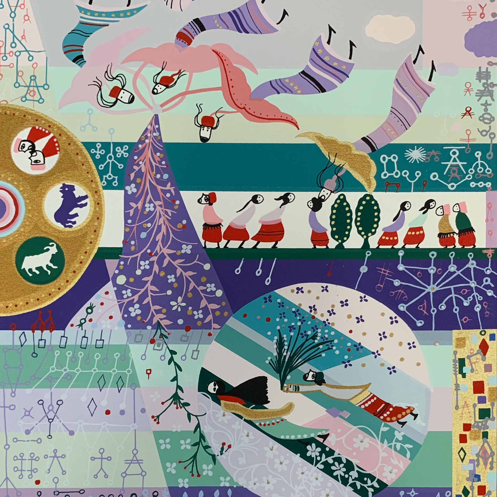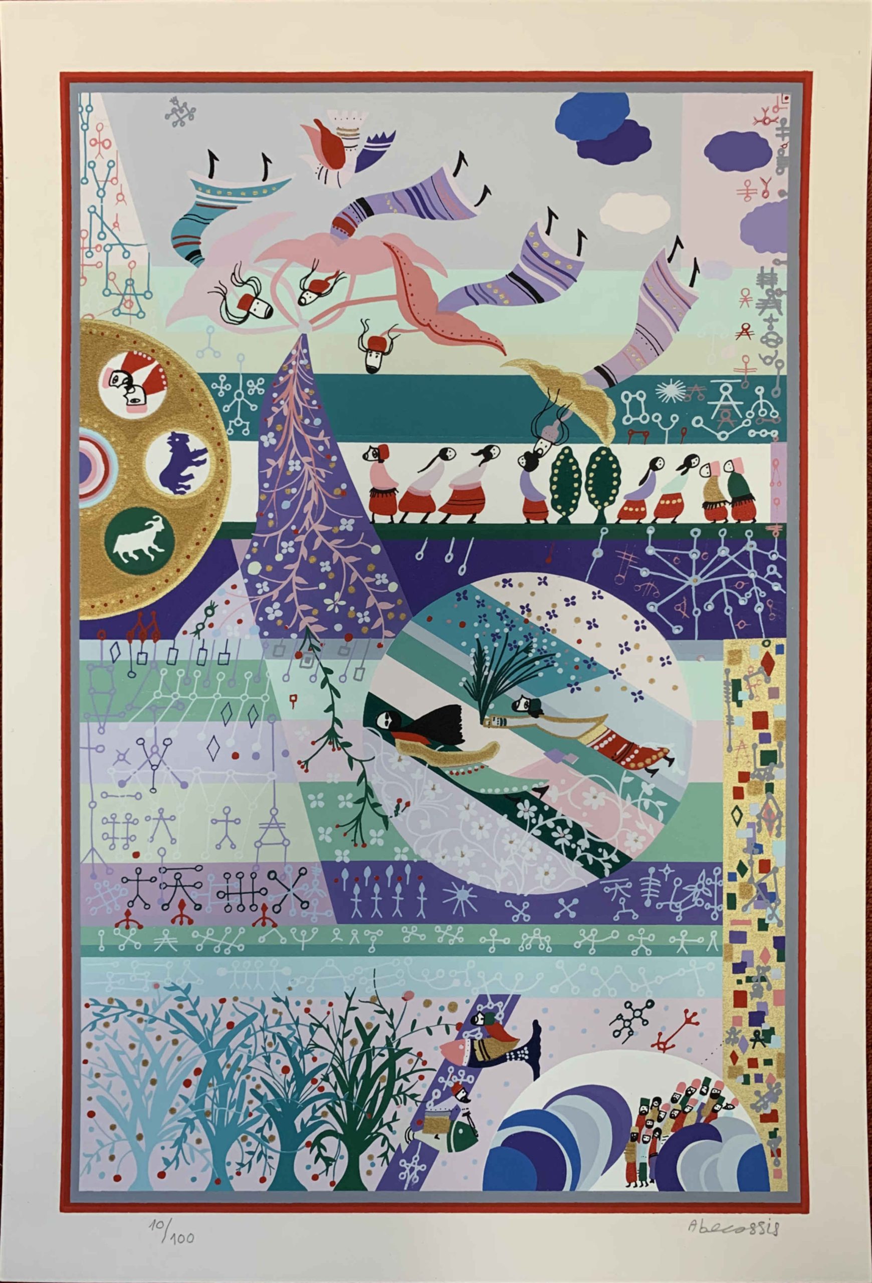 A celebration of Spring depicted with Raphael Abecassis’ beautiful colors and evocative imagery. Showing symbols from the Spring-associated astrological signs Gemini, Taurus, and Aries, the Hebrews walking through the parted Red Sea, and other seasonal imagery.