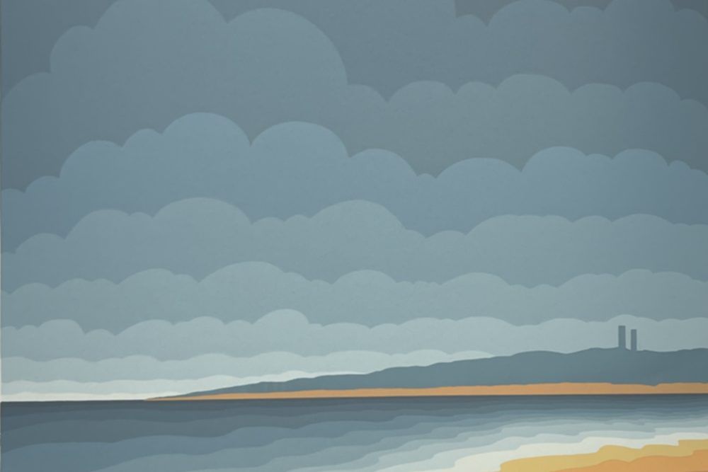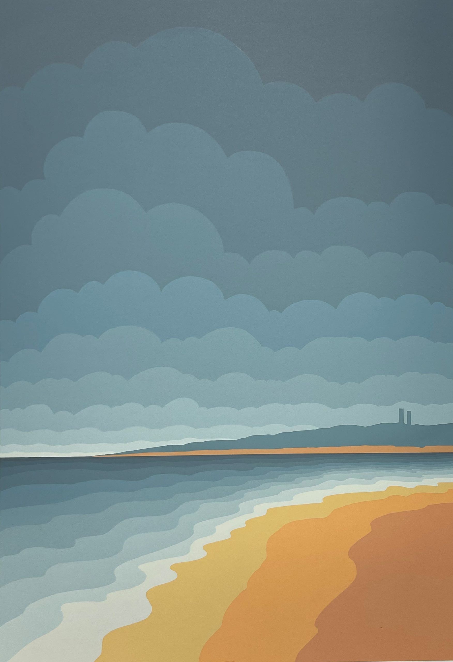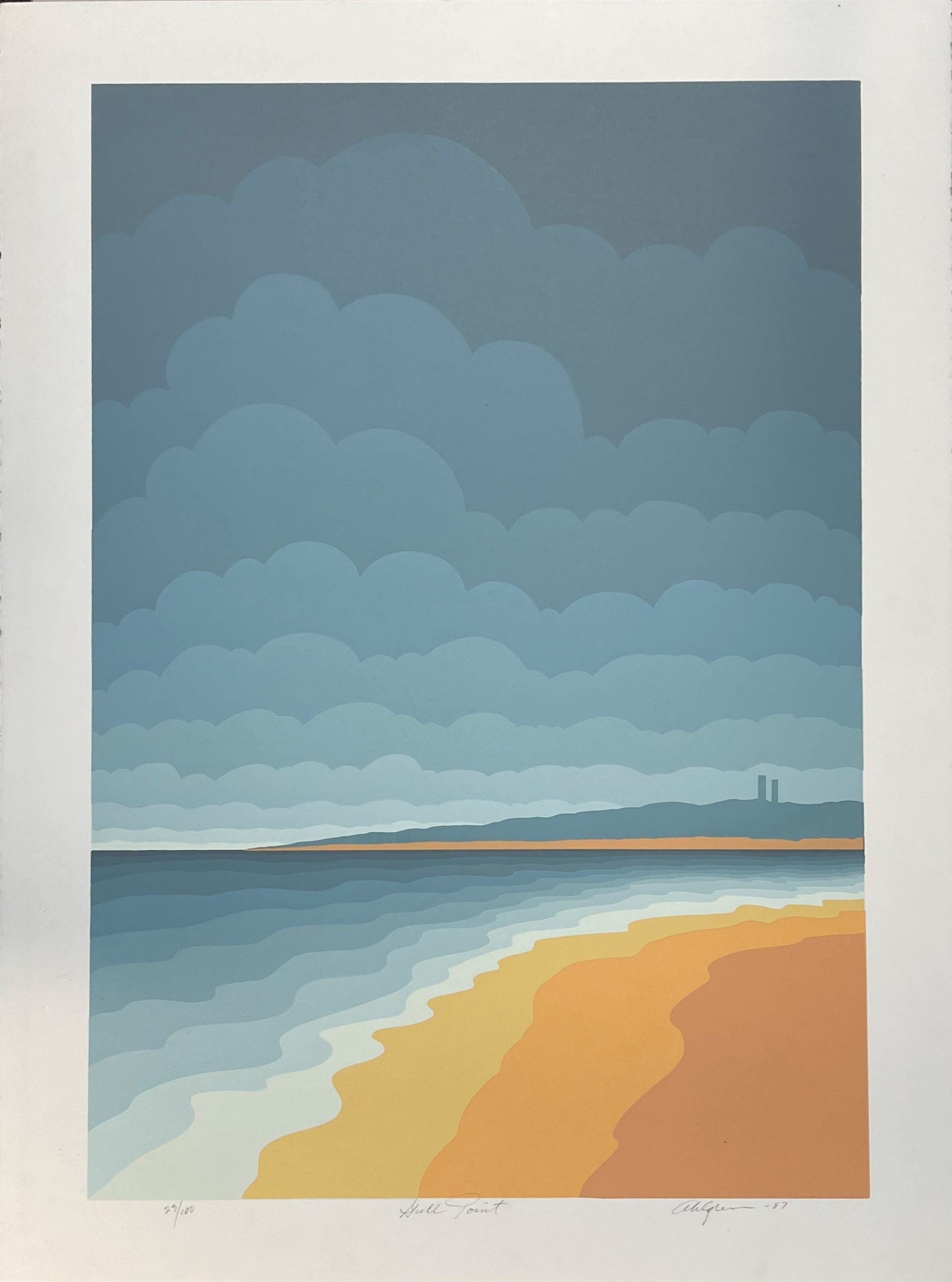 Roy Ahlgren was a sort of late Twentieth Century social realist. His artistic style was optical art but his work was often social commentary. This work appears to be a meditation on the peacefulness of a quiet beach.