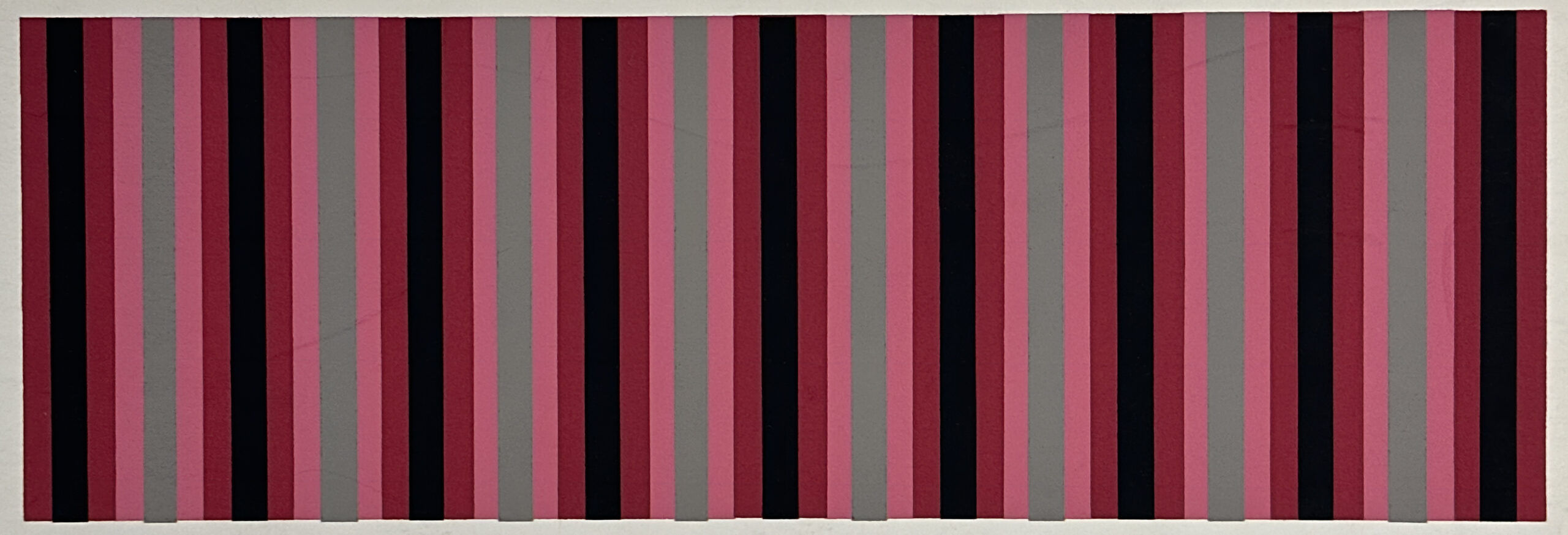 This plate is part of Plate XII-2b of Josef Alber’s famous study of color, Interaction of Color. Albers created Interaction of Color to explore how colors and shapes interact with other colors and shapes. This particular plate along with its other half are presented to prove the Bezold Effect. This picture was separated from its mate by its former owner, a university, but it stands up beautifully on its own, as a color study, an attractive image, and as part of one of the most important developments in the study of art theory.