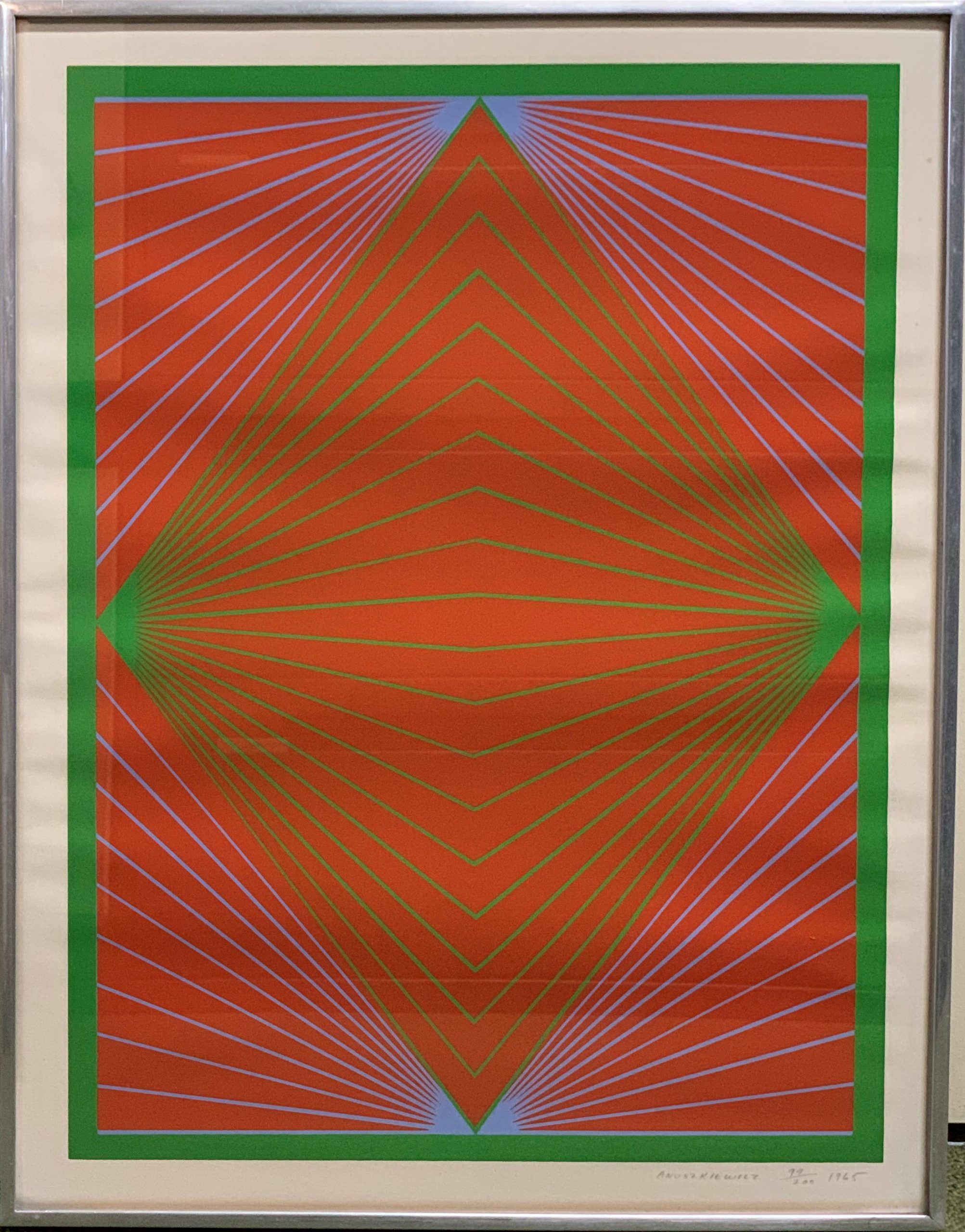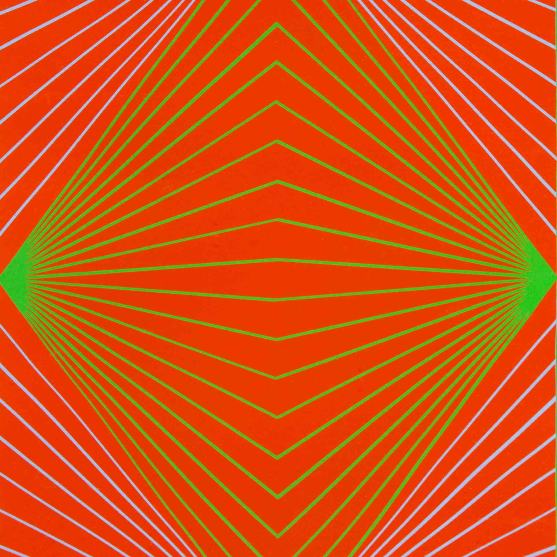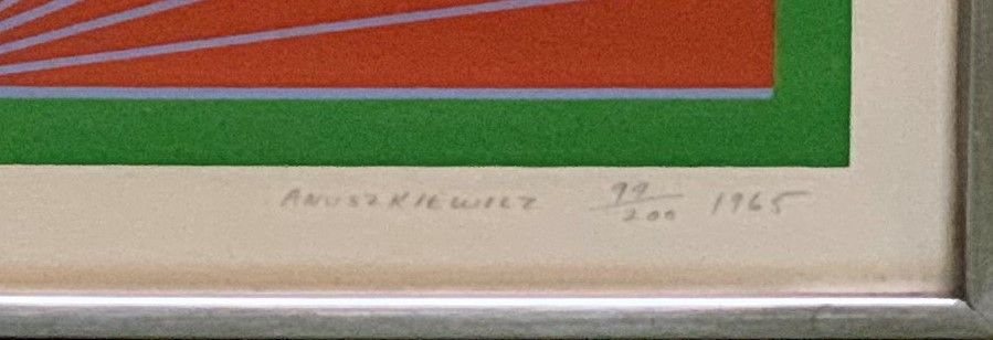 The red and green are arresting; the blue in the background fades away from view until it is noticed. Among Anuszkiewicz’s best work, and not coincidentally evocative of the work of his teacher, Josef Albers, this picture was included in the lauded portfolio “New York Ten”, which also contained works by Jim Dine, Frankenthaler, Krushenick, Lichtenstein, Oldenburg, and others.