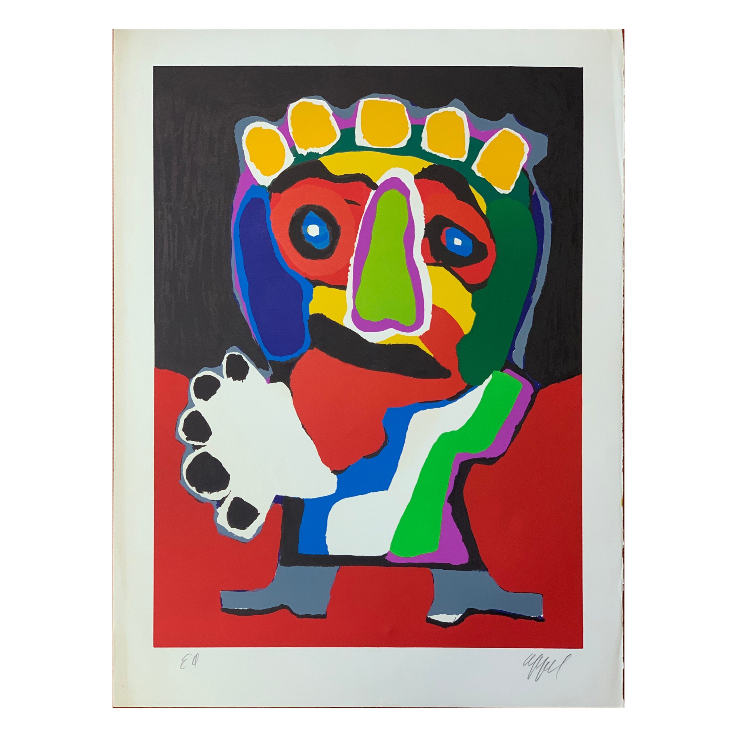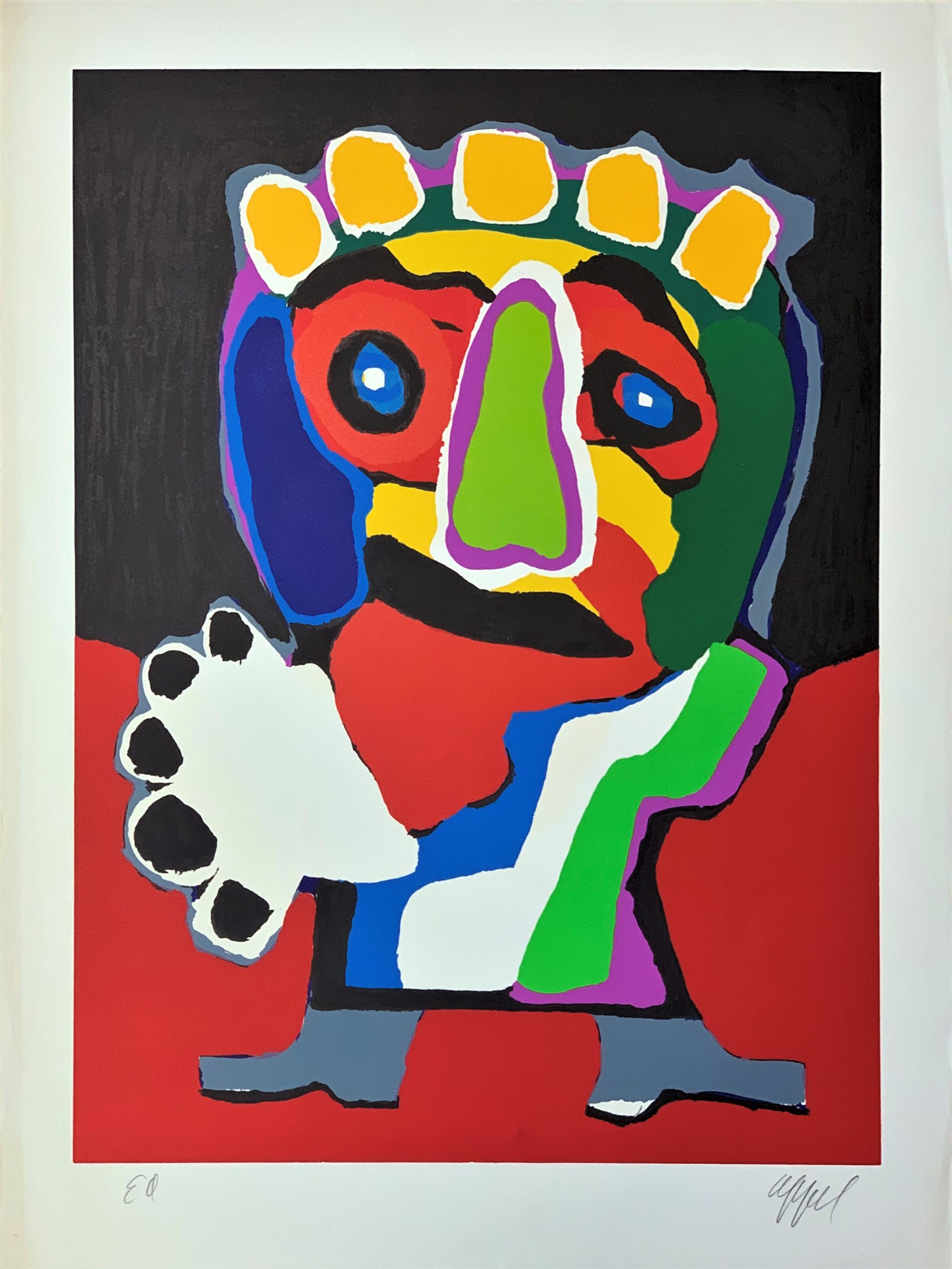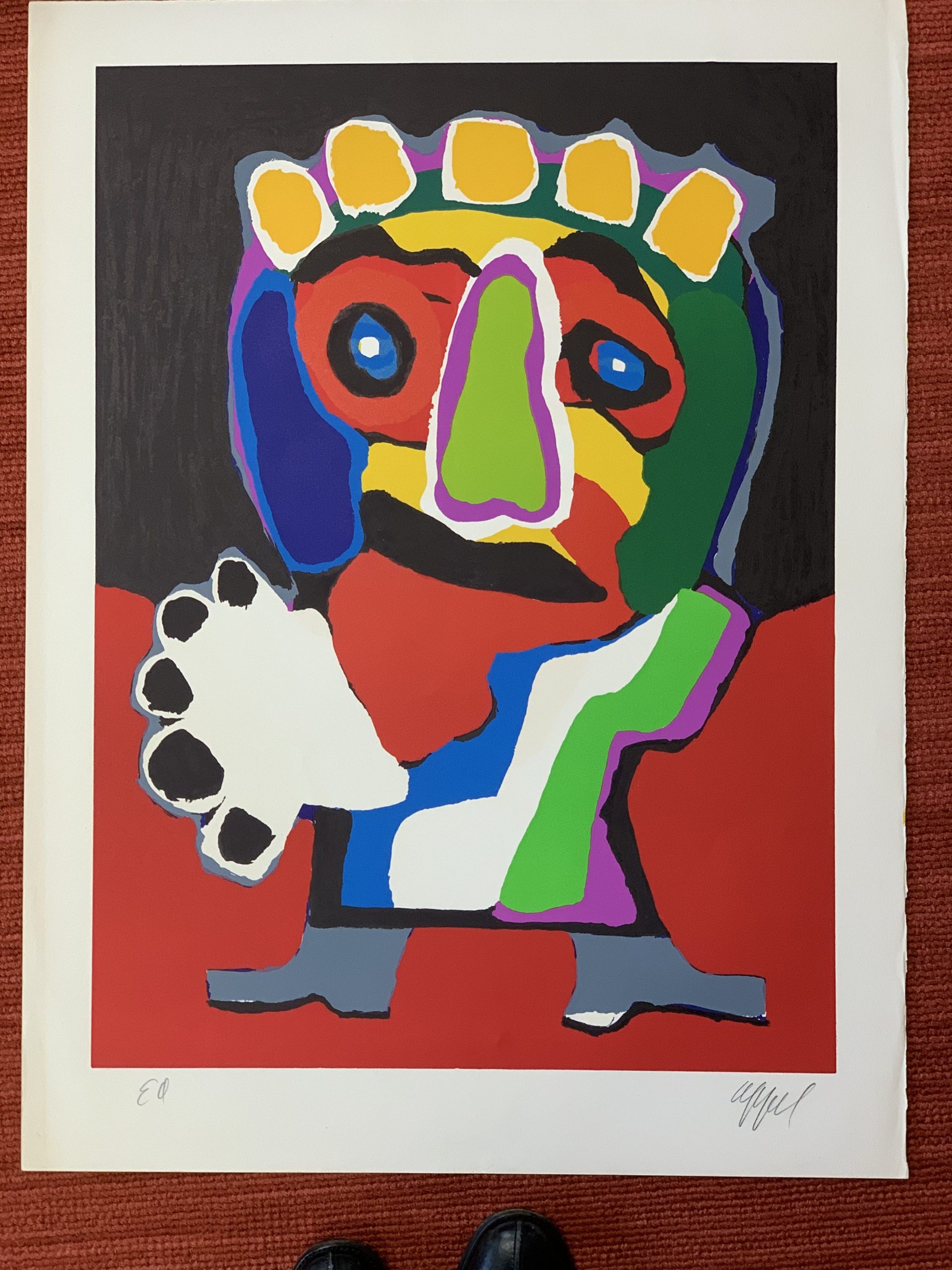 Karel Appel, a Dutch artist, was a co-founder of a group of artists known as “CoBrA”.  (The name was derived from “Copenhagen”, “Brussels”, “Amsterdam”).  CoBrA artists agreed that their work would focus on spontaneity and experiment.  Because of that, they intentionally drew inspiration from children’s drawings.  Thus, the childish nature of Appel’s work is not happenstance; it was very intentional, both because of the influence of childish thought and to express the spontaneity and experimentation of children’s art.
