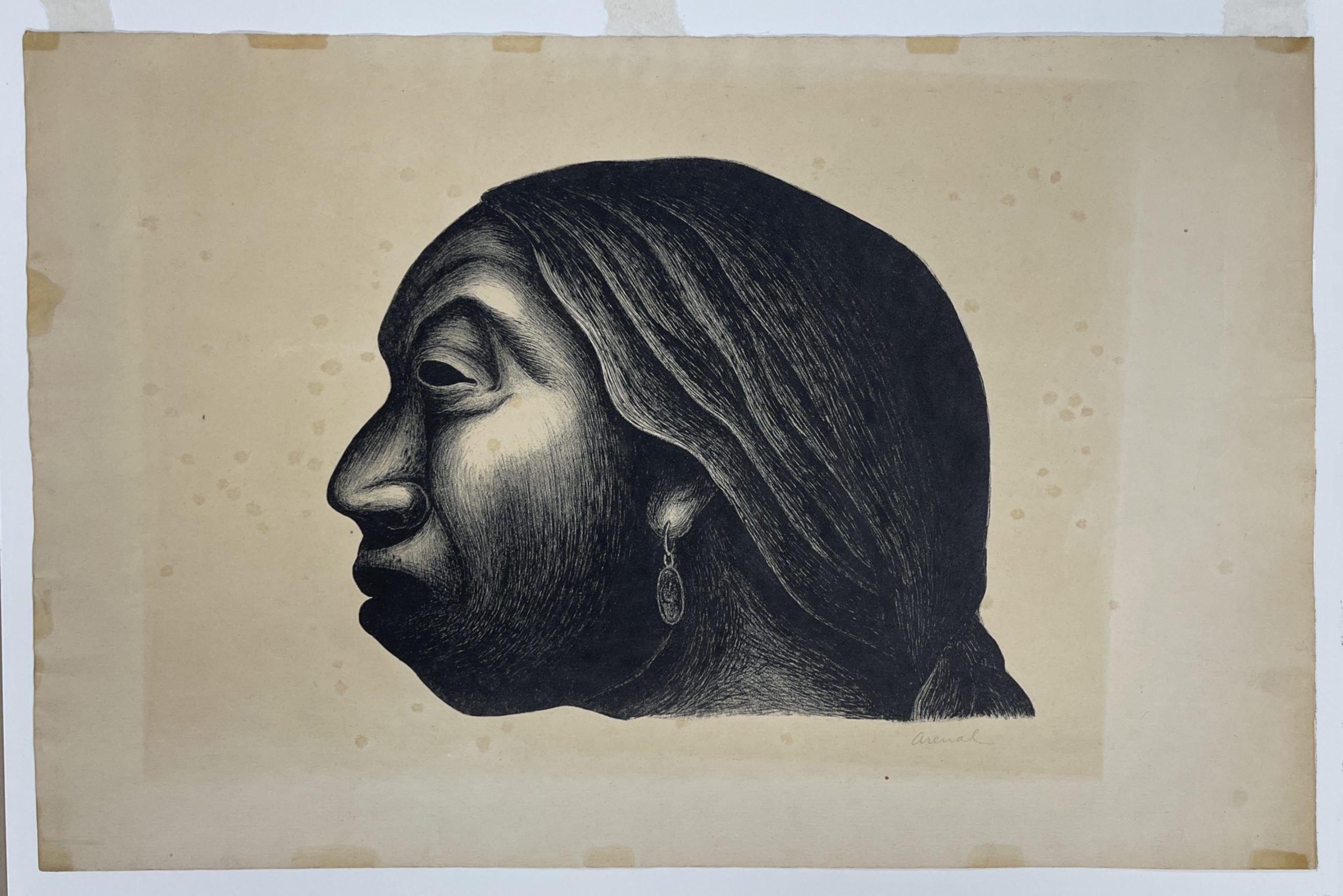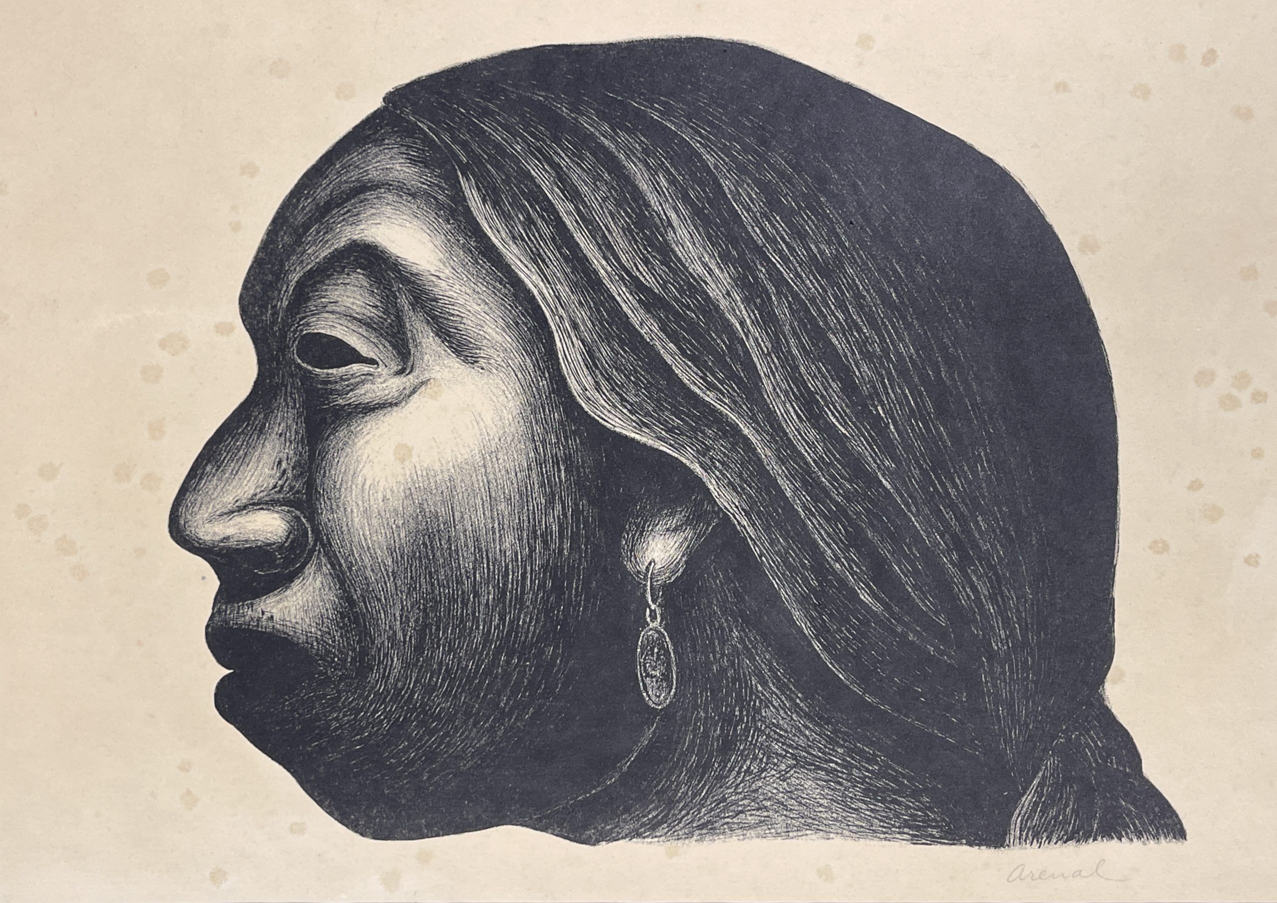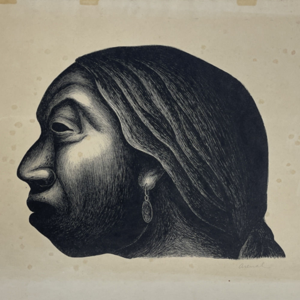 This work is probably Luis Arenal’s most iconic image. It has been identified as “Woman of Taxco” [Mujer de Taxco] and Head of an Indian Woman [Cabeza de Indigena], but it is most often referred to as “Head of a Woman” [Cabeza de Mujer].