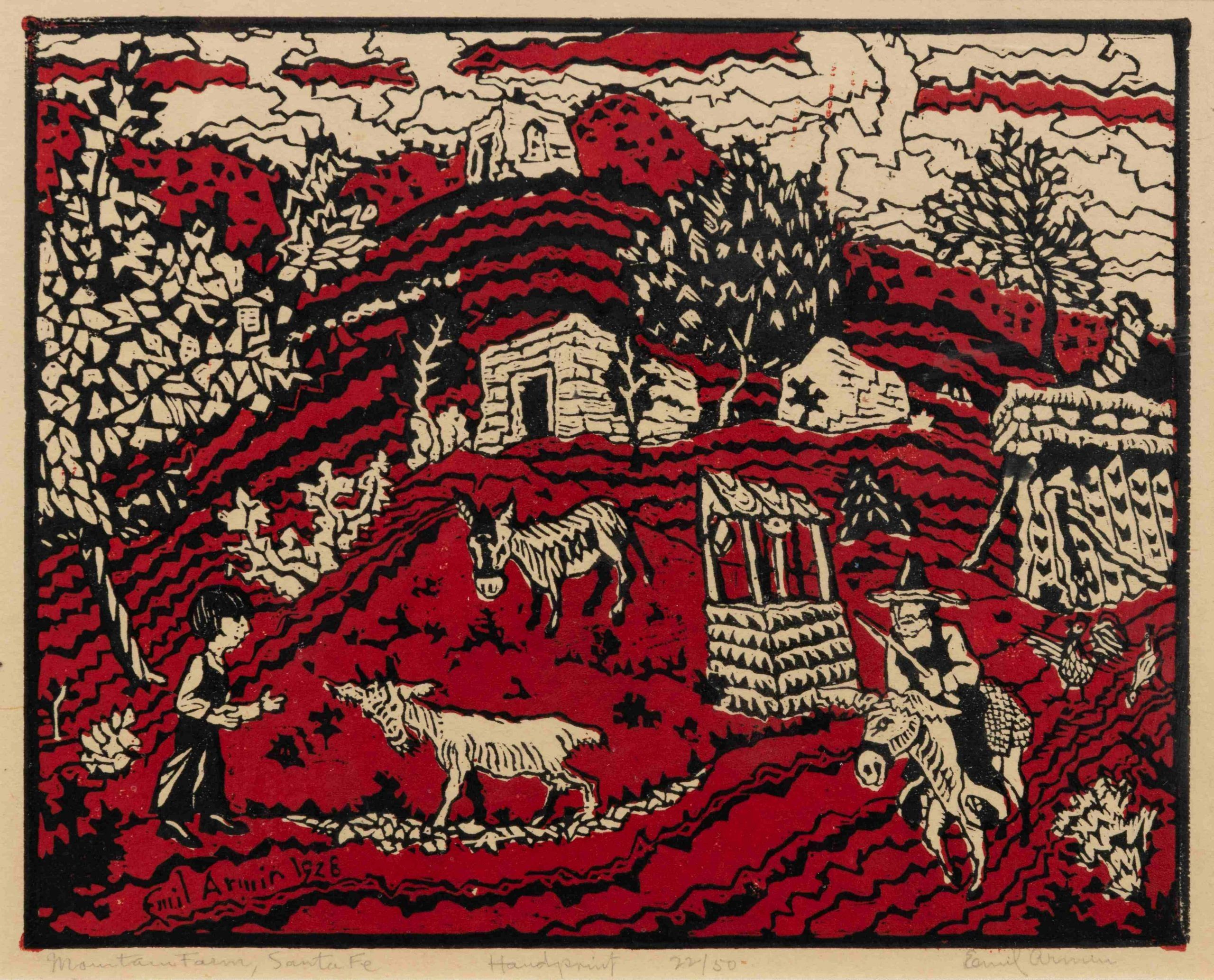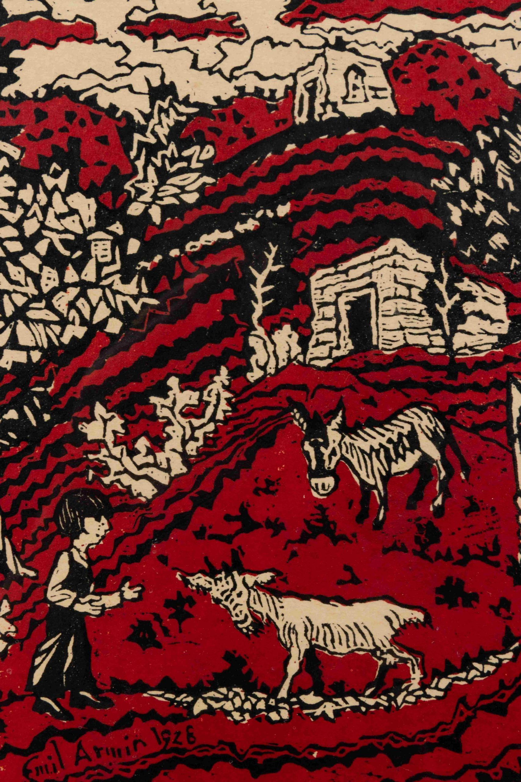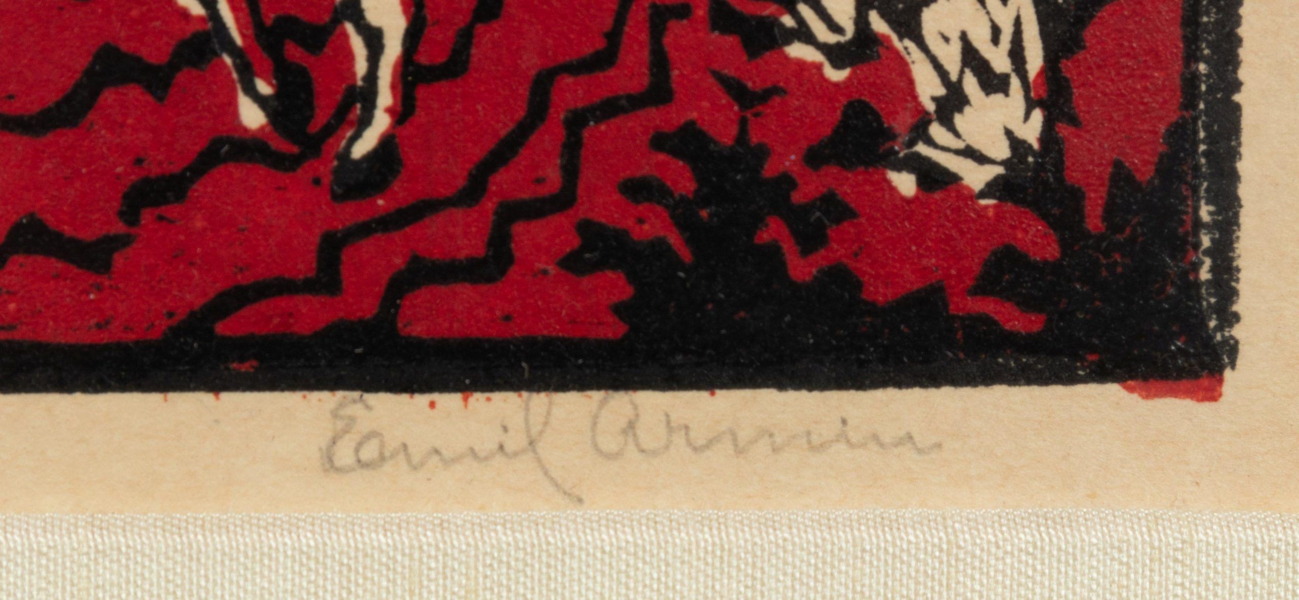A woodcut hand-printed by the artist himself, Emil Armin, in black and red, with deep, deep colors and gorgeous imagery. From the first printing of this important print.