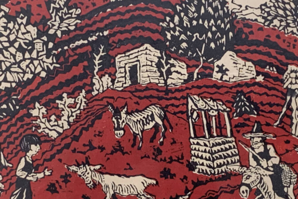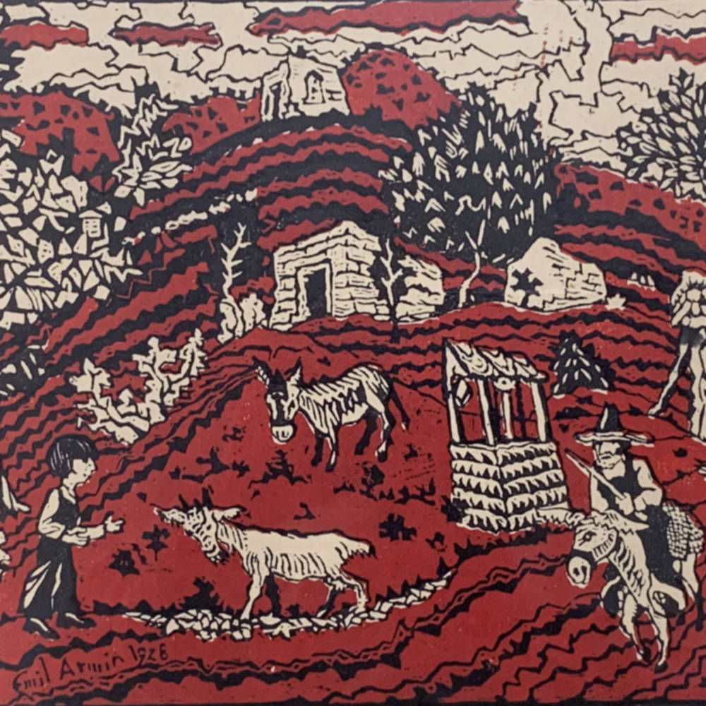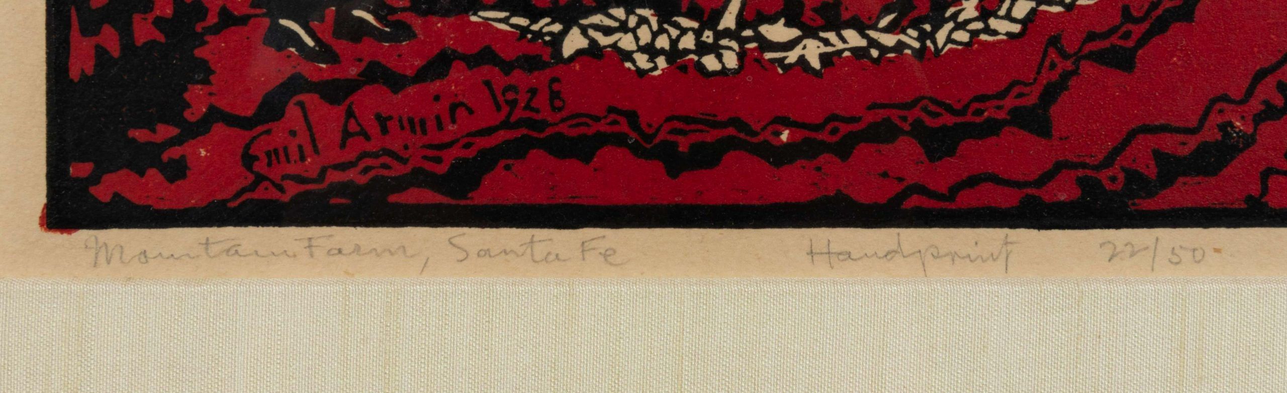 A woodcut hand-printed by the artist himself, Emil Armin, in black and red, with deep, deep colors and gorgeous imagery. From the first printing of this important print.