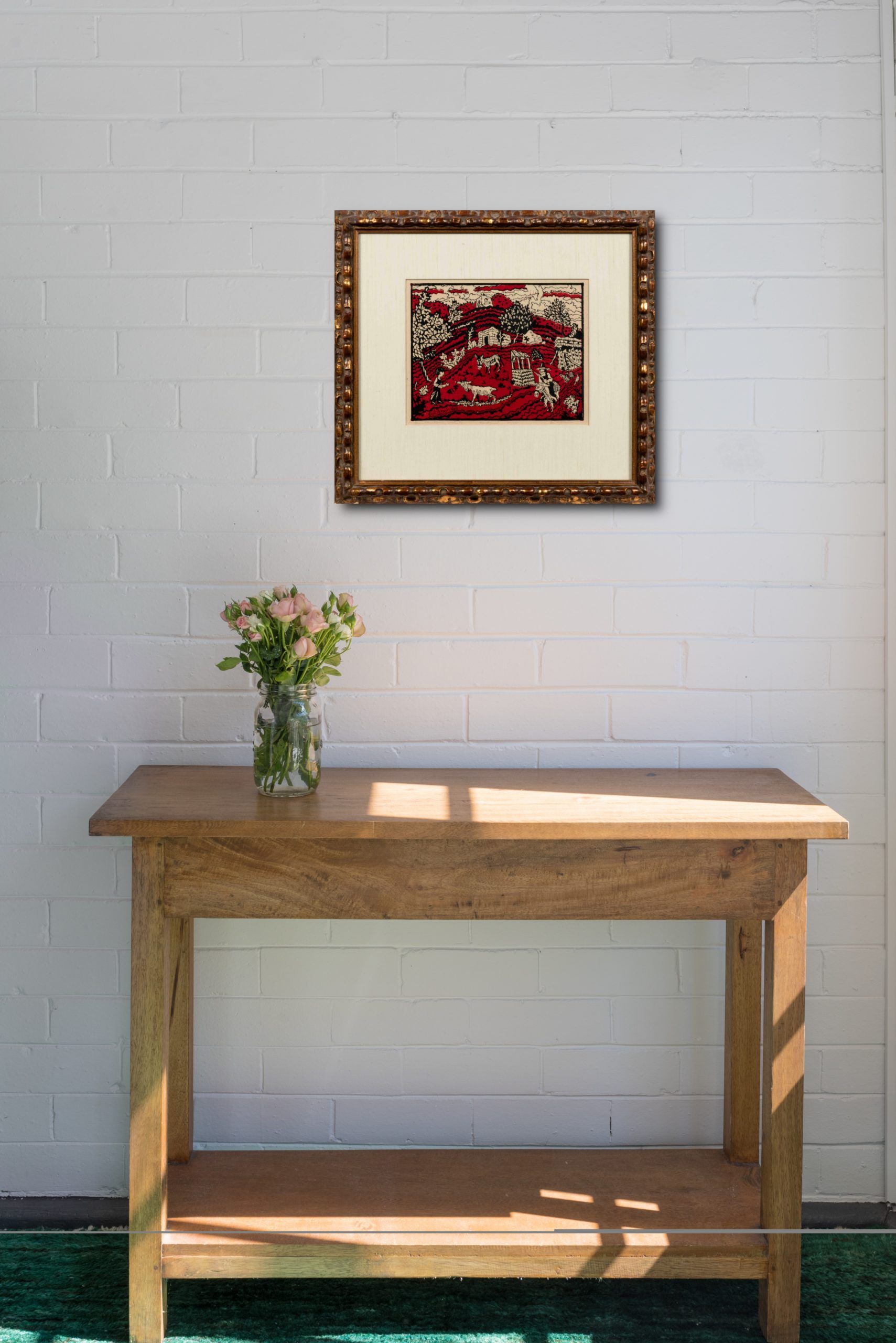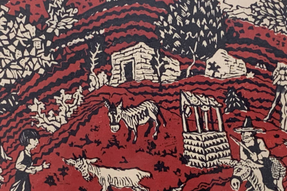 Woodcut print in black and red hand-printed by the artist