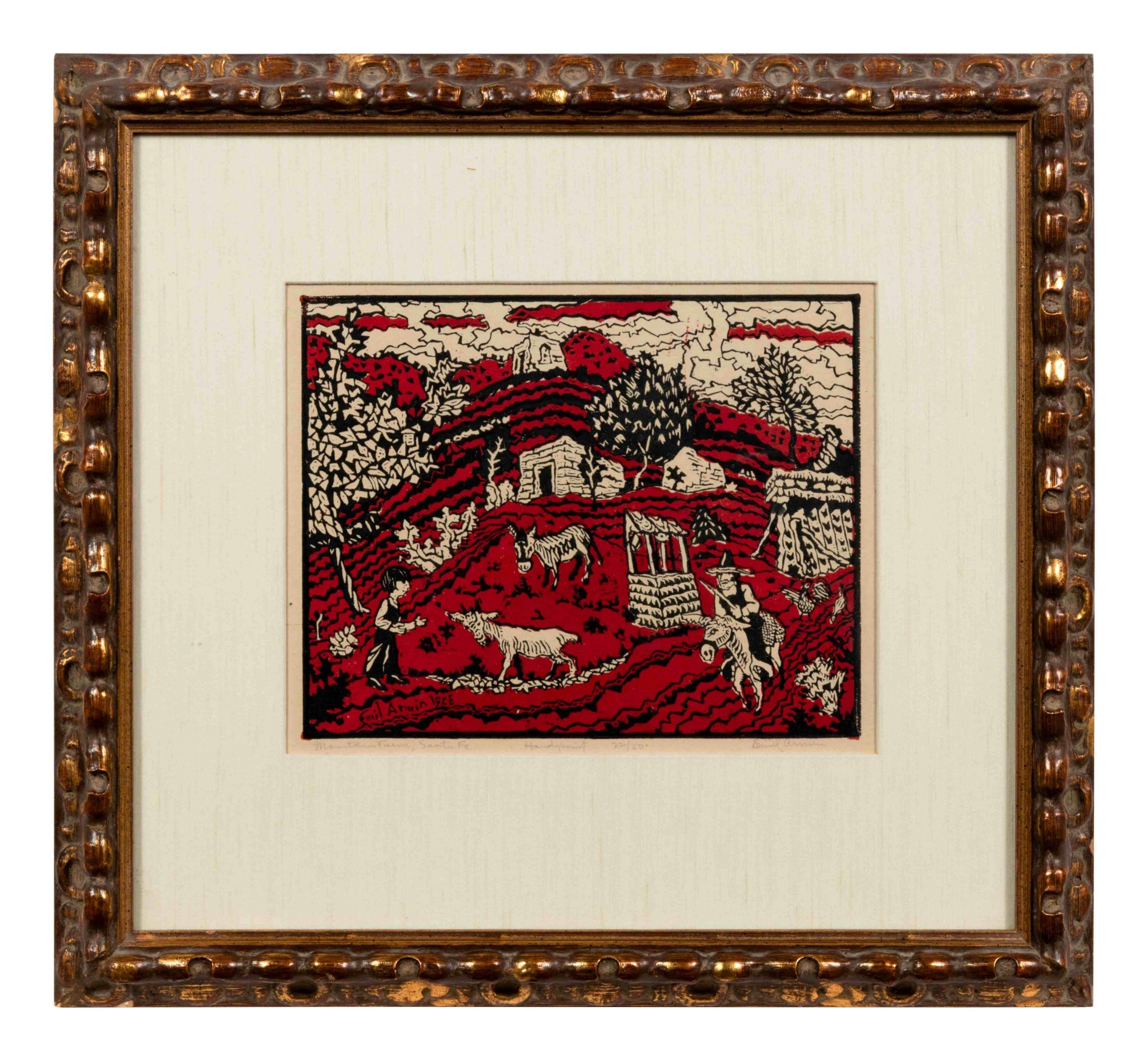 Created on Emil Armin’s first and very brief visit to Santa Fe in 1928. As Z.J. Jacobson discussed in his book about Armin, this trip was Emil Armin’s first trip to the West, where “he received a cheery welcome from old acquaintances in Santa Fe, and at a party given by Mr. and Mrs. Datus E. Meyers, he met most of the artists of the local colony.” Having little money and very little time to waste, Armin set about creating art. He returned to Chicago with “more than twenty pieces”, including this one.