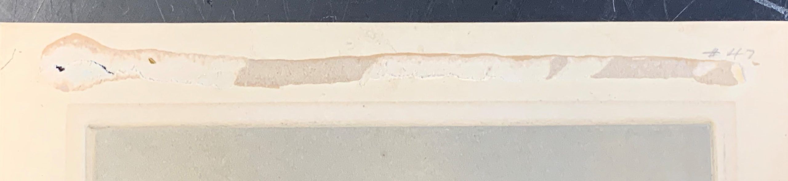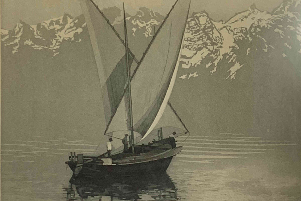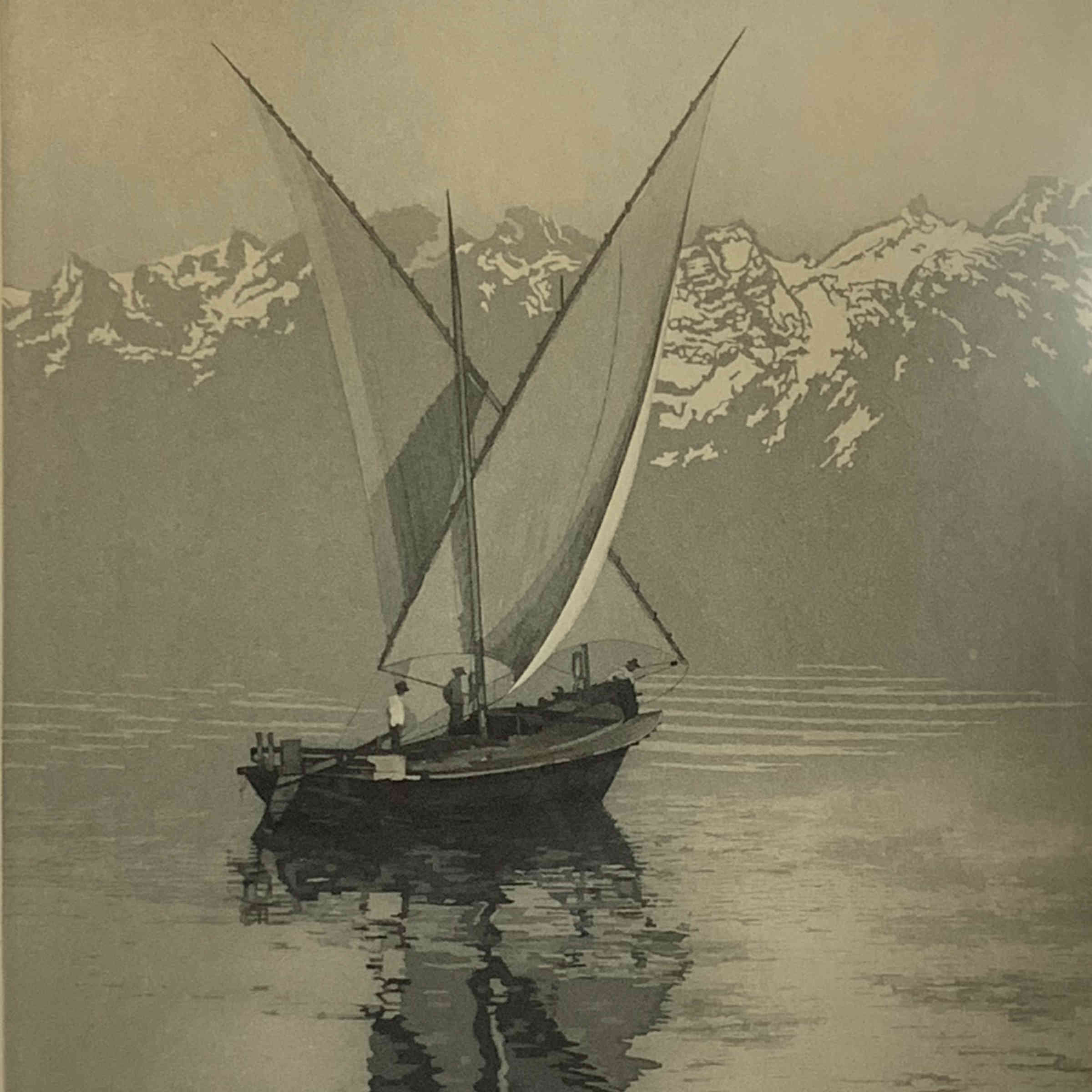 In 1919 and 1920, Arms had executed a group of prints of sailboats on calm waters with mountainous backgrounds. He used aquatint to achieve large wash-like areas. In this beautiful and refined work, line is minimal, only delineating the sailboat while subtly-graduated planes of tone suggest distance and atmosphere. Printed in color, the snow-covered peaks and shimmering waters are described with an exquisite delicacy.