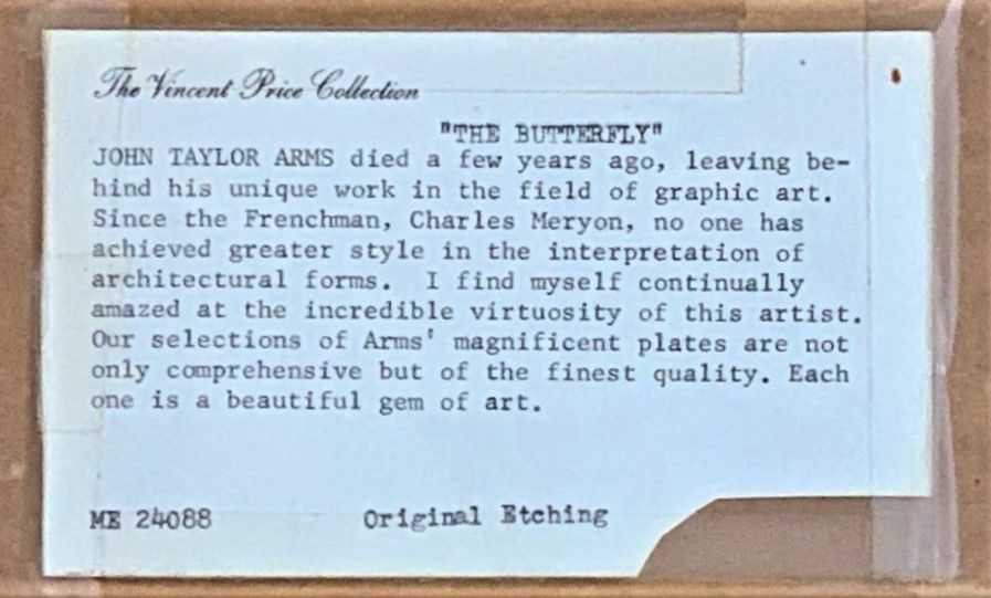 Included in the Vincent Price collection were works by John Taylor Arms, whom Price particularly esteemed. As Price wrote on a card on the verso, “I find myself continually amazed at the incredible virtuosity of this artist.” Arms’ etchings were wondrous creations, produced with sometimes 1,000 or more hours’ work using fine-gauge sewing needles set into wooden handles and viewed through magnifying glasses. He was a gifted draftsman and technical virtuoso who created compositions full of keenly observed details and nuanced light. Arms is regarded as one of the world’s finest print-maker for good reason. A 1952 article in the New York Times described Arms as “the dean of American print makers”.