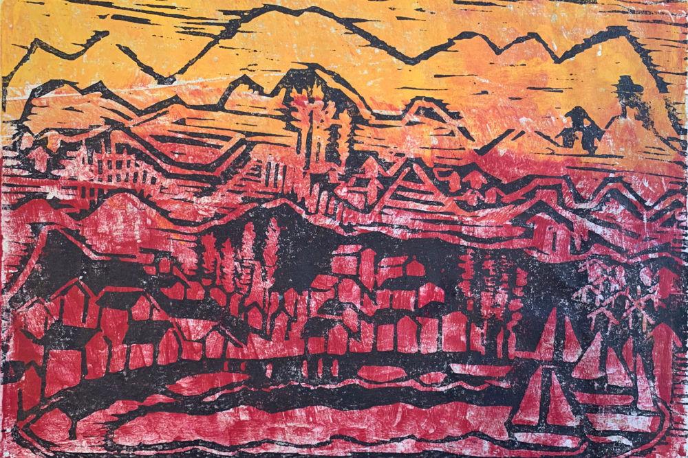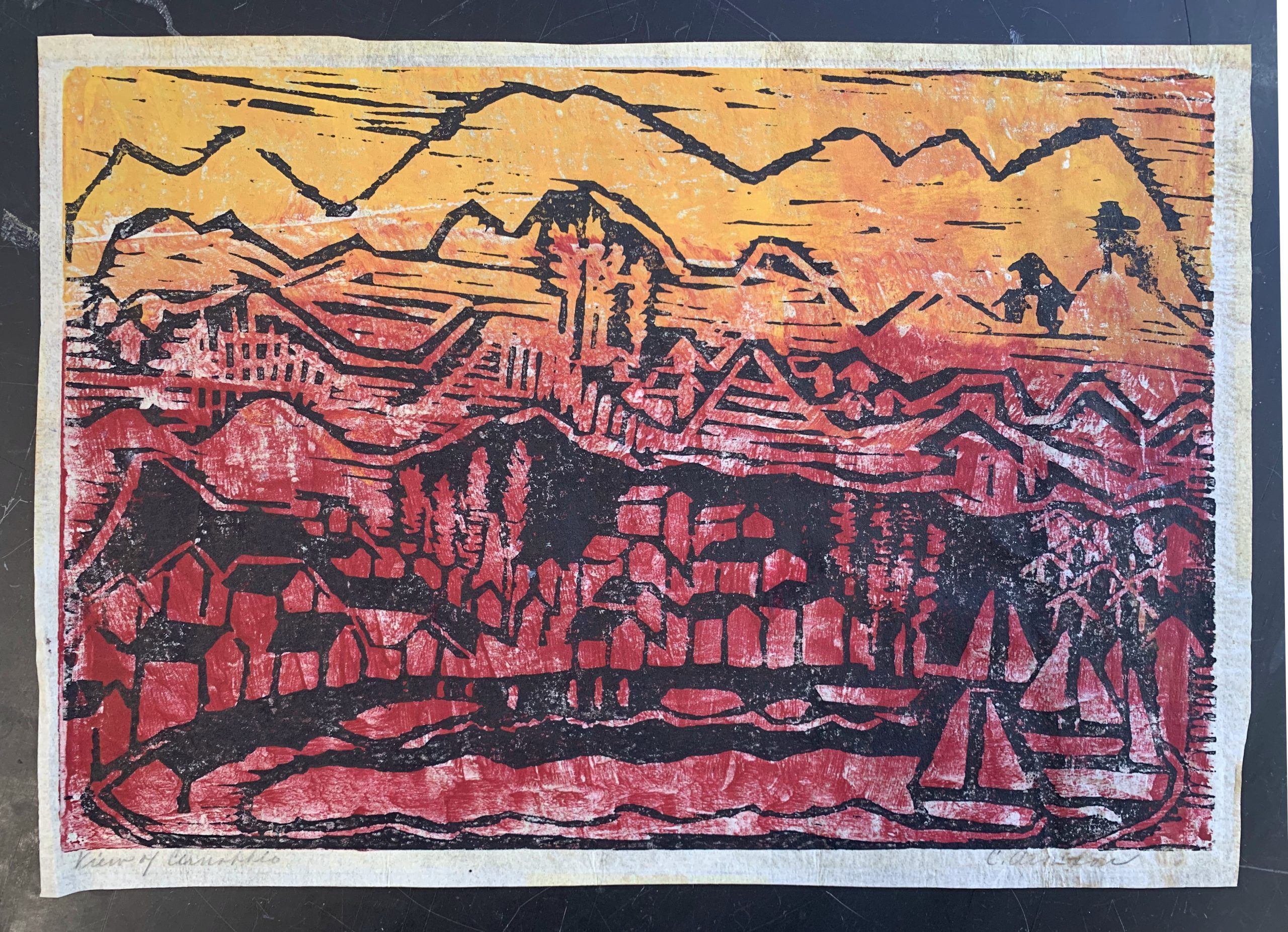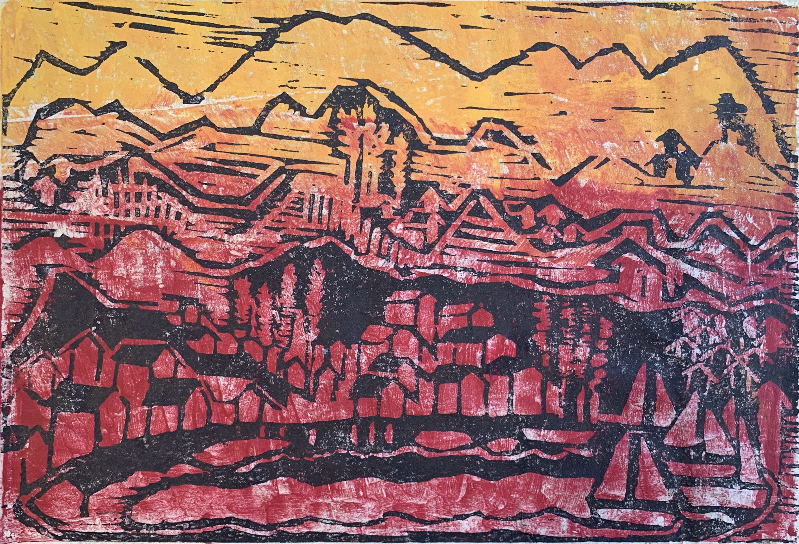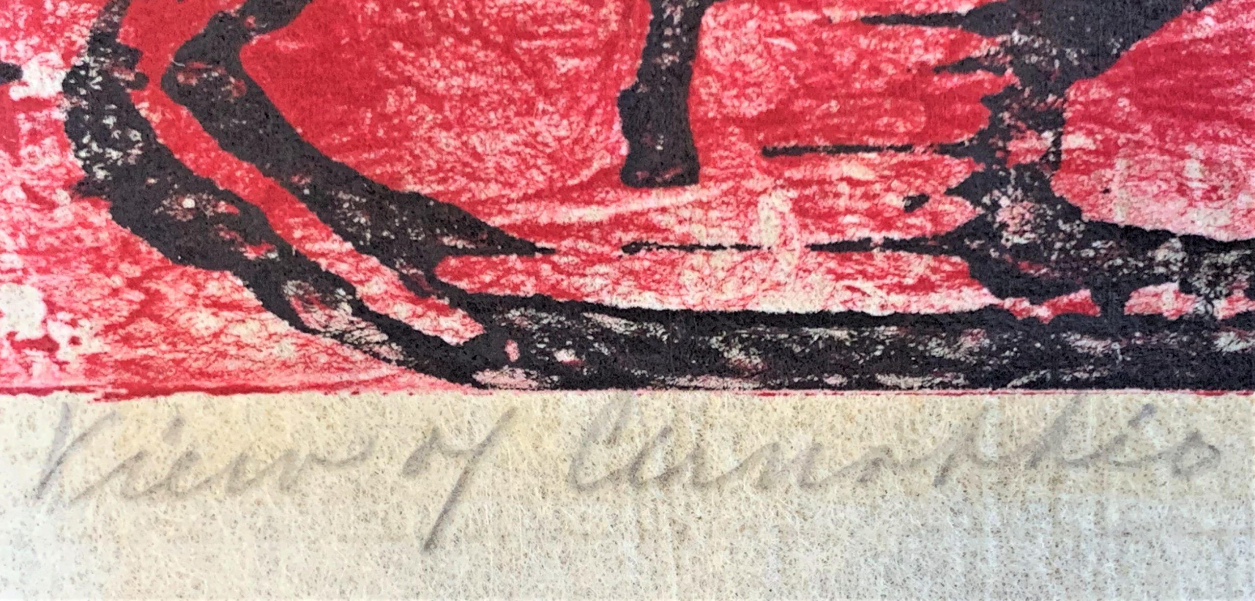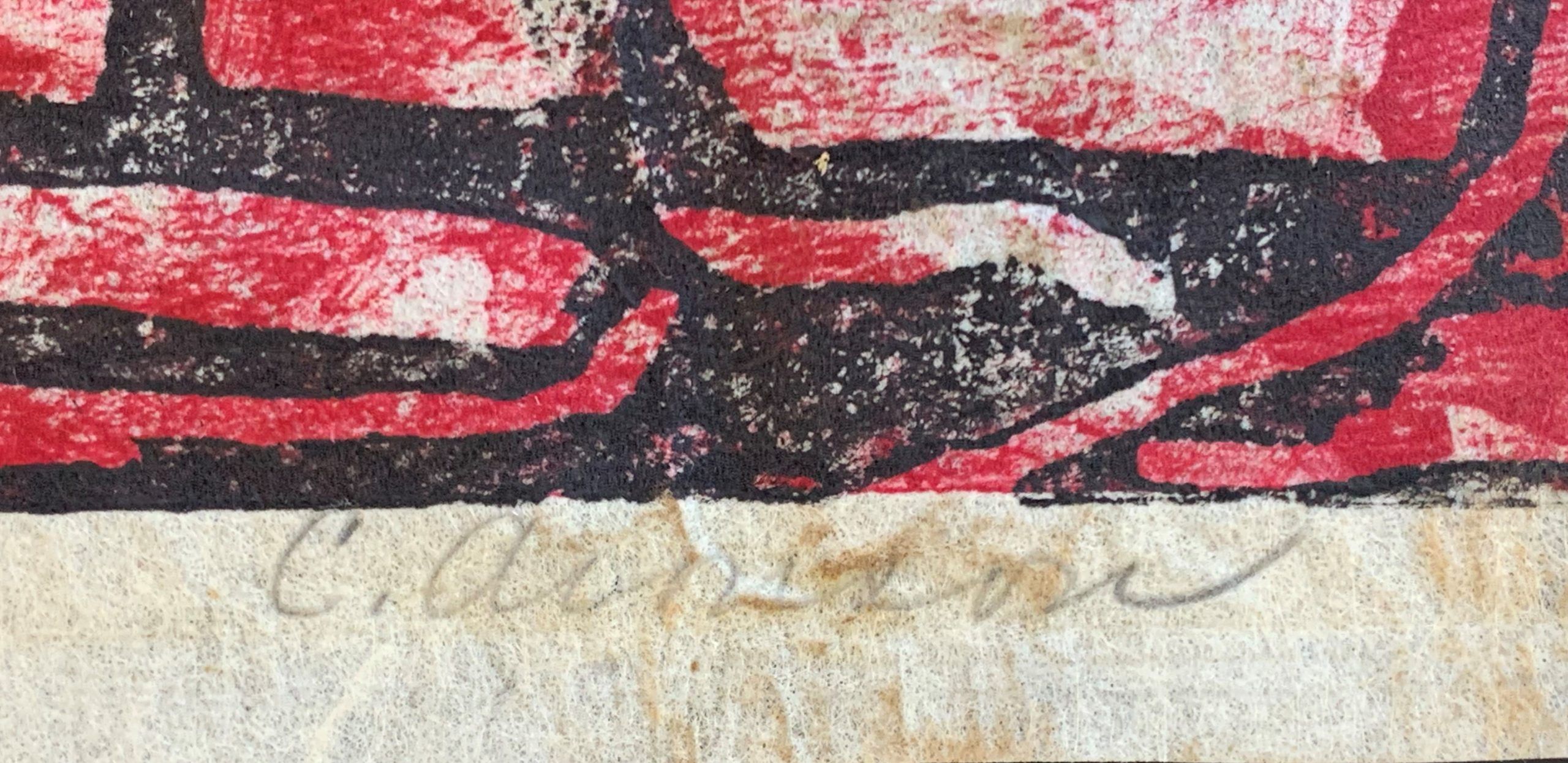 A woodblock print in three colors on black felt paper.  An early print by the accomplished painter Connie Aronson.  This work foreshadows the painter’s use of strong and vibrant colors which will predominate in her later paintings.