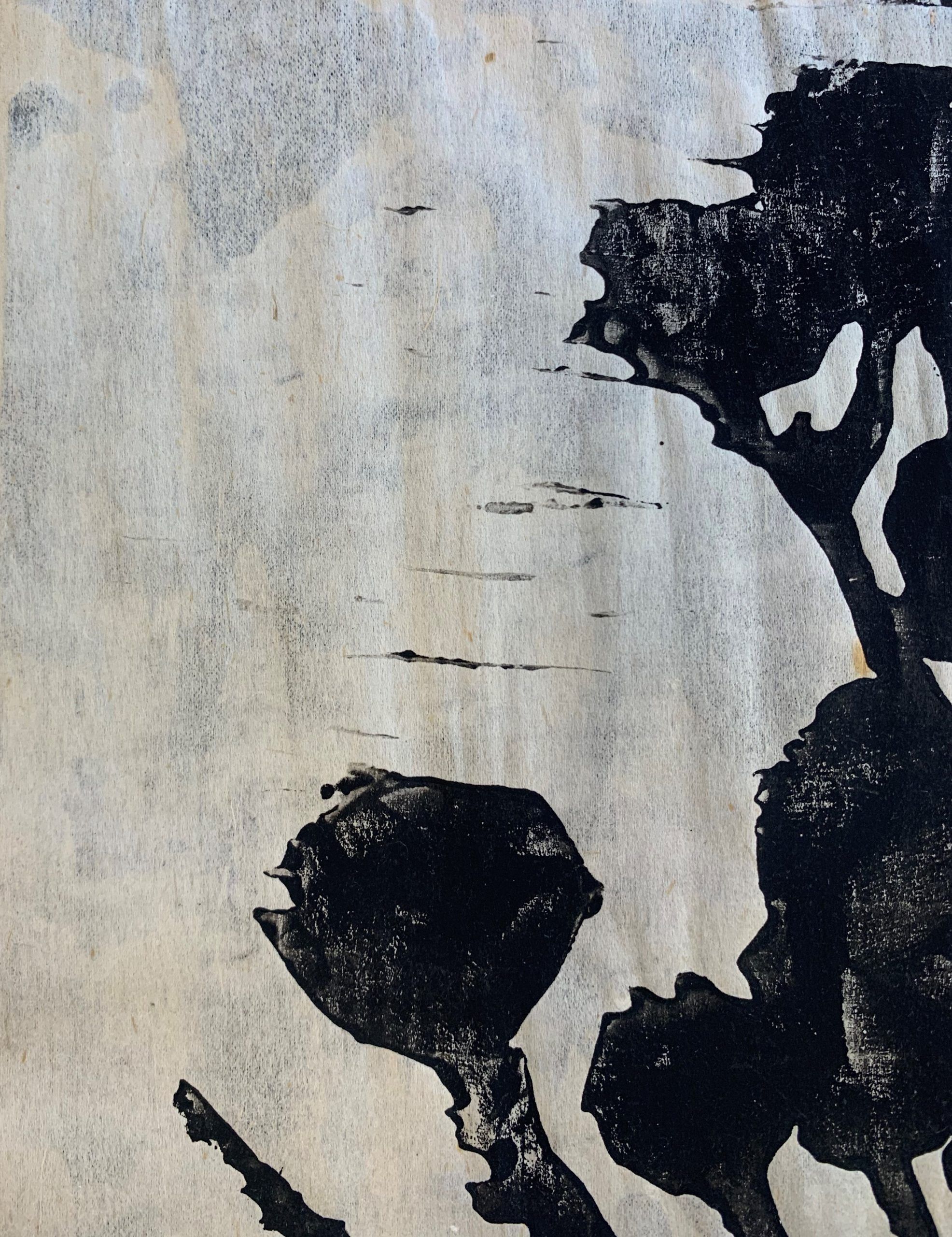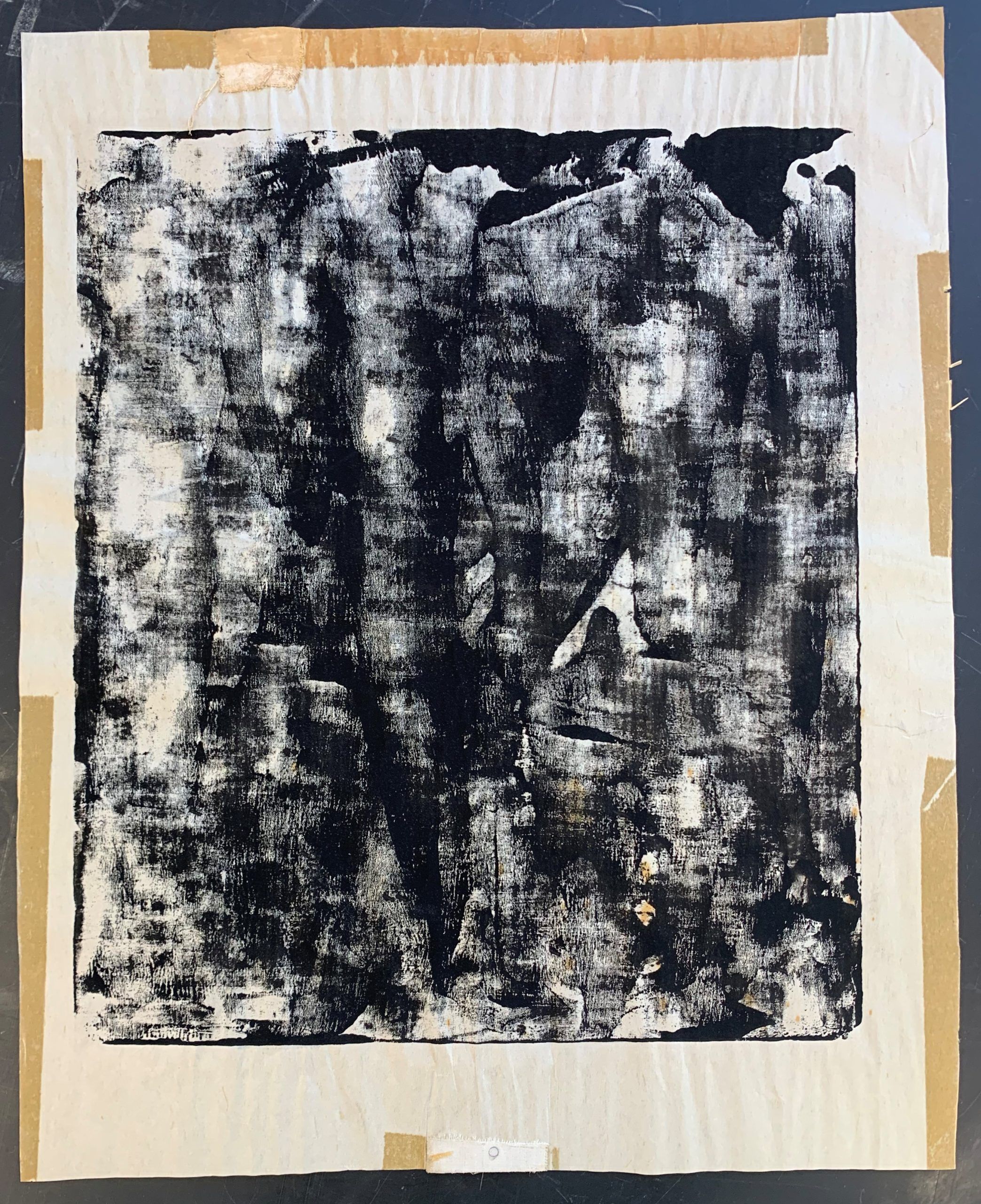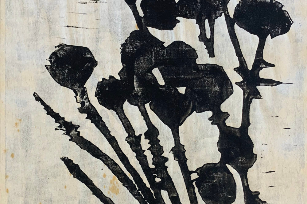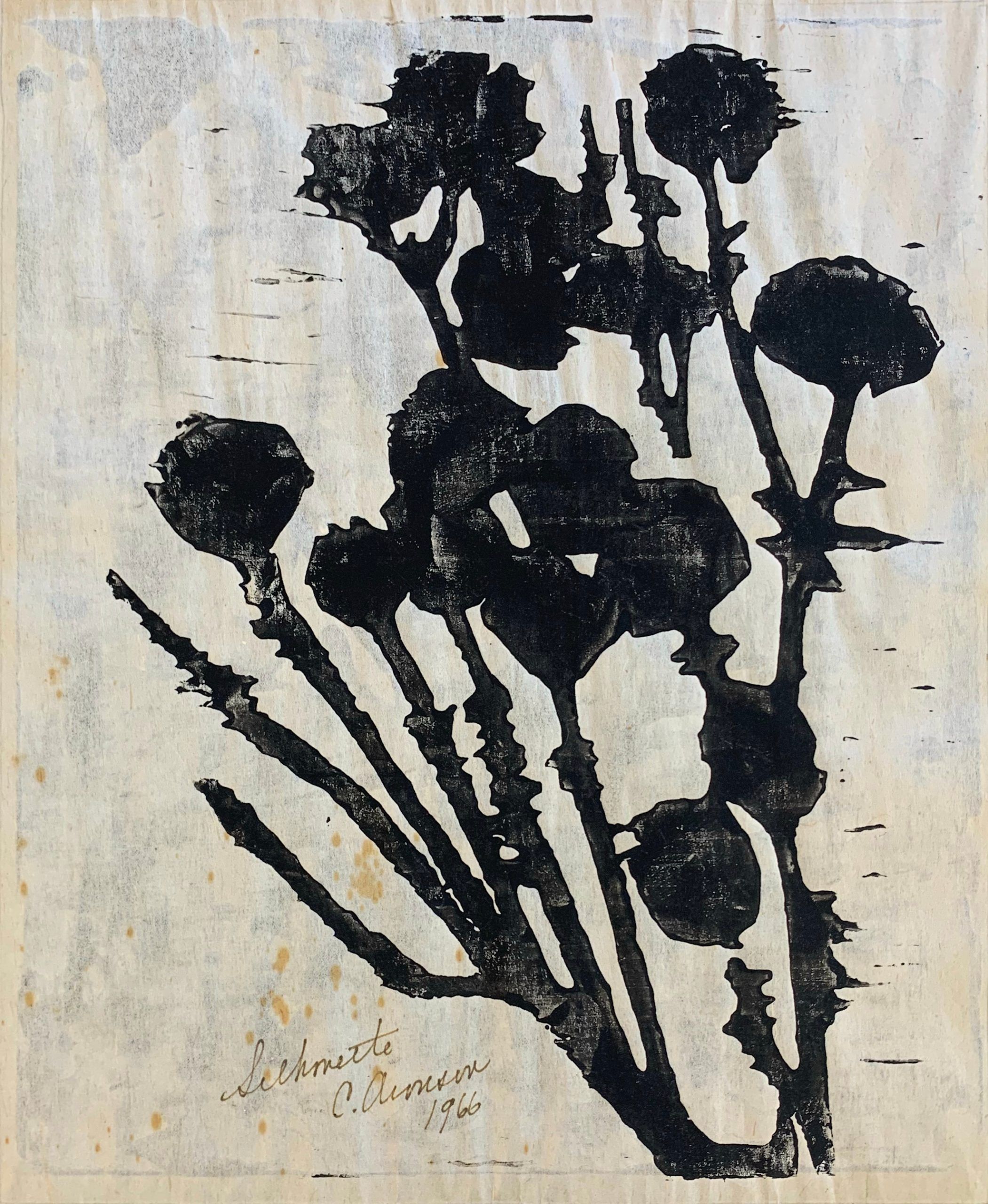 An early woodblock print in black on vellum by the accomplished painter Connie Aronson.  This work uses an innovative method of lightly painting the verso to add to the depth of the image on front.