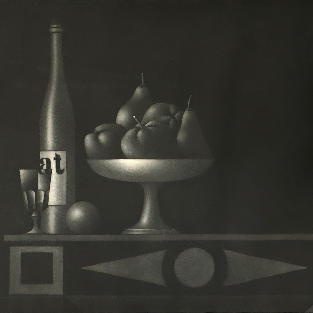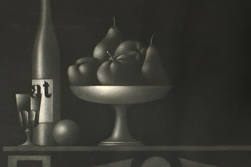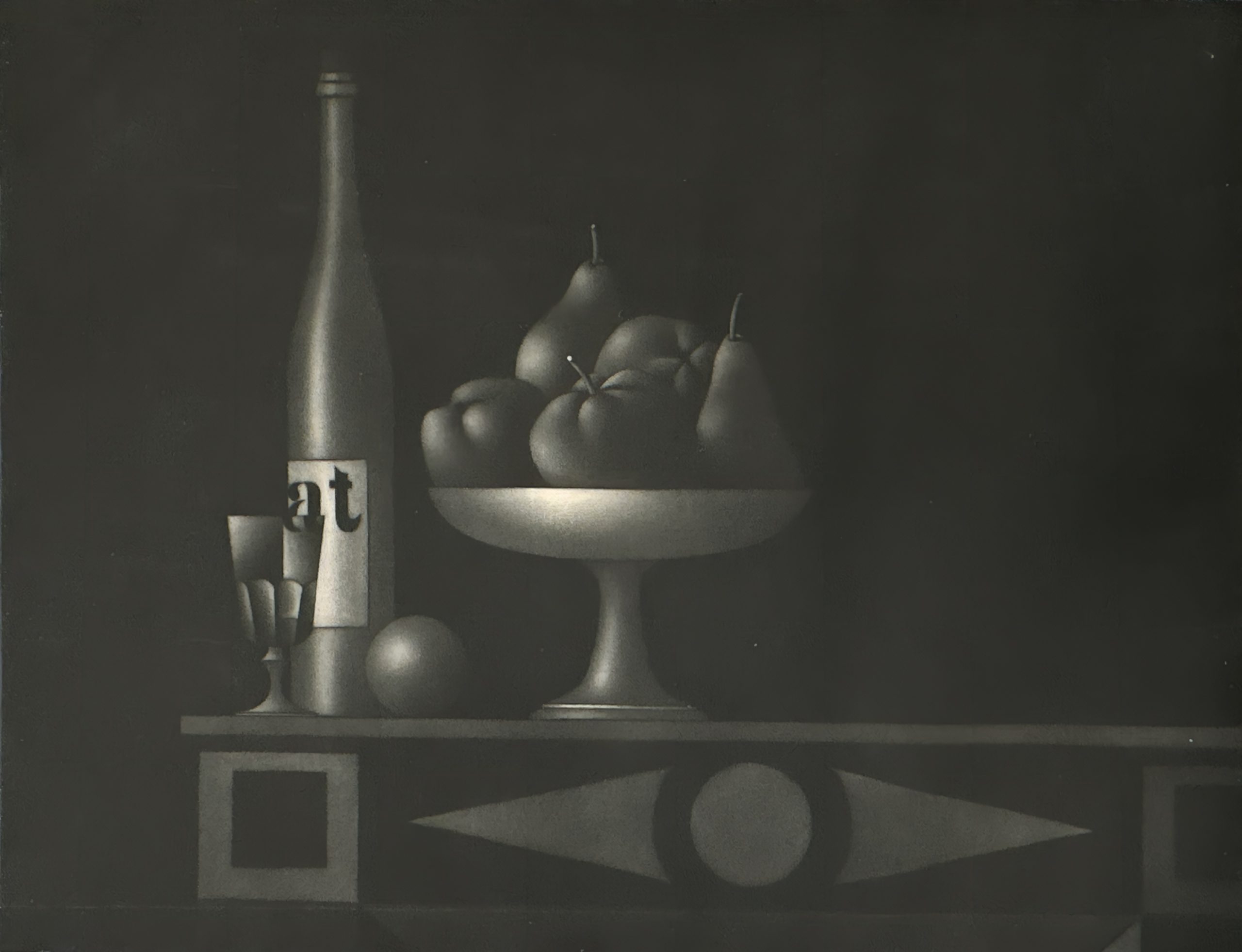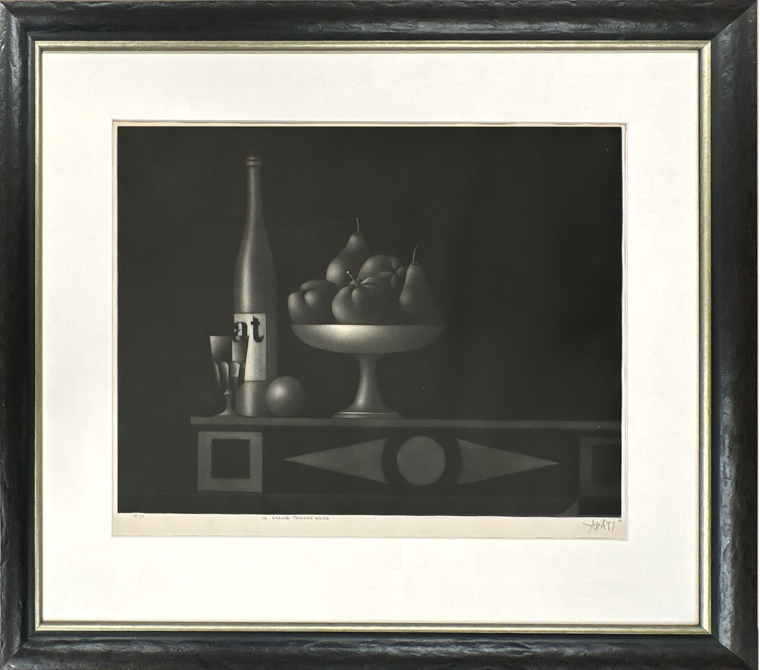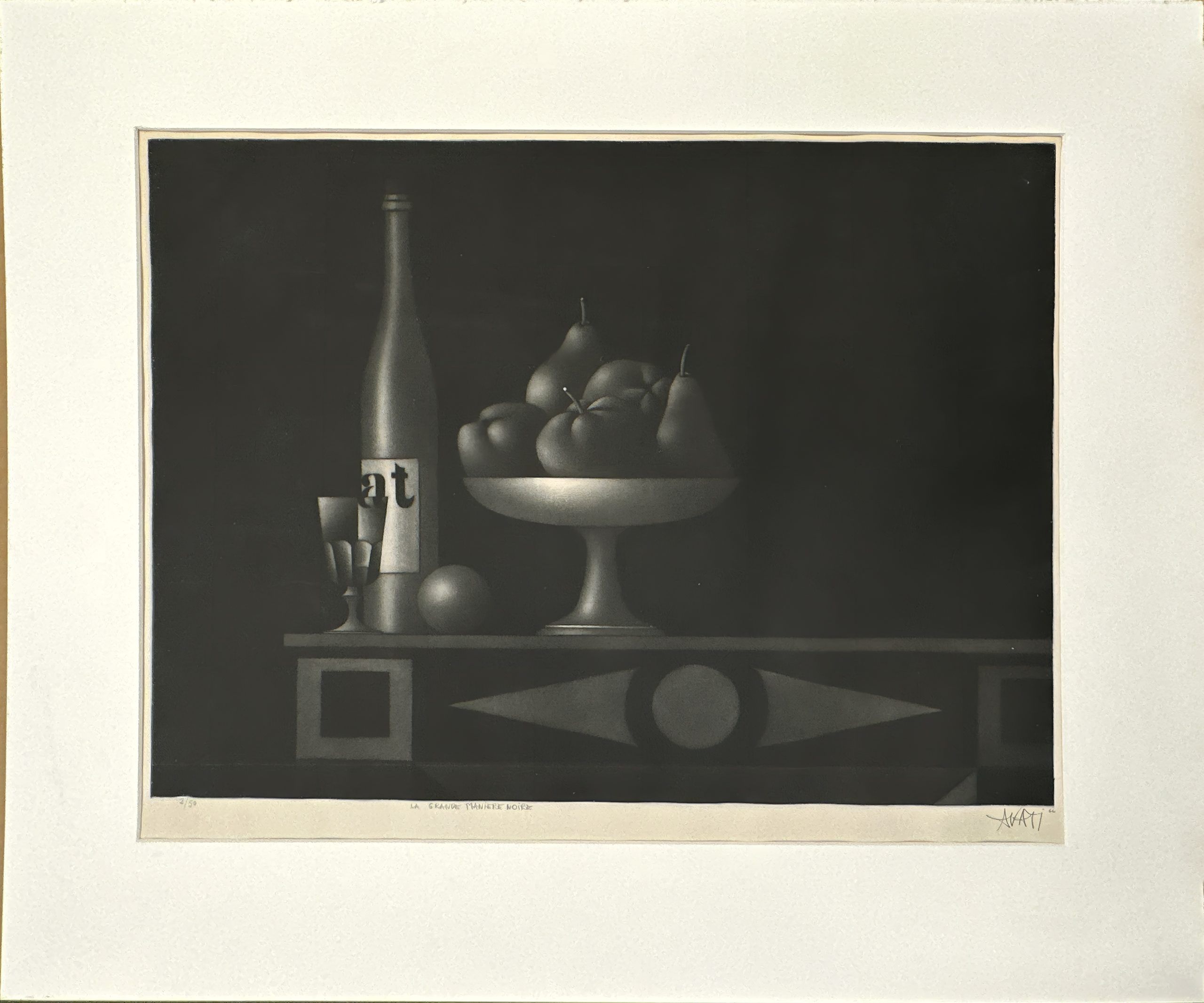 A beautiful mezzotint of a still life (wine bottle, a goblet and a fruit basket) by Mario Avati, one of the greatest masters of mezzotint.
