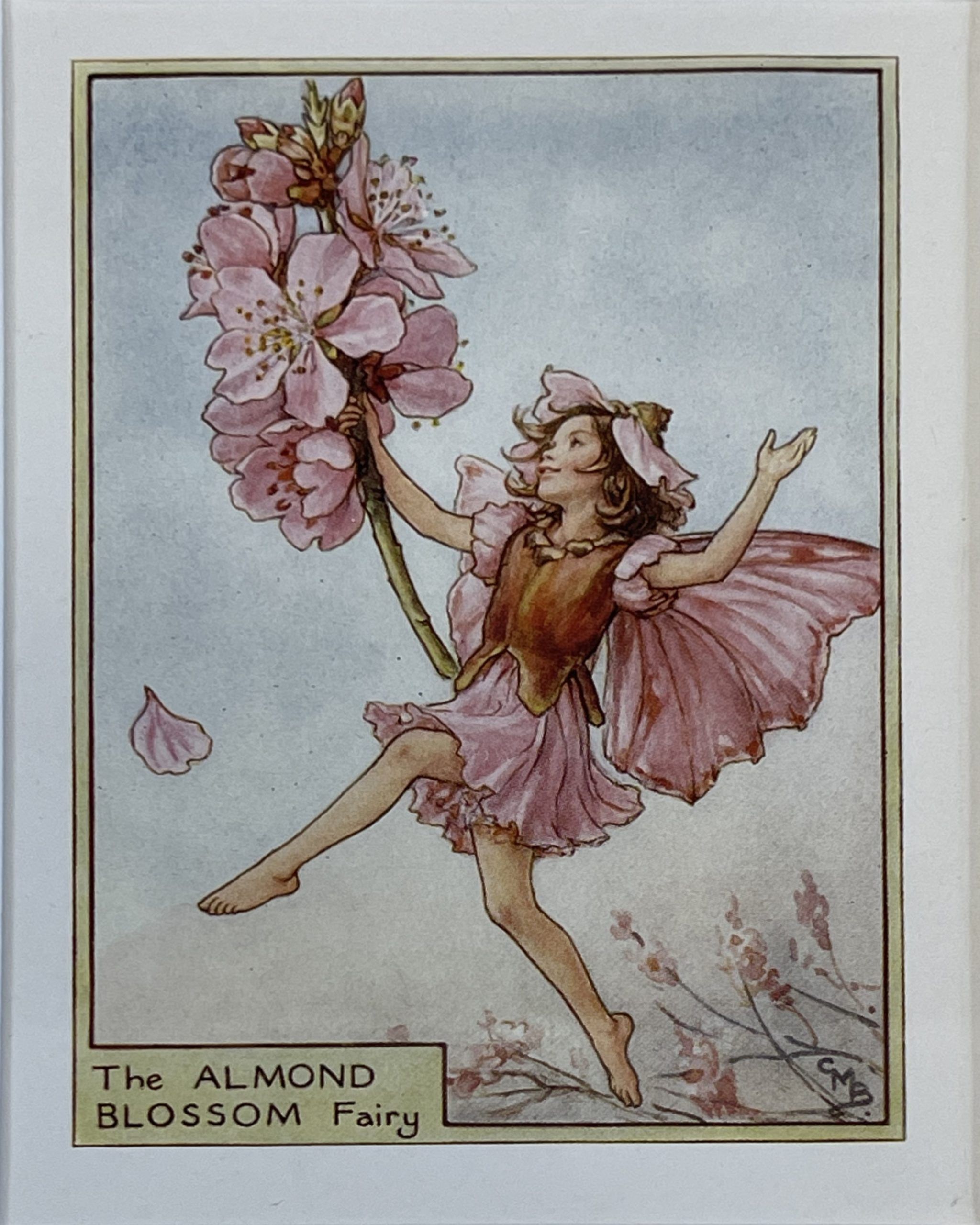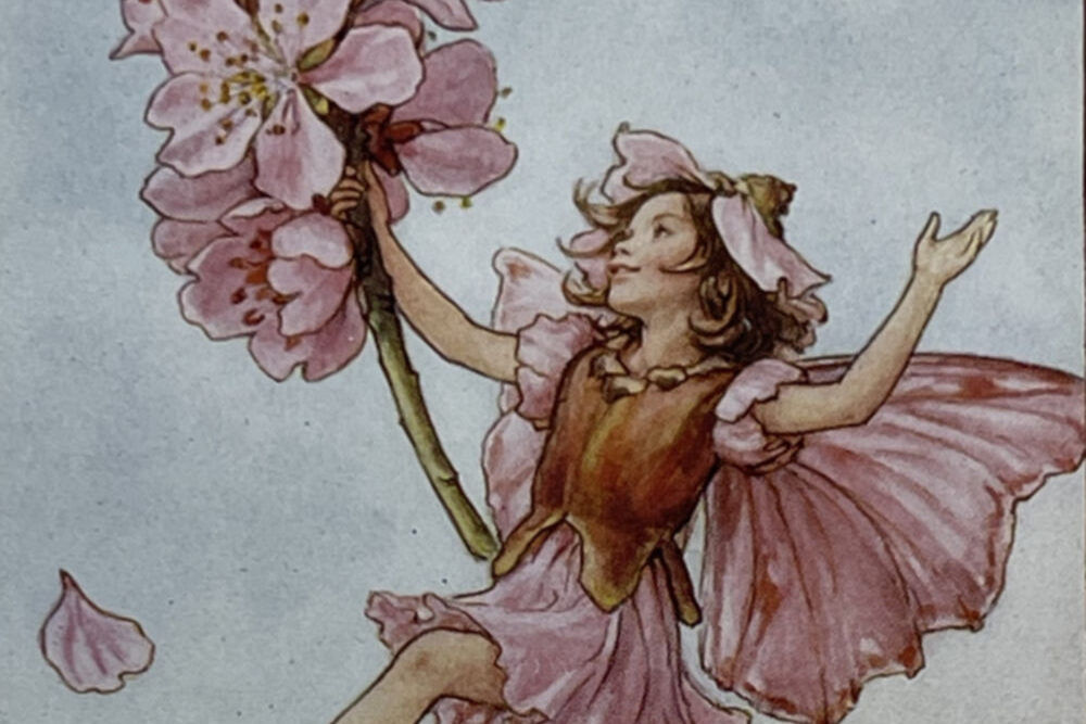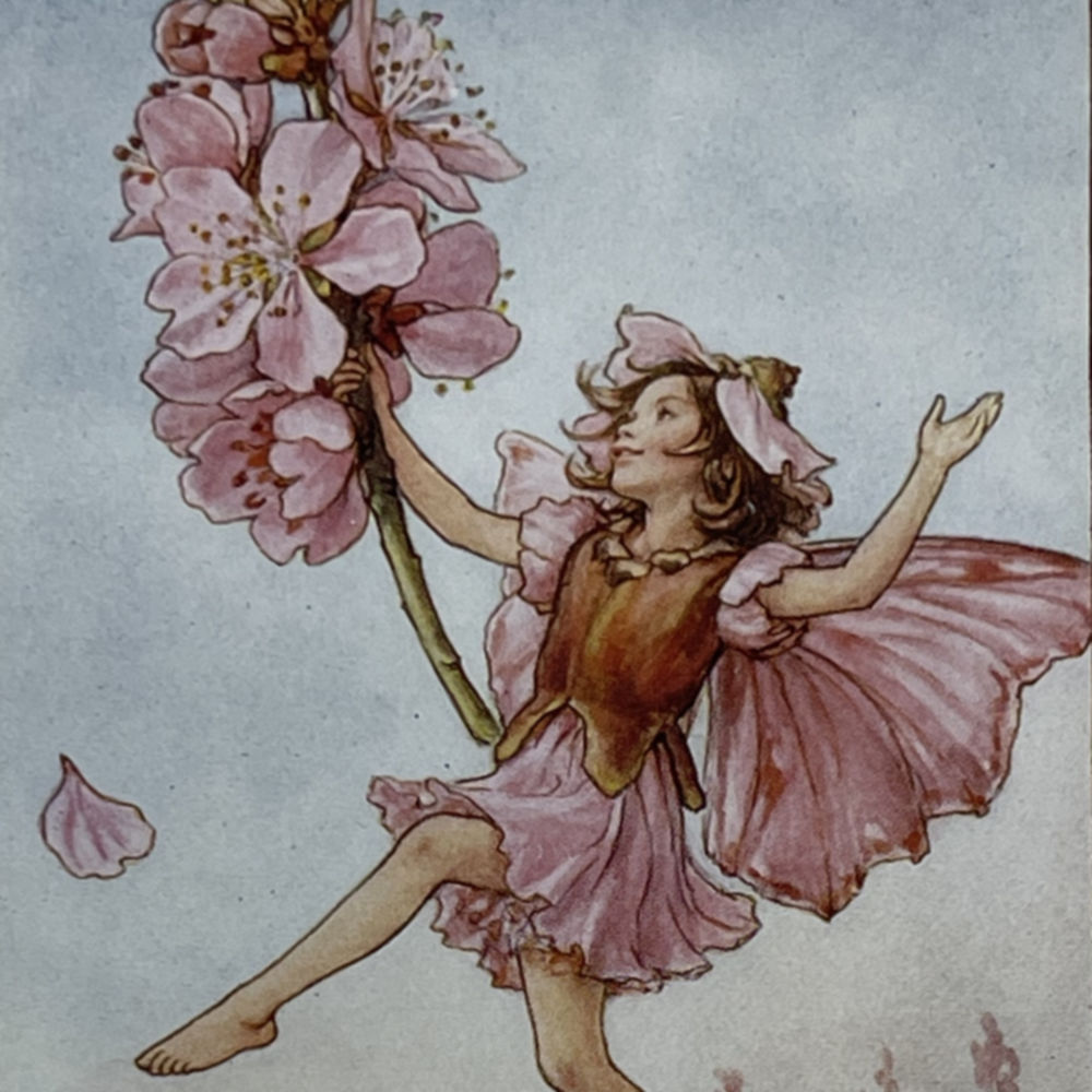 Cecily Mary Barker’s charming illustration of the elusive Almond Tree Fairy, who flits among the blossoms and helps to keep the tree happy, rarely seen but essential to the health of the tree.