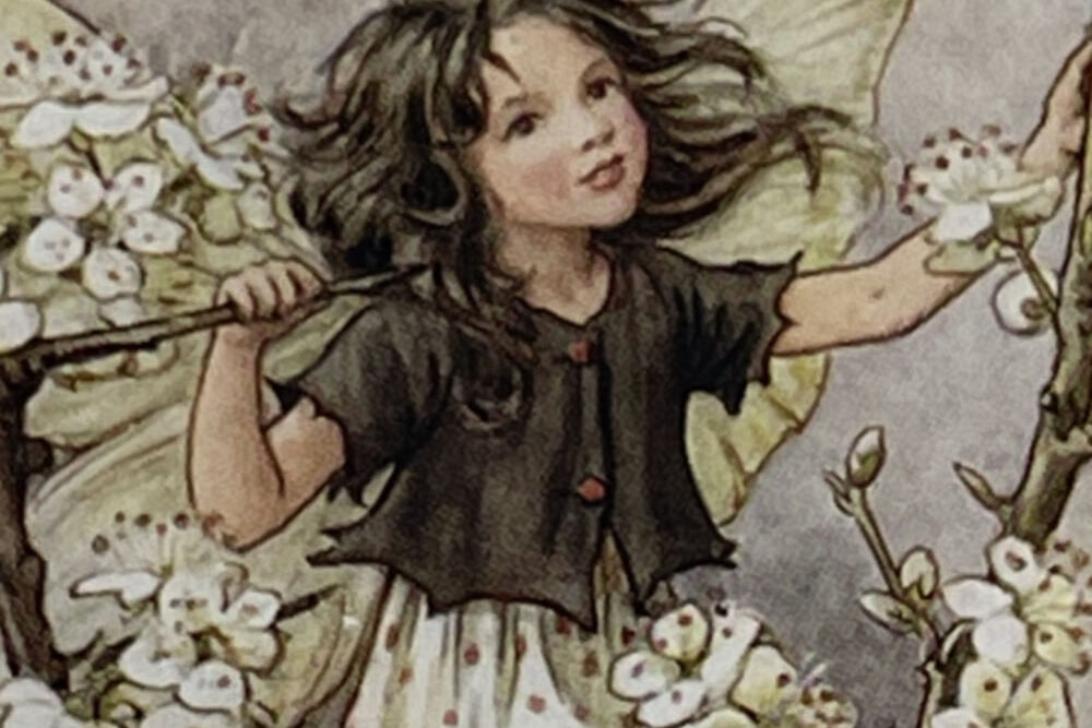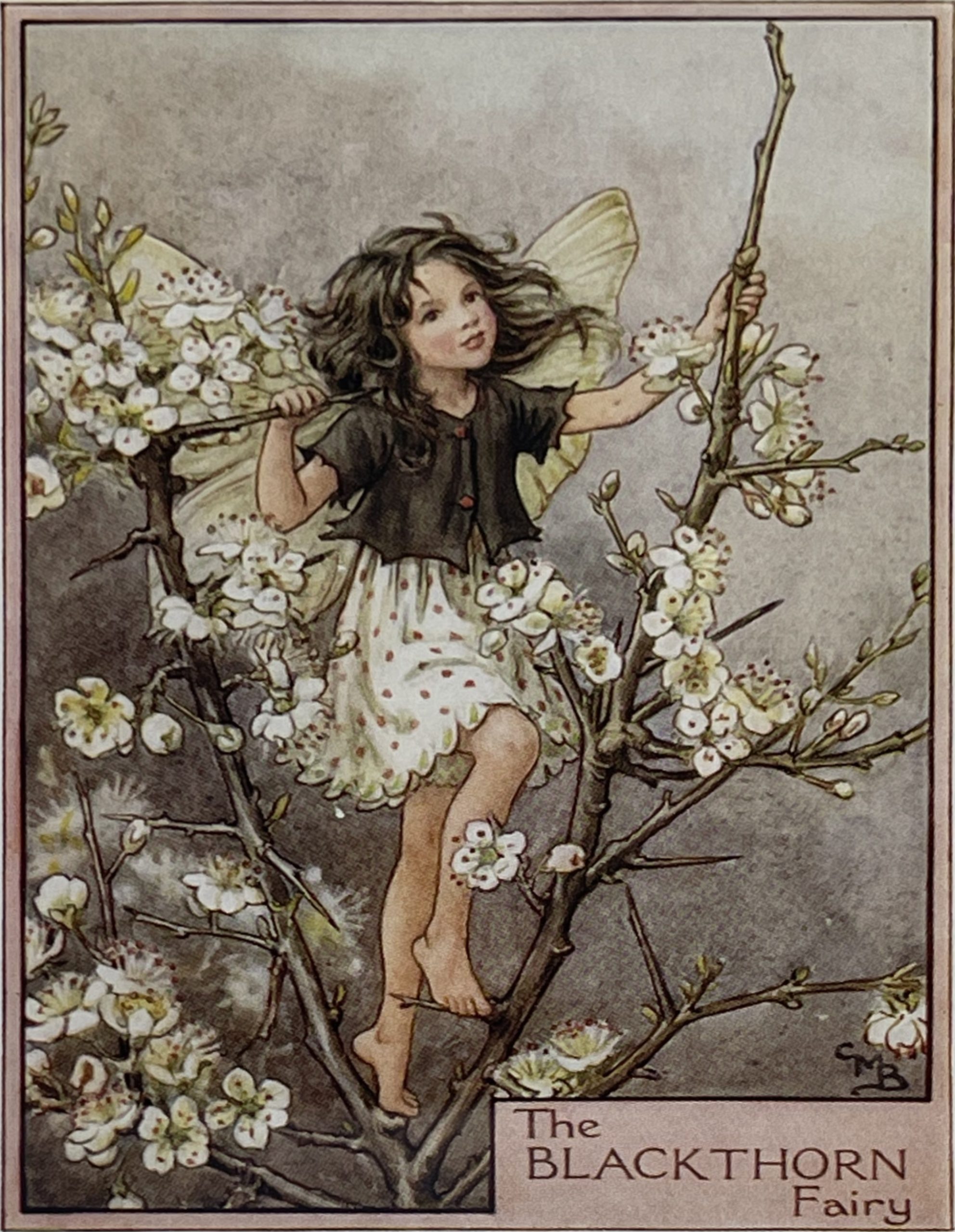 Cecily Mary Barker’s charming illustration of the elusive Blackthorn Fairy, who flits among the blossoms and helps to keep the tree happy, rarely seen but essential to the health of the tree.