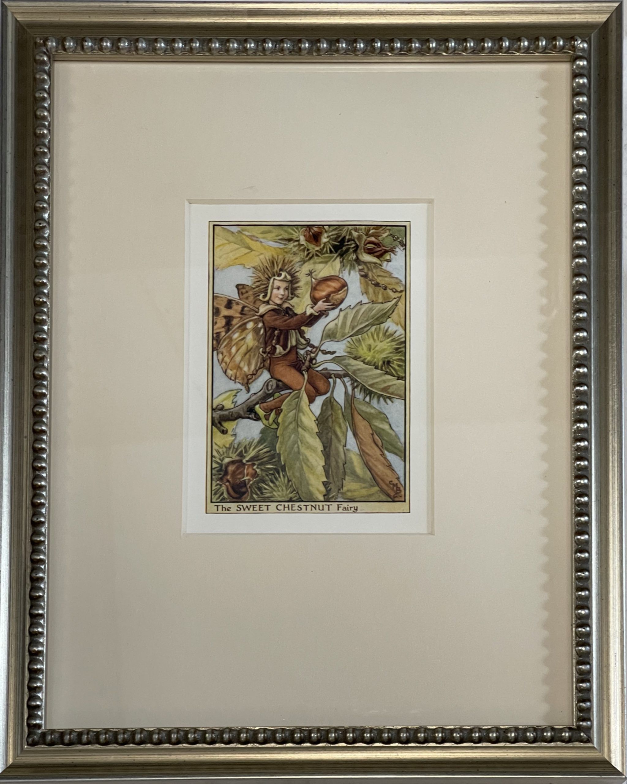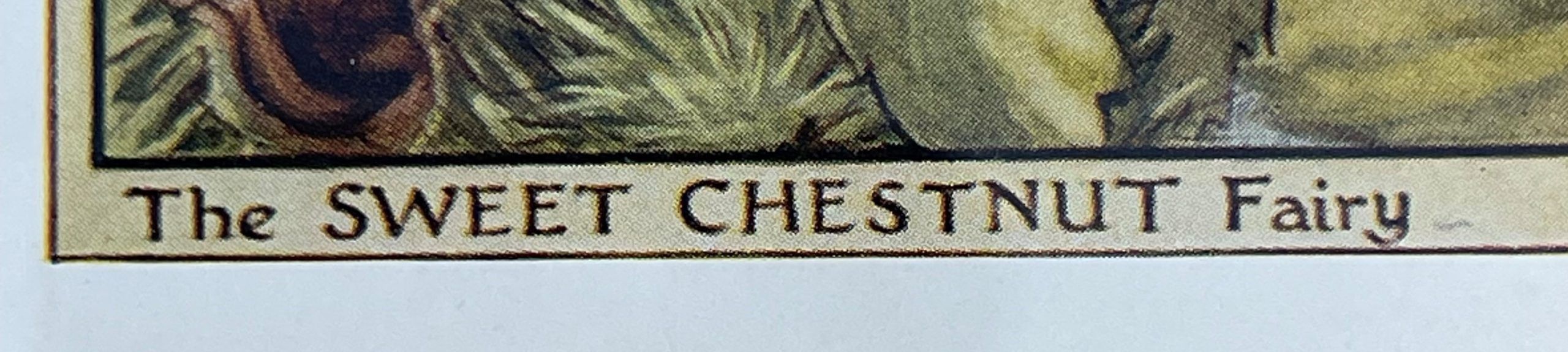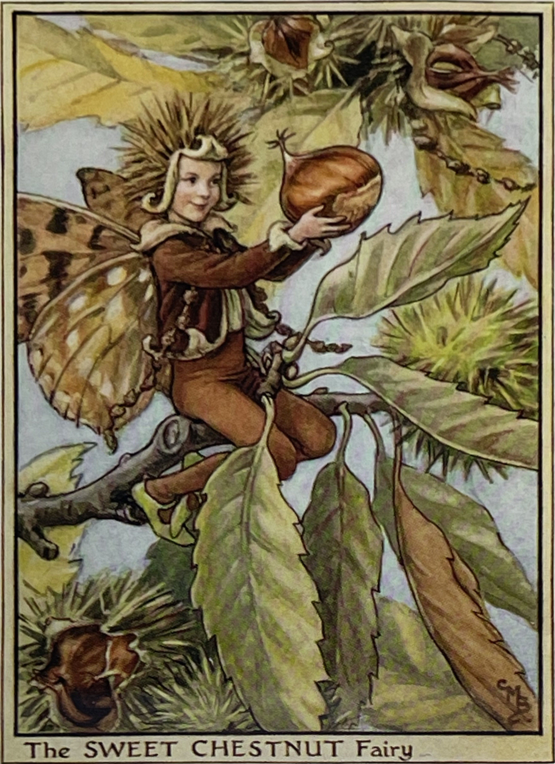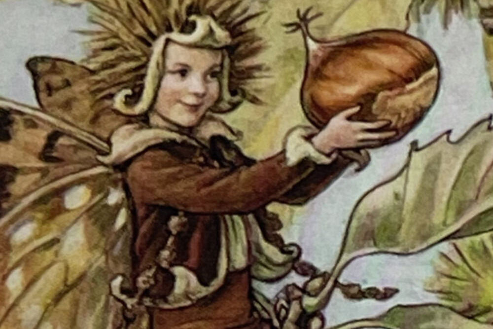 Cecily Mary Barker’s charming illustration of the elusive Sweet Chestnut Fairy, whose playful pranks with Chestnuts keep the tree happy, rarely seen but essential to the health of the tree.