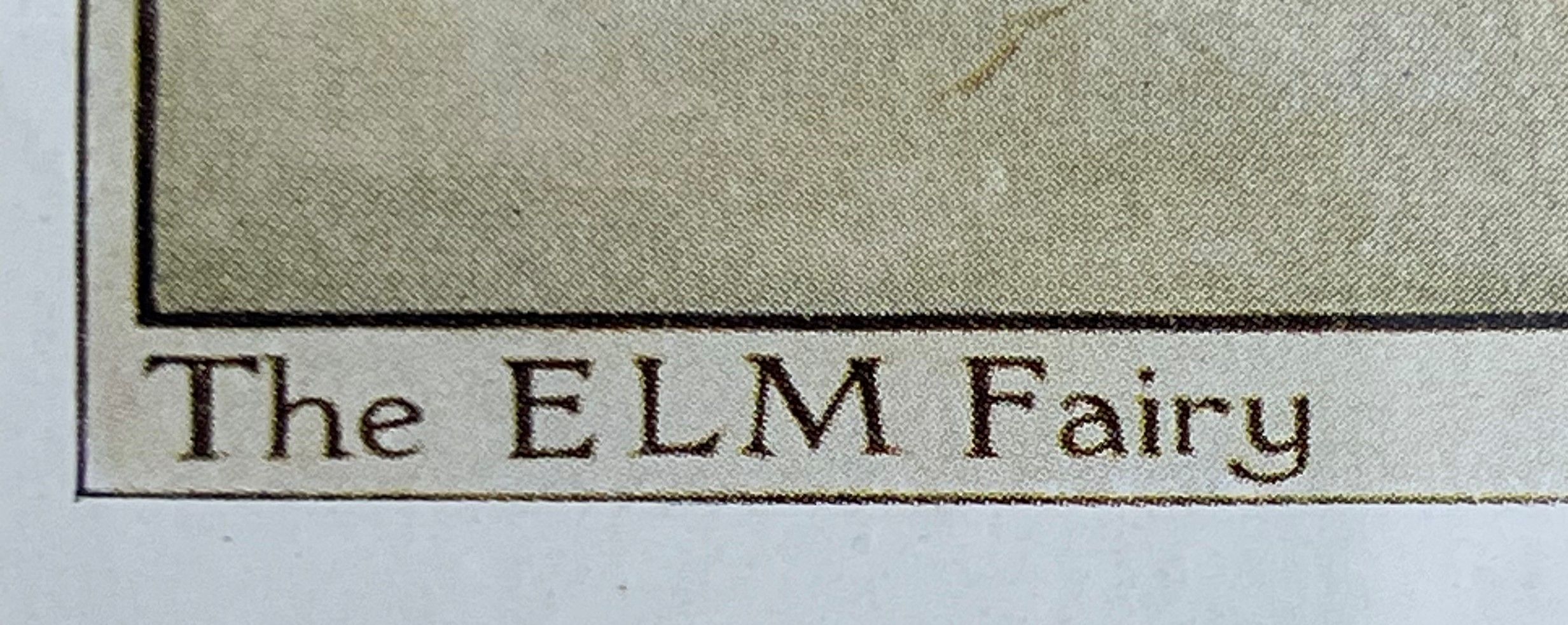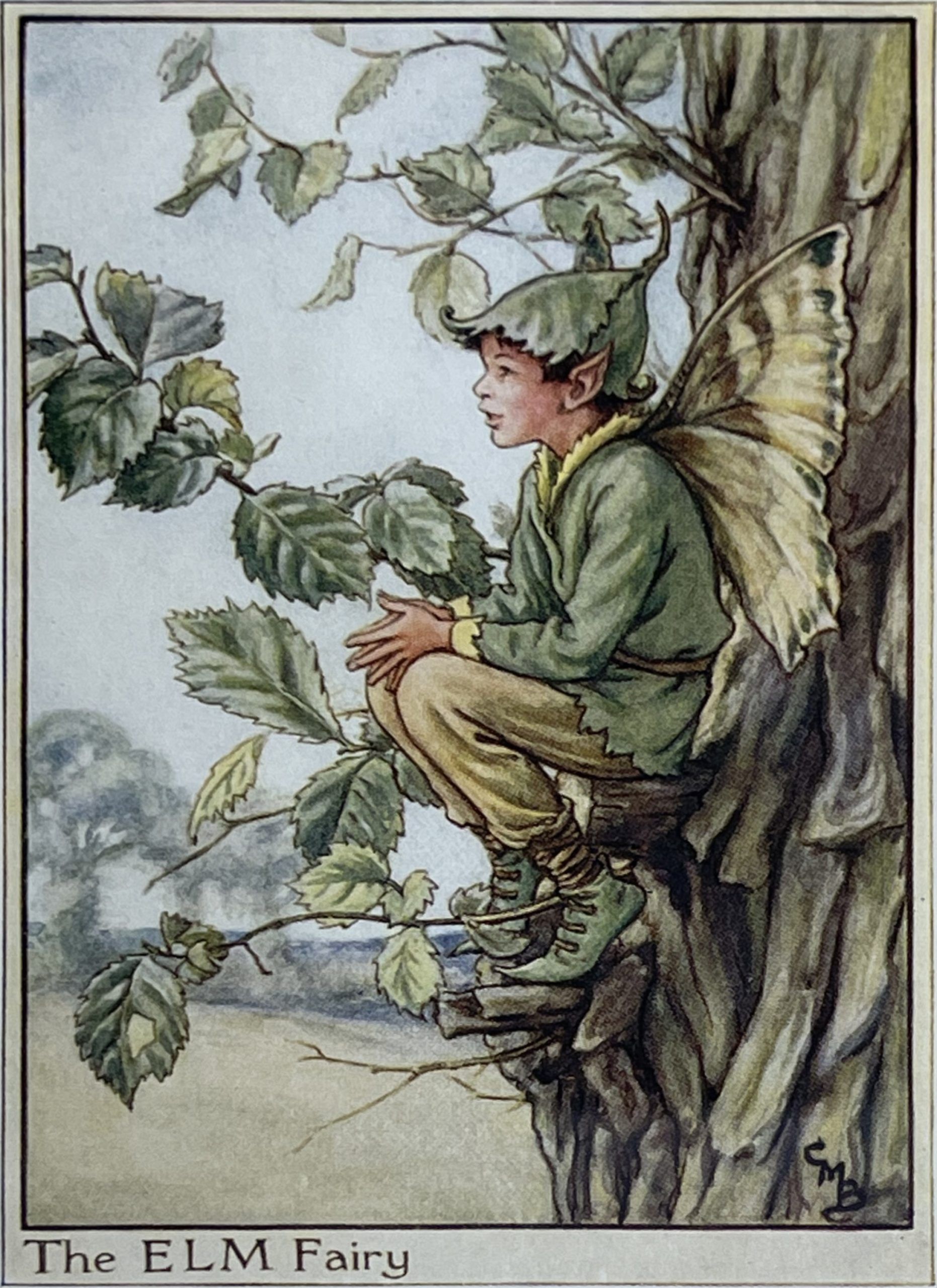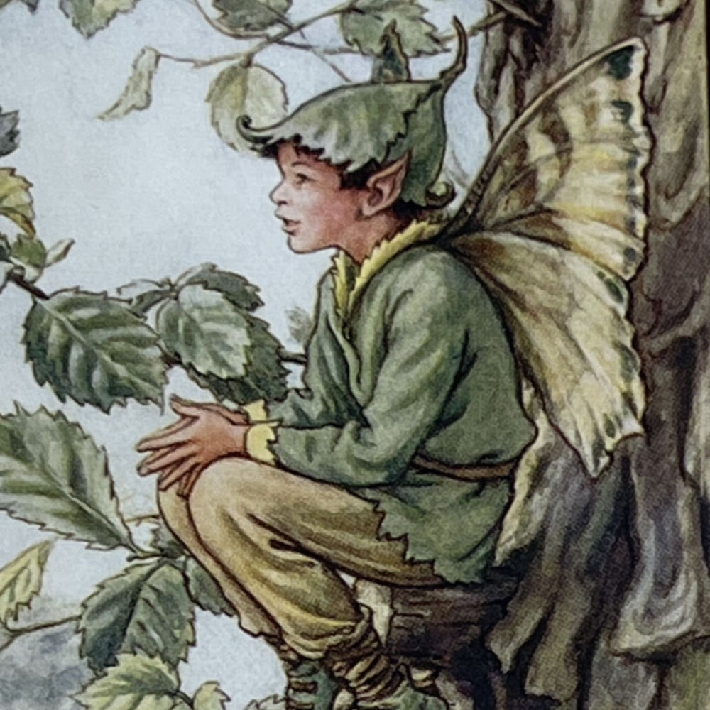 Cecily Mary Barker’s charming illustration of the elusive Elm Tree Fairy, who flits among the blossoms and helps to keep the tree happy, rarely seen but essential to the health of the tree.