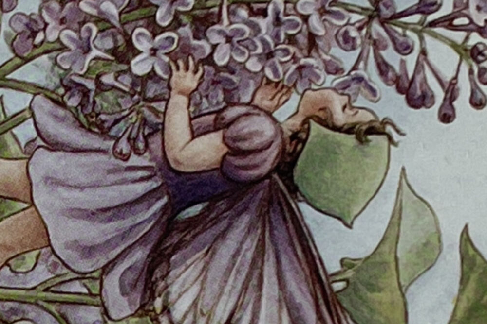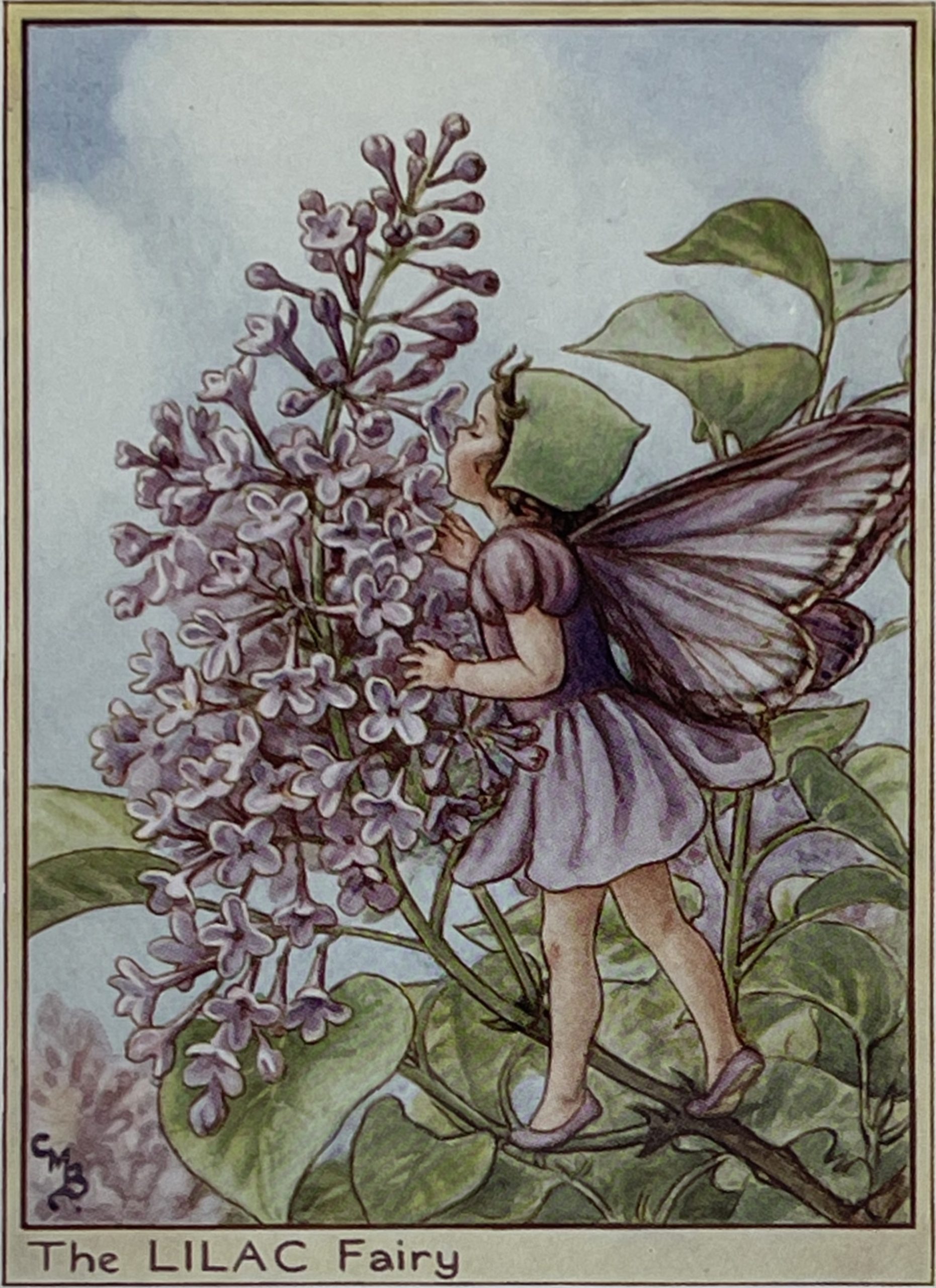 Cecily Mary Barker’s charming illustration of the elusive Lilac Fairy, who flits among the blossoms and makes sure each one reaches the peak of fragrance, rarely seen but essential to the health of the tree.