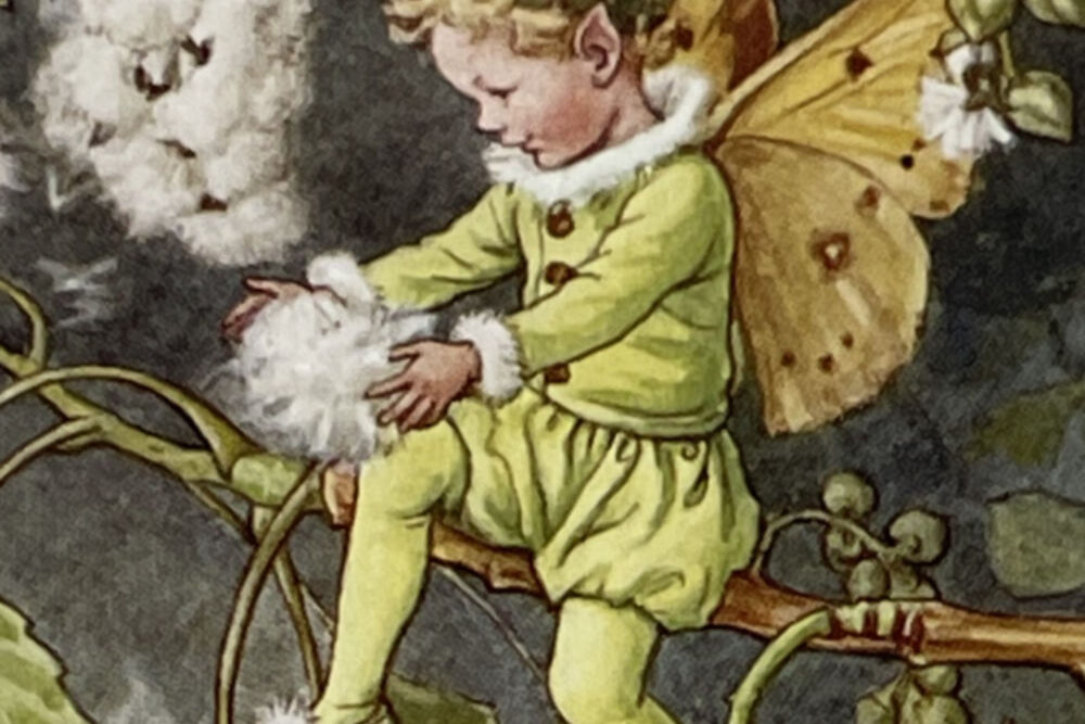 Cecily Mary Barker’s charming illustration of the elusive Poplar Fairy, who plays with the fluffy blossoms and helps to keep the tree happy, rarely seen but essential to the health of the tree.
