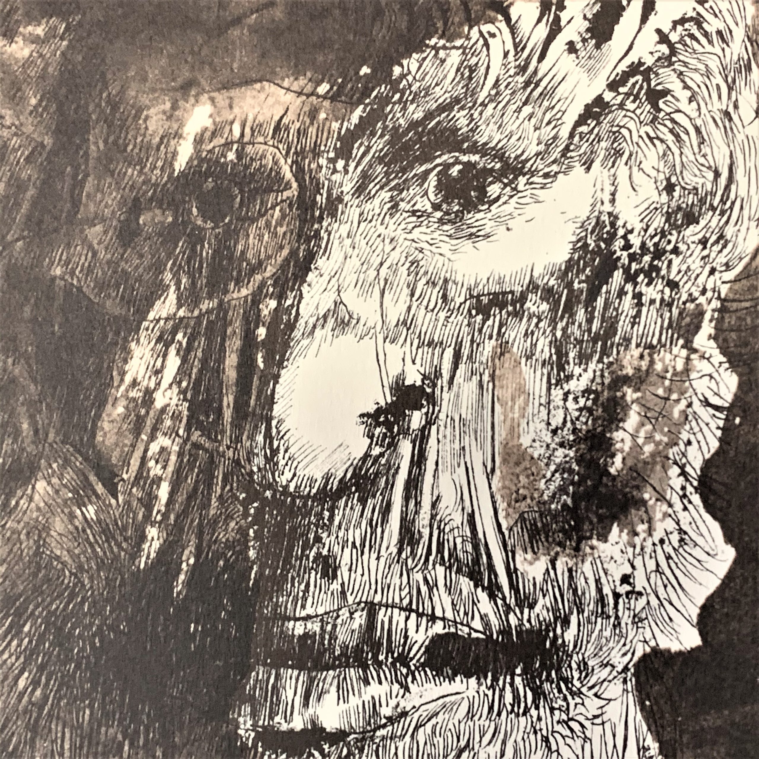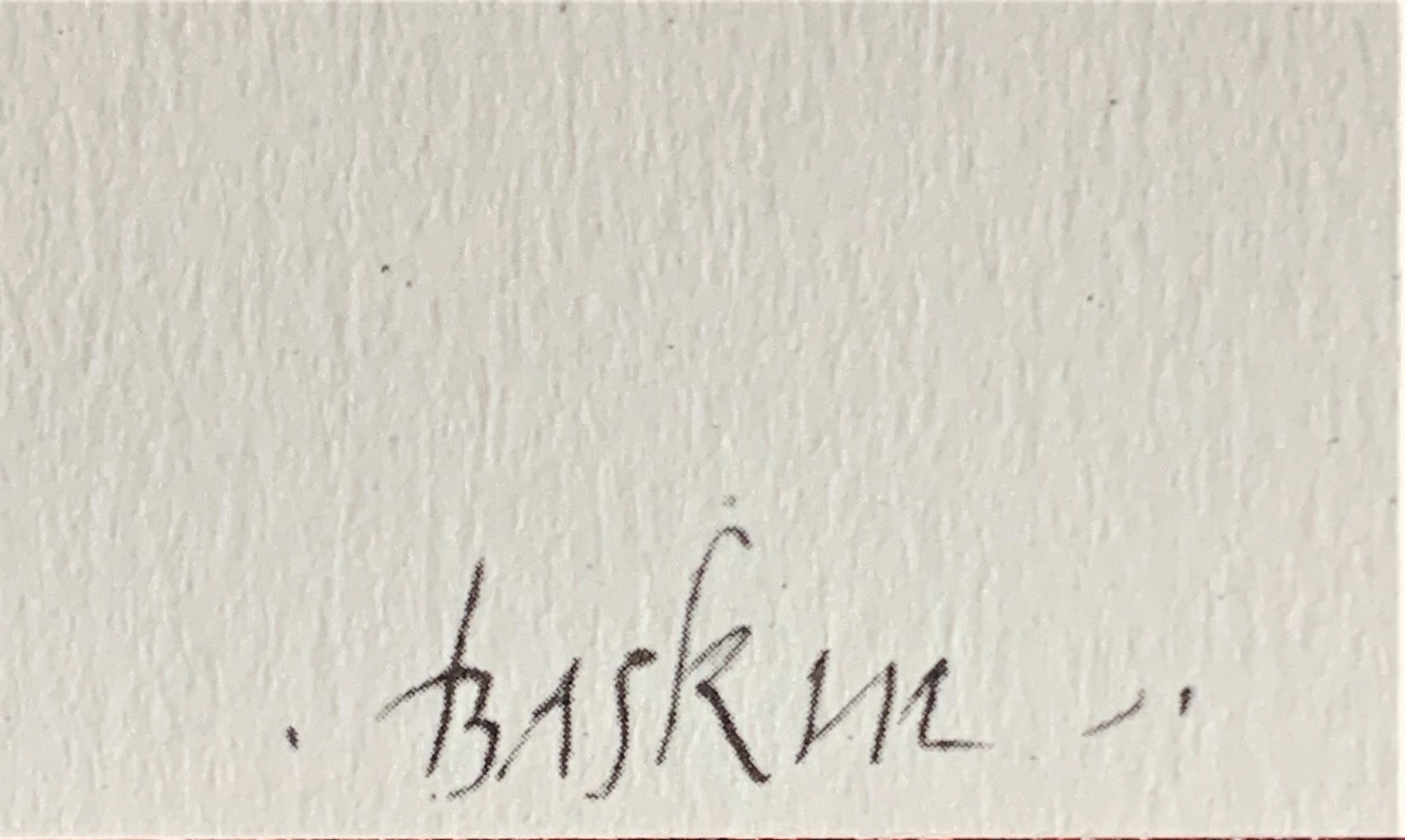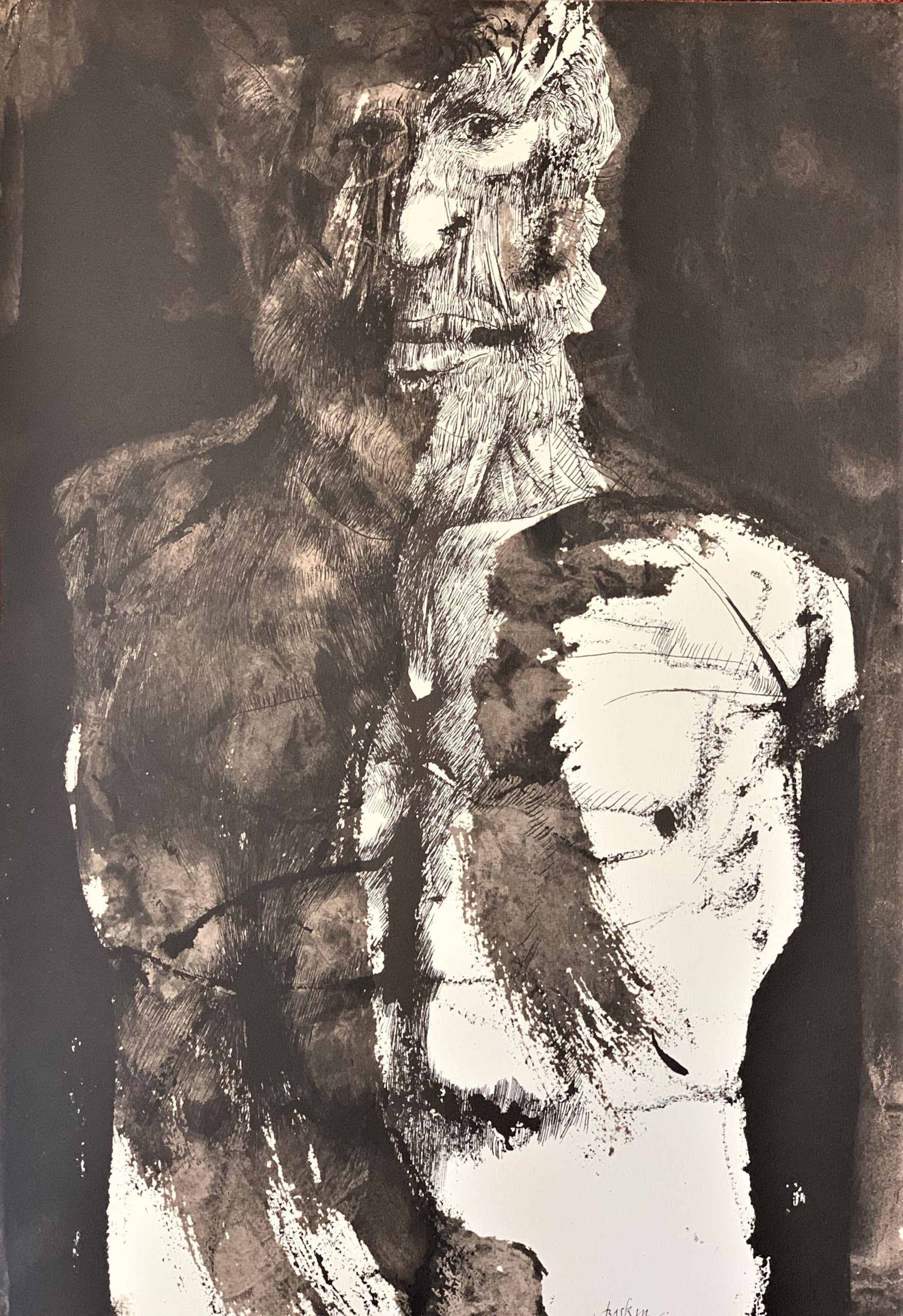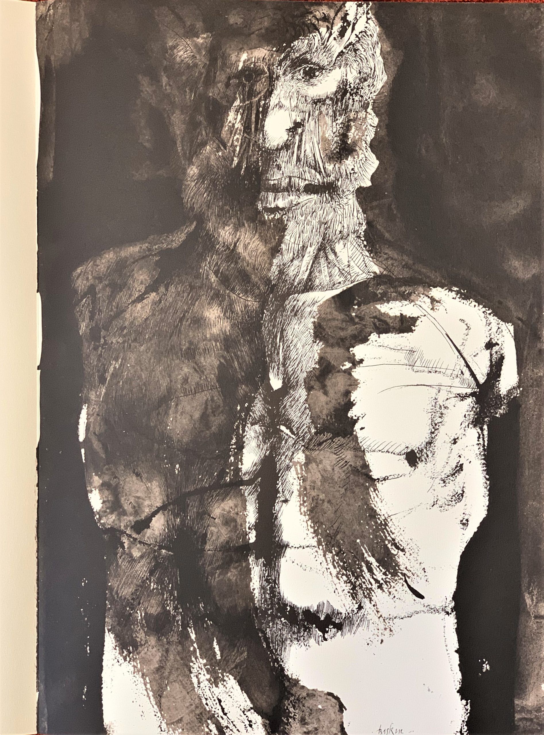 Baskin was distressed at the state of the art world when he made the drawings which were published in this portfolio.  He said, “The art of our time is an act of cowardice, a triumph of the trivial, a squandering of treasure.”  In Baskin’s view, art was meant to be a means whereby “man must rediscover man, harried and brutalized, distended and eviscerated, but noble withal, rich in intention, puissant in creative spur, and enduring in the posture of love.”