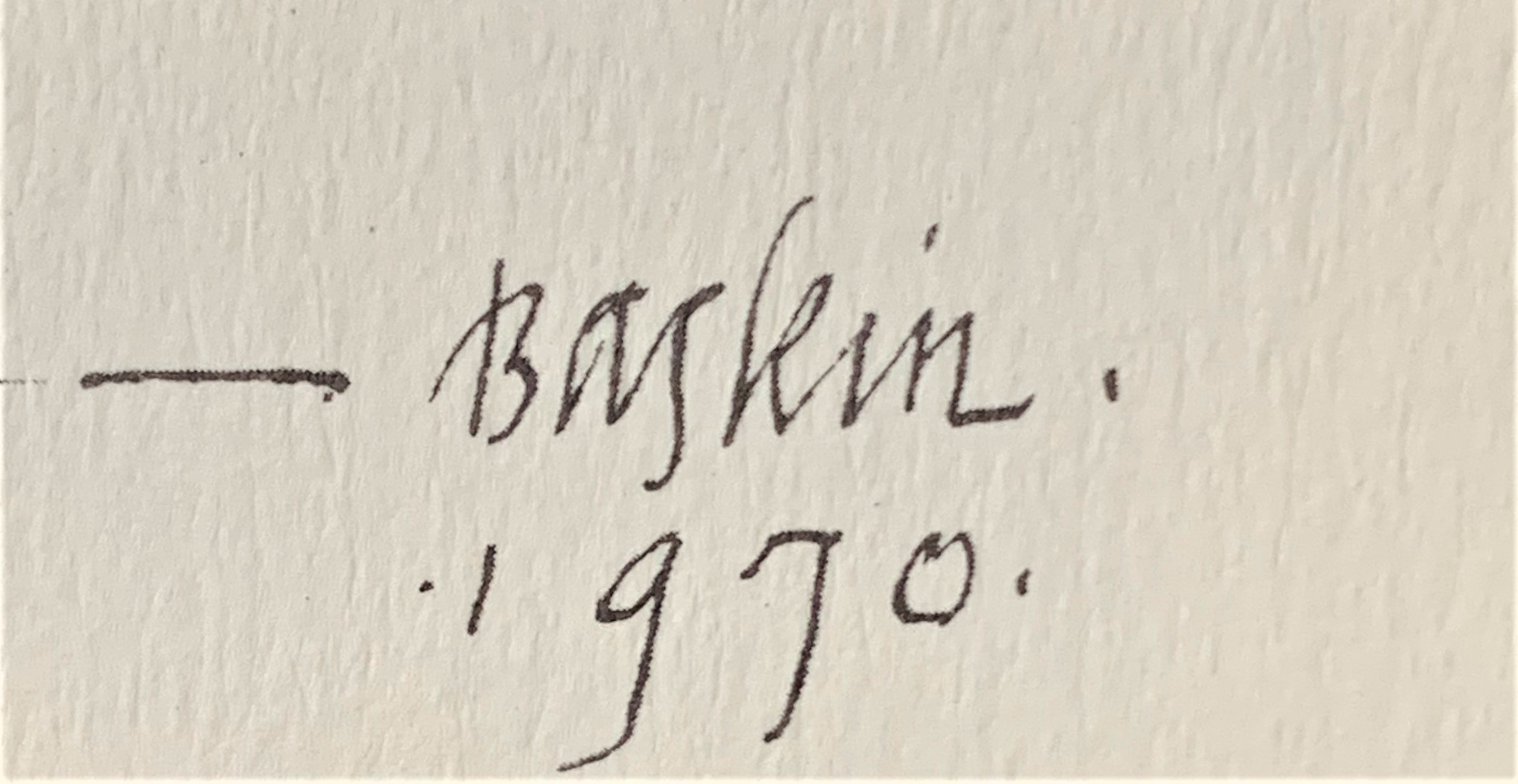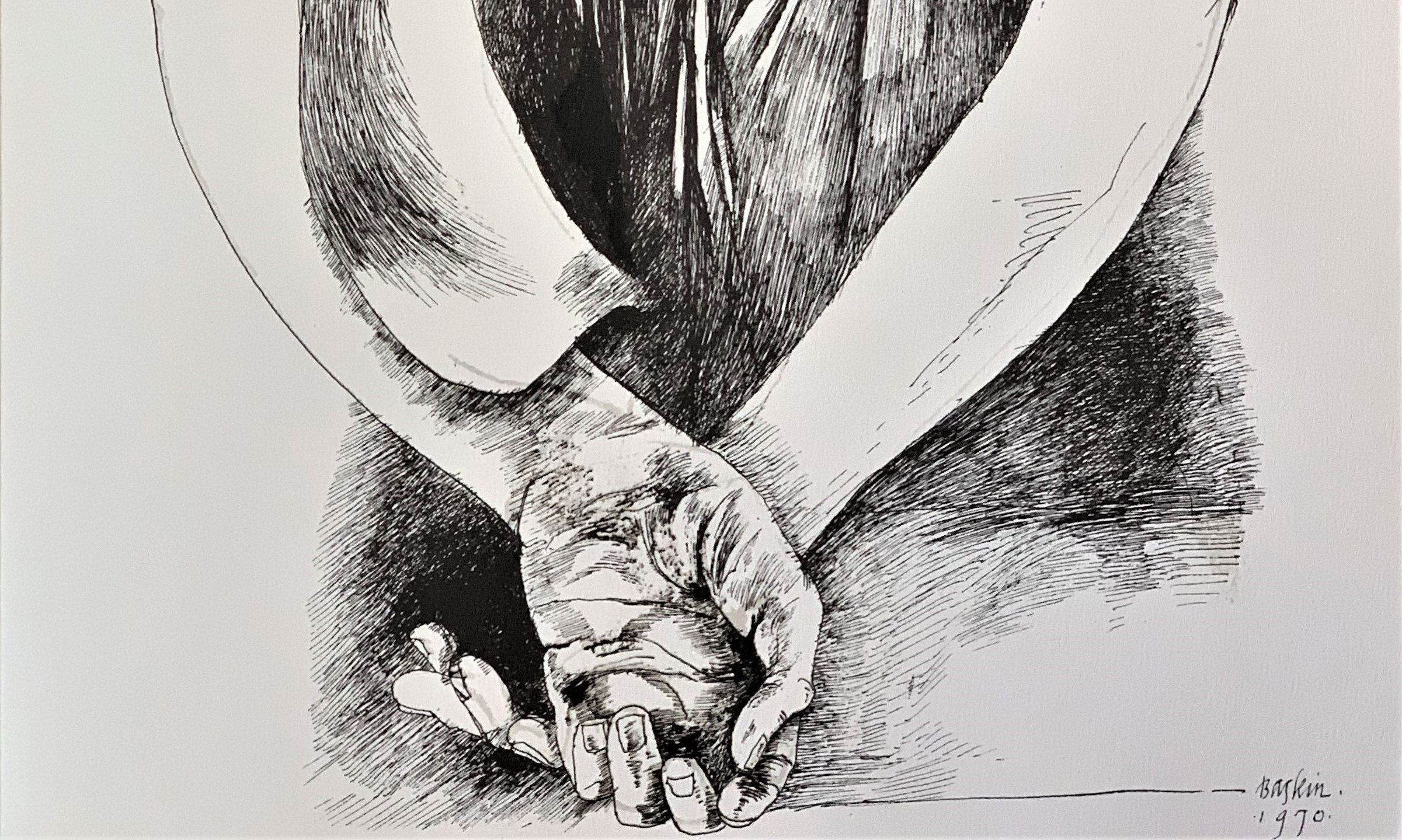 Baskin was distressed at the state of the art world when he made the drawings which were published in this portfolio. He said, “The art of our time is an act of cowardice, a triumph of the trivial, a squandering of treasure.” In Baskin’s view, art was meant to be a means whereby “man must rediscover man, harried and brutalized, distended and eviscerated, but noble withal, rich in intention, puissant in creative spur, and enduring in the posture of love.”