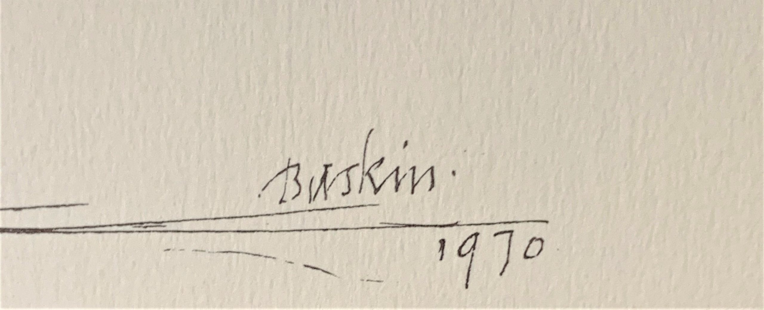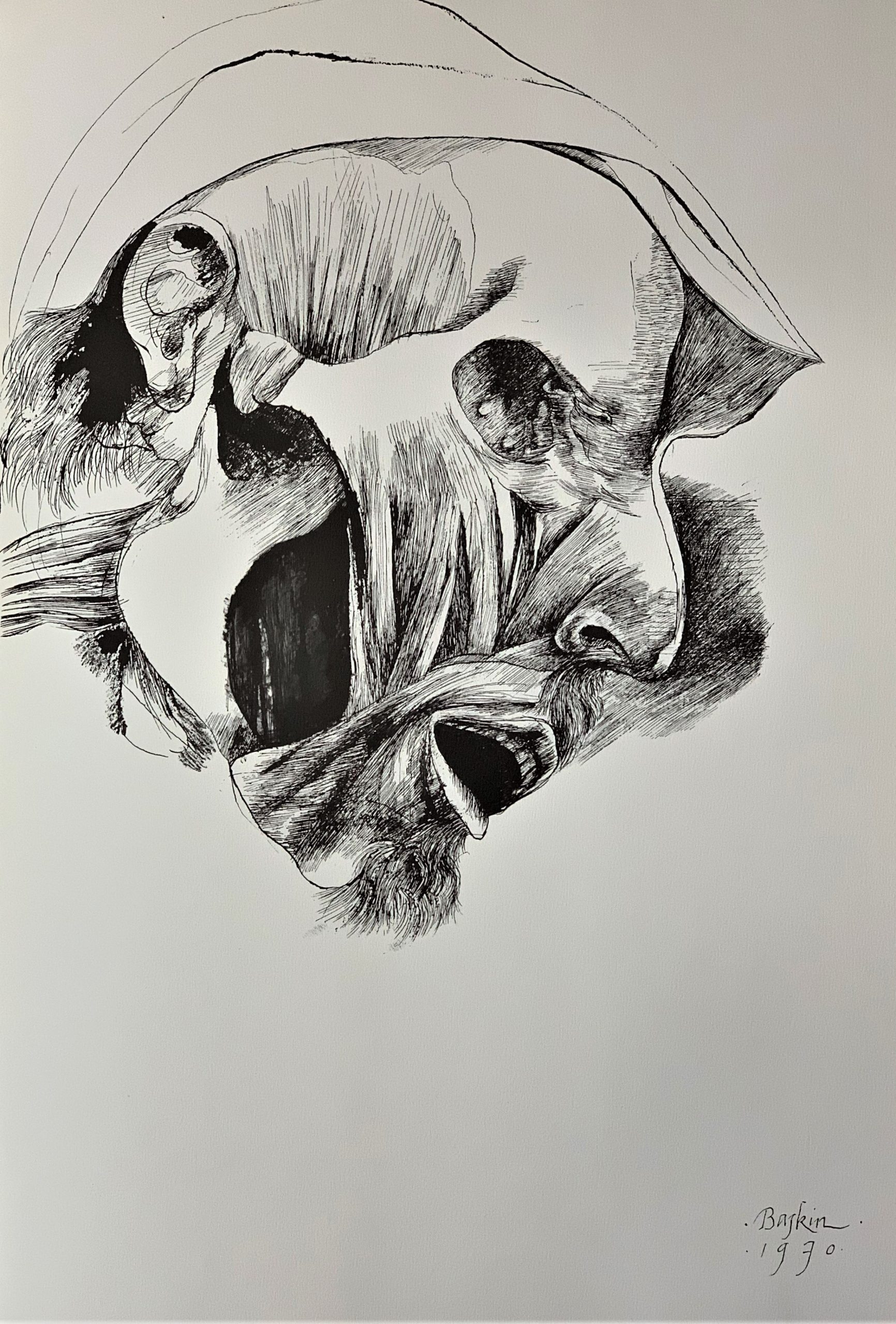 Baskin was distressed at the state of the art world when he made the plates which were published in this portfolio.  He said, “The art of our time is an act of cowardice, a triumph of the trivial, a squandering of treasure.”  In Baskin’s view, art was meant to be a means whereby “man must rediscover man, harried and brutalized, distended and eviscerated, but noble withal, rich in intention, puissant in creative spur, and enduring in the posture of love.”