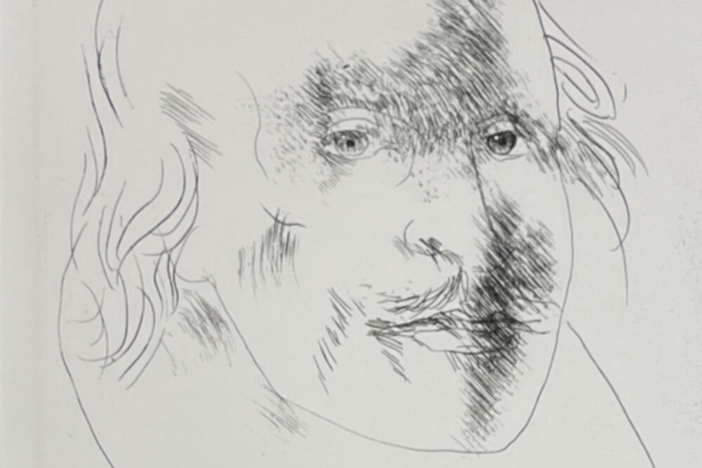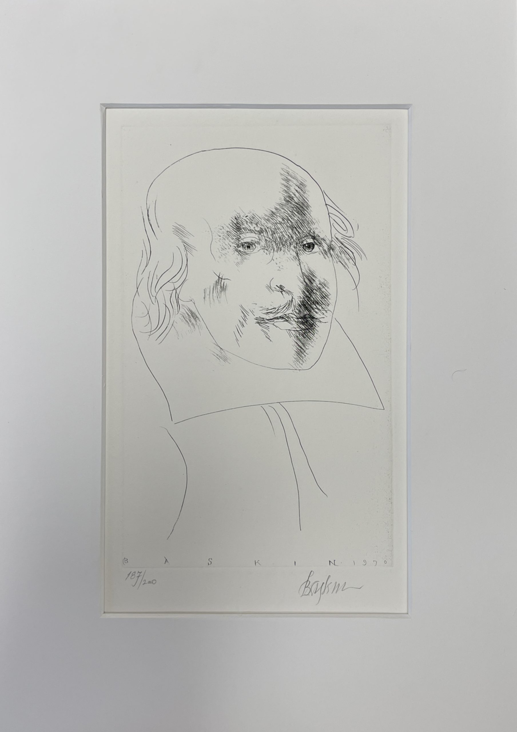 This etching of William Shakespeare is from Leonard Baskin’s Titus Andronicus. Titus Andronicus was the first volume of The Gehenna Shakespeare, which Baskin intended to be the first of what would be the complete works of Shakespeare. But years later, Baskin wrote of it as an “idiotic idea,” because the cost to print it, with handmade paper and metal type, made the project an “expensive fiasco”. Titus Andronicus and Othello were the only two volumes completed.