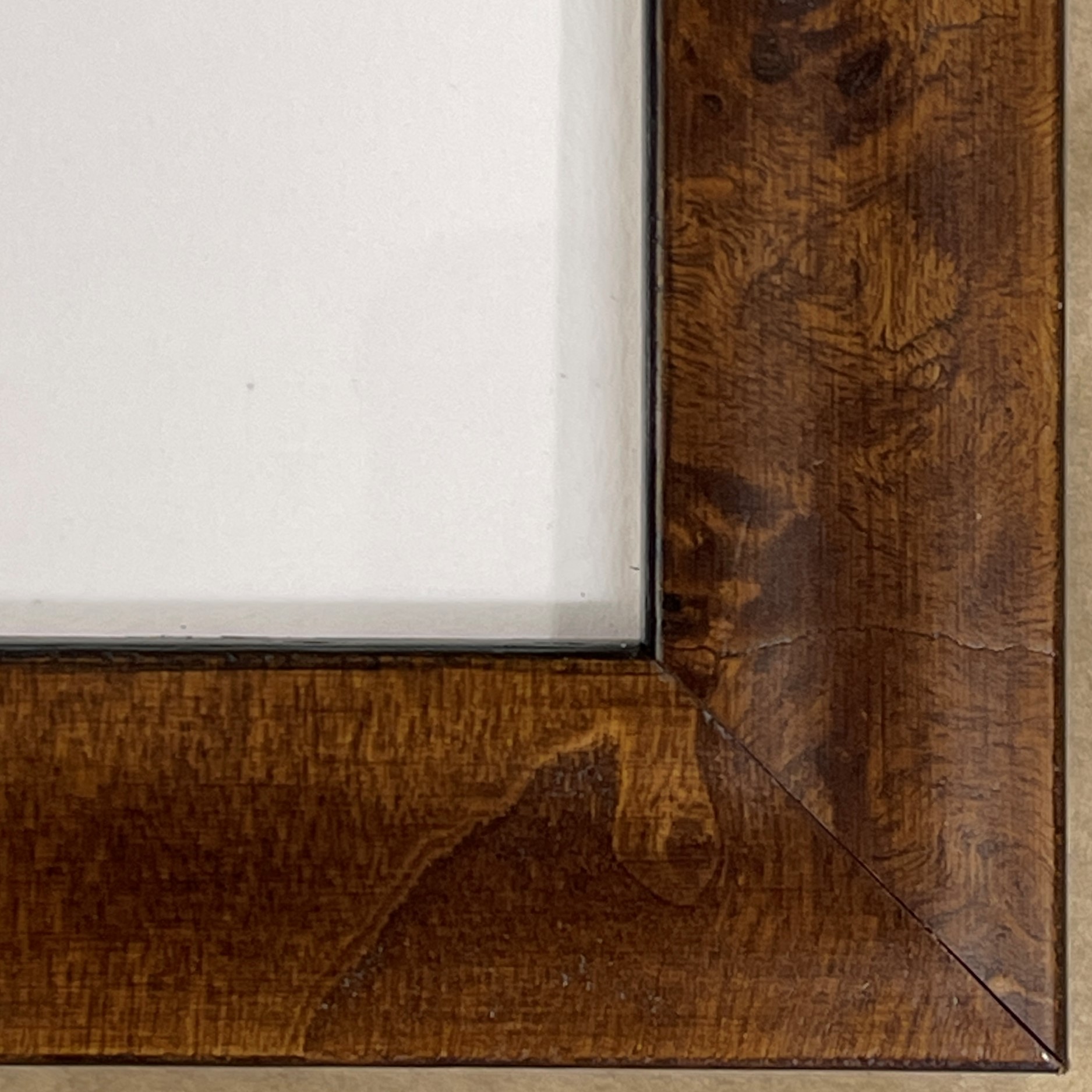 Custom framed in a hardwood frame with a walnut burl veneer behind 99% UV-blocking art glass.