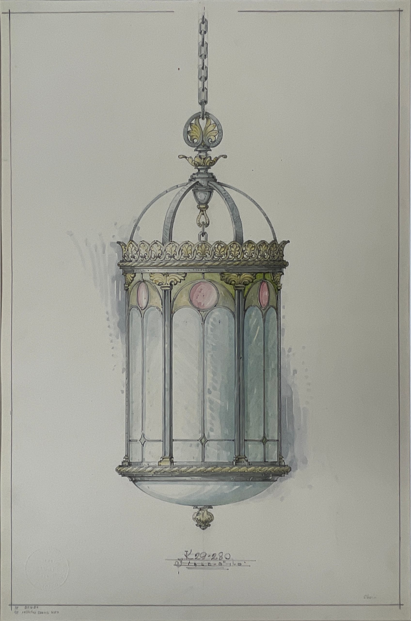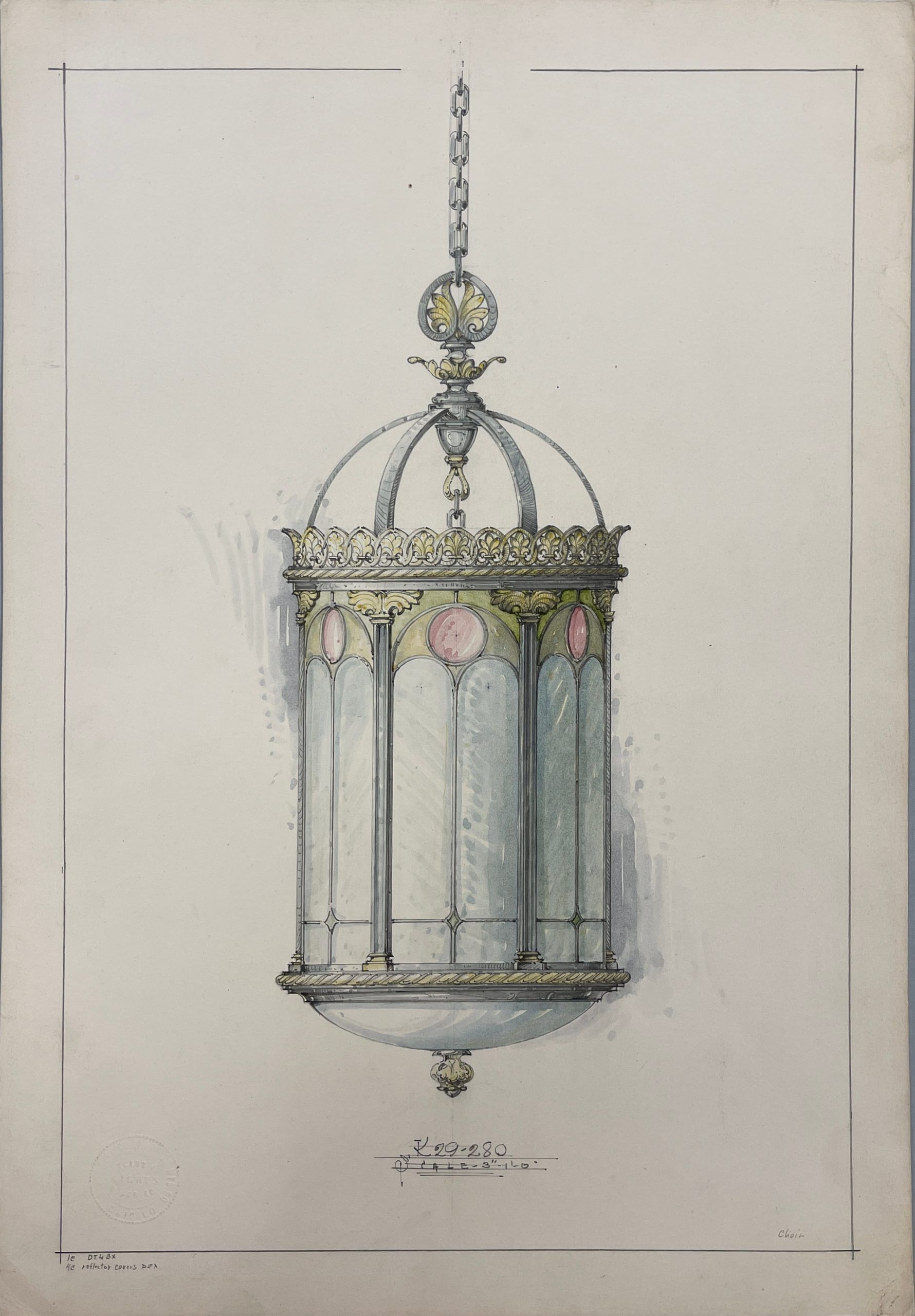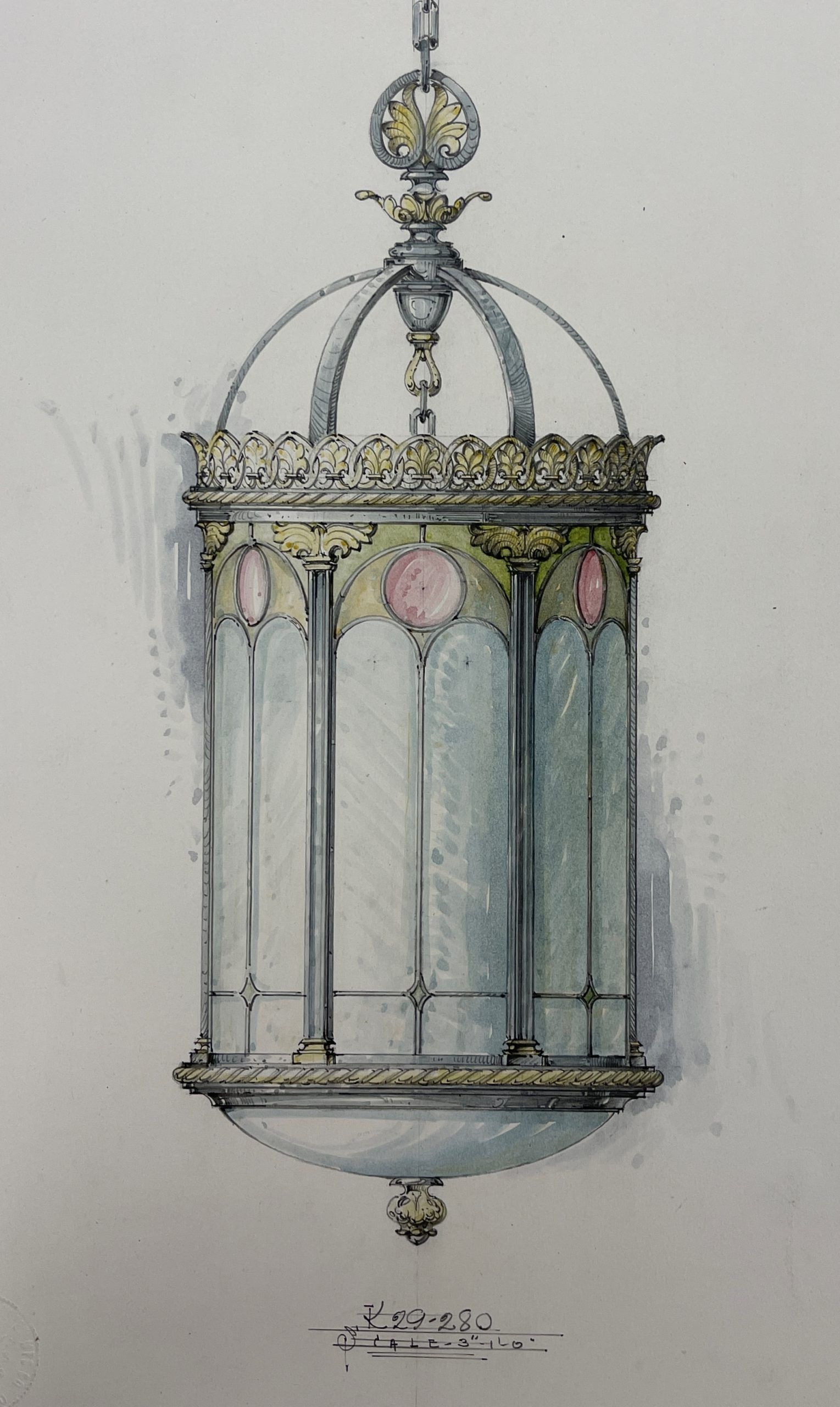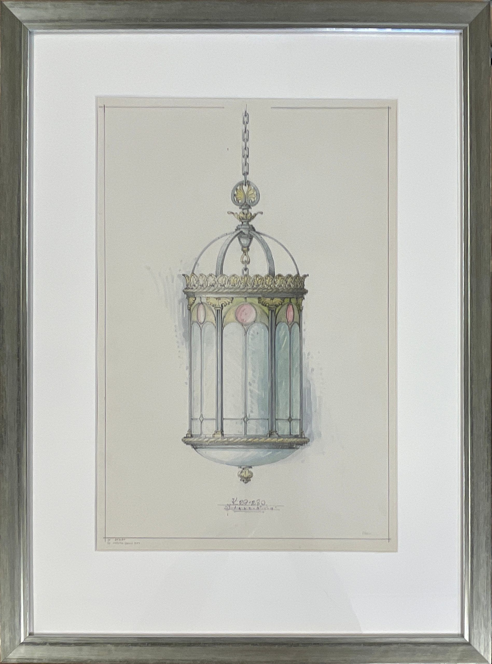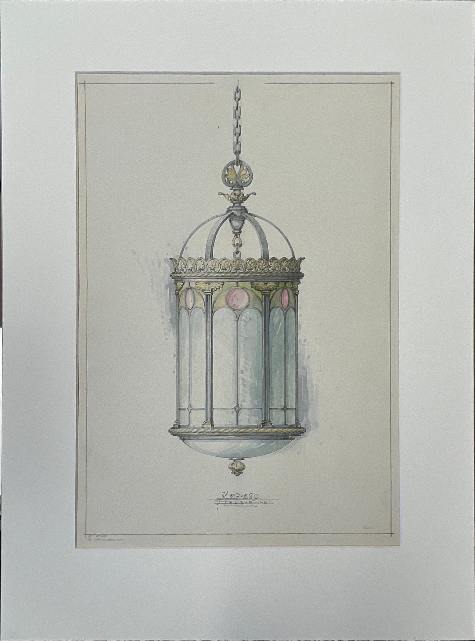 The Beardslee Chandelier Manufacturing Company of Chicago, founded by Frank S. Beardslee in 1901, was a major innovator in lighting and became one of the largest fabricators in the city. Selling only to the trade, they published lavish, large catalogues every year (plus smaller specialty catalogues, like “fast-ship” products) which are of enormous interest today among collectors. This illustration, though, is not a tattered catalogue. Done in pen & ink with watercolors, it is a drawing of a chandelier intended for the choir room, part of a collection of drawings completed to supply all of the lighting fixtures for an unknown client. Bearing the raised seal of the company (“Exclusive Rights Reserved”) and details regarding size, placement, and glass. This is a beautiful and unique work of art and would be at home in a residence, an office, an architectural firm, a design firm, and more.