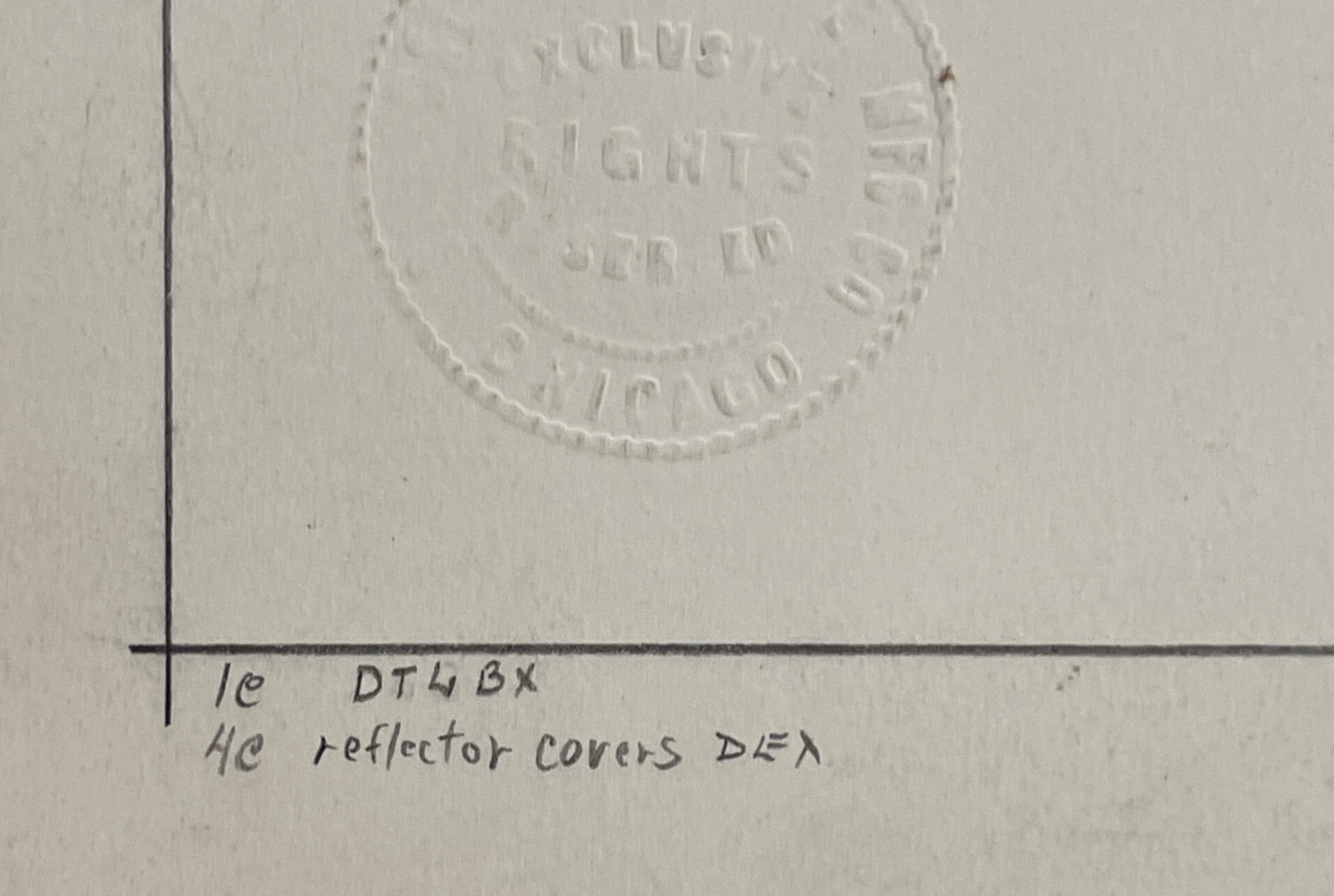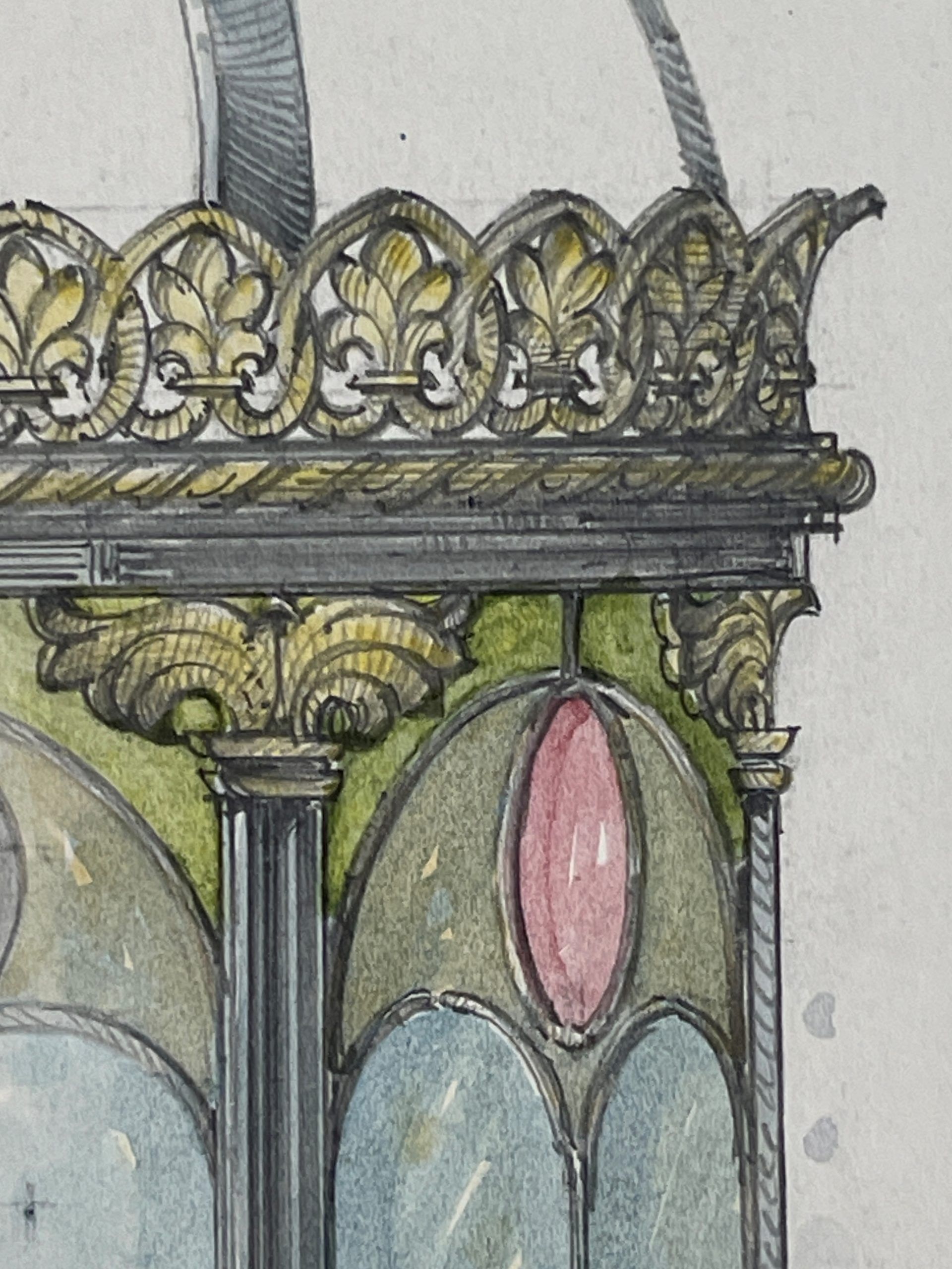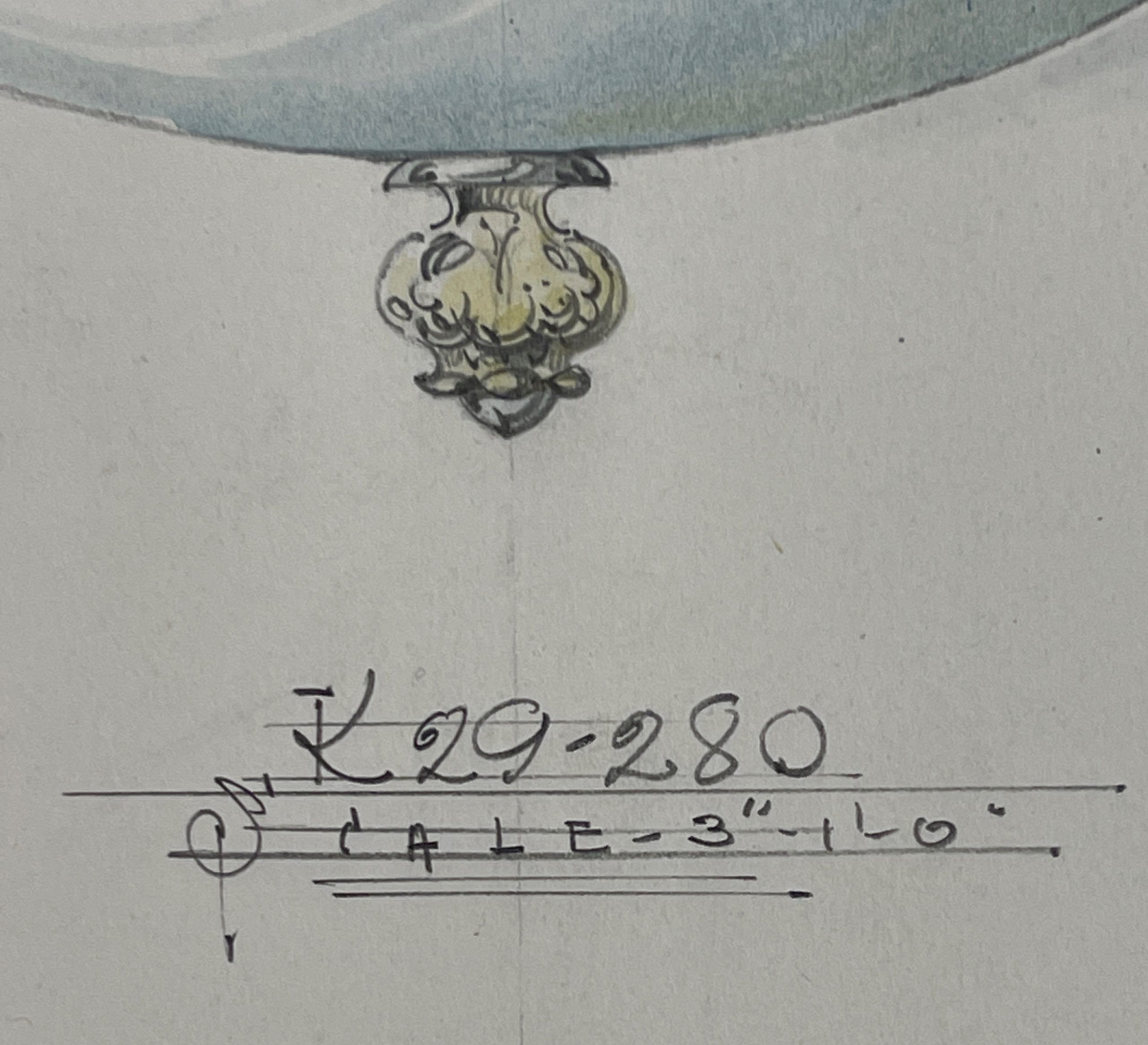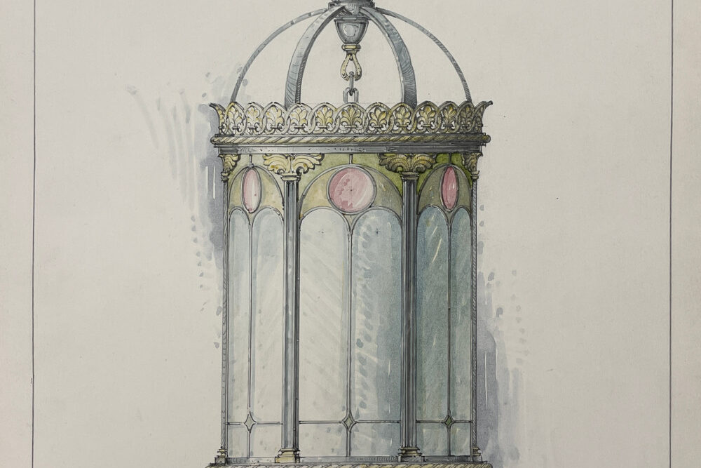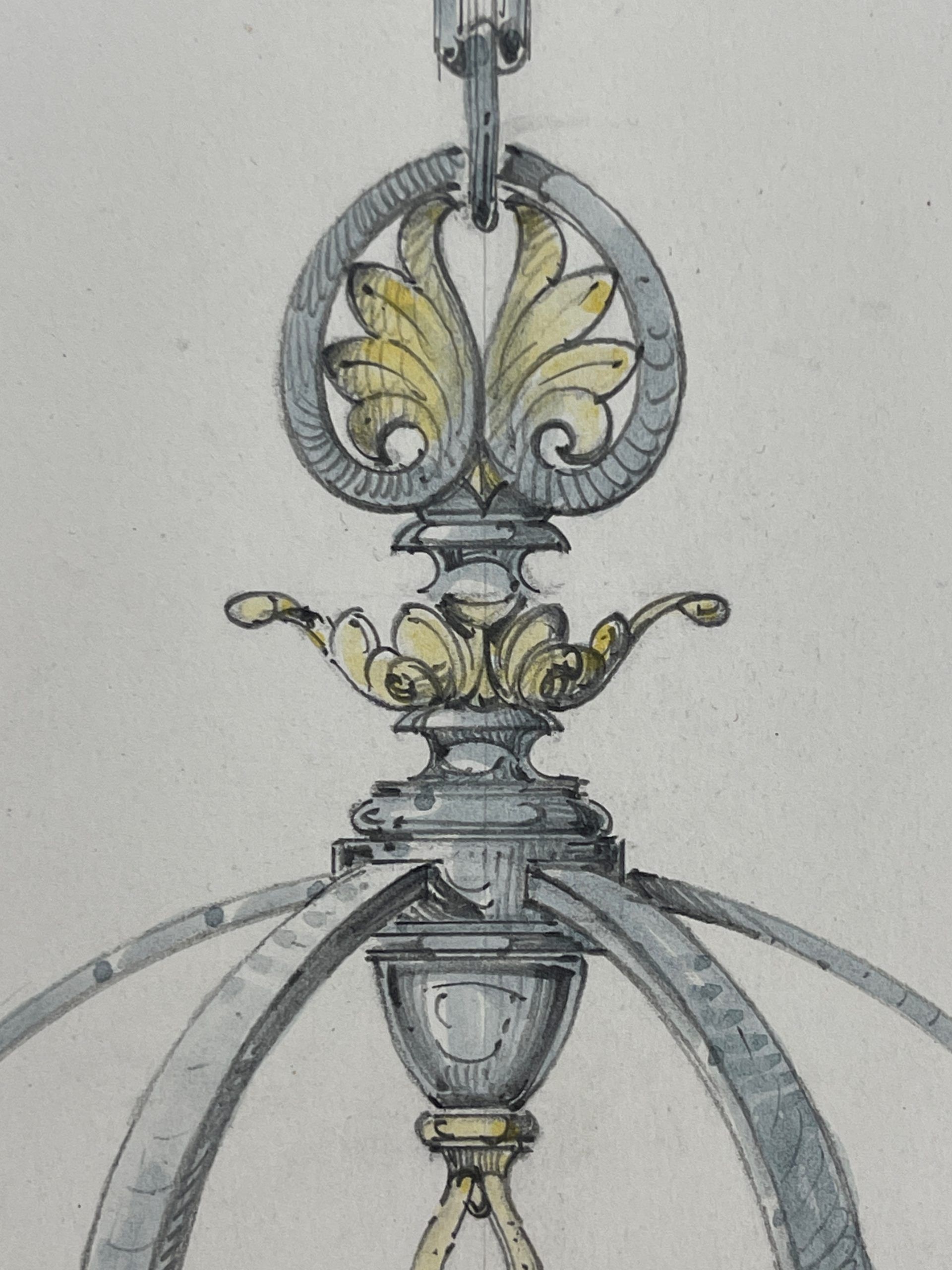 The Beardslee Chandelier Manufacturing Company of Chicago, founded by Frank S. Beardslee in 1901, was a major innovator in lighting and became one of the largest fabricators in the city. Selling only to the trade, they published lavish, large catalogues every year (plus smaller specialty catalogues, like “fast-ship” products) which are of enormous interest today among collectors. This illustration, though, is not a tattered catalogue. Done in pen & ink with watercolors, it is a drawing of a chandelier intended for the choir room, part of a collection of drawings completed to supply all of the lighting fixtures for an unknown client. Bearing the raised seal of the company (“Exclusive Rights Reserved”) and details regarding size, placement, and glass. This is a beautiful and unique work of art and would be at home in a residence, an office, an architectural firm, a design firm, and more.