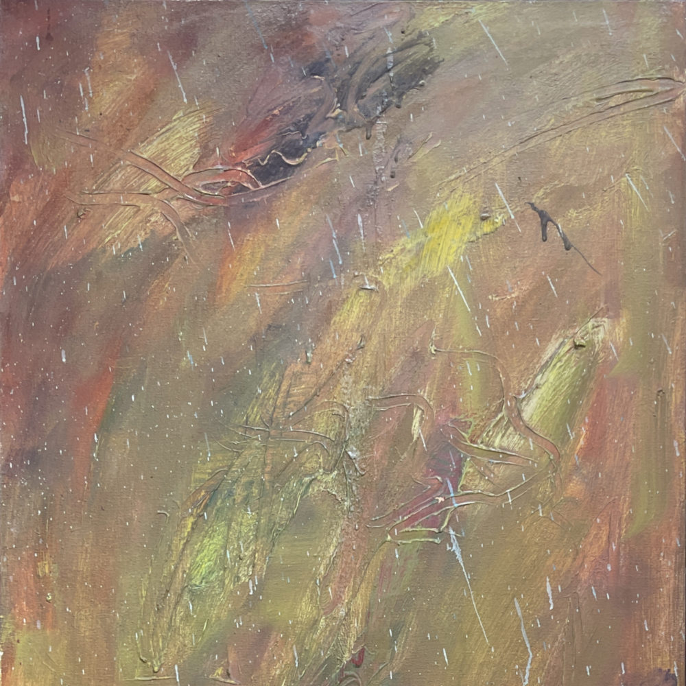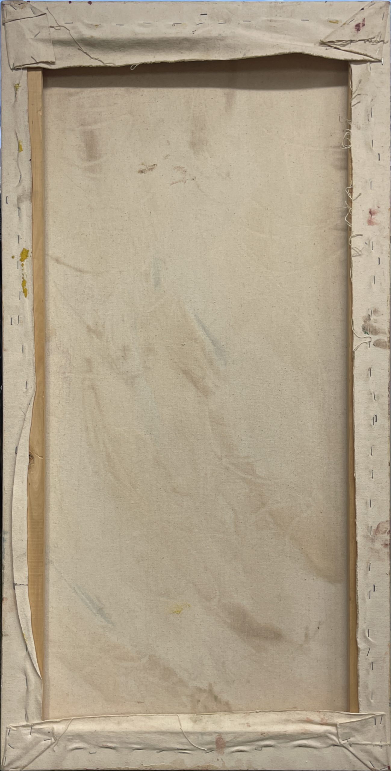 A fascinating painting in which Rita Beler straddles the space between abstract expressionism, action painting, and color field. The canvas has energy moving in multiple dimensions—the paint at a top-right to bottom-left pull, finger swirls disorganized and non-directional, and spattered white paint flickering from top-left to bottom-right.