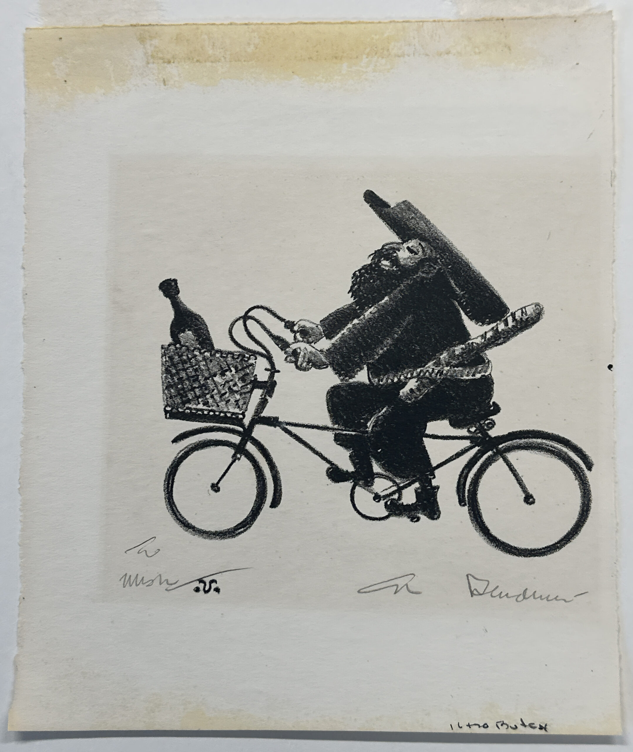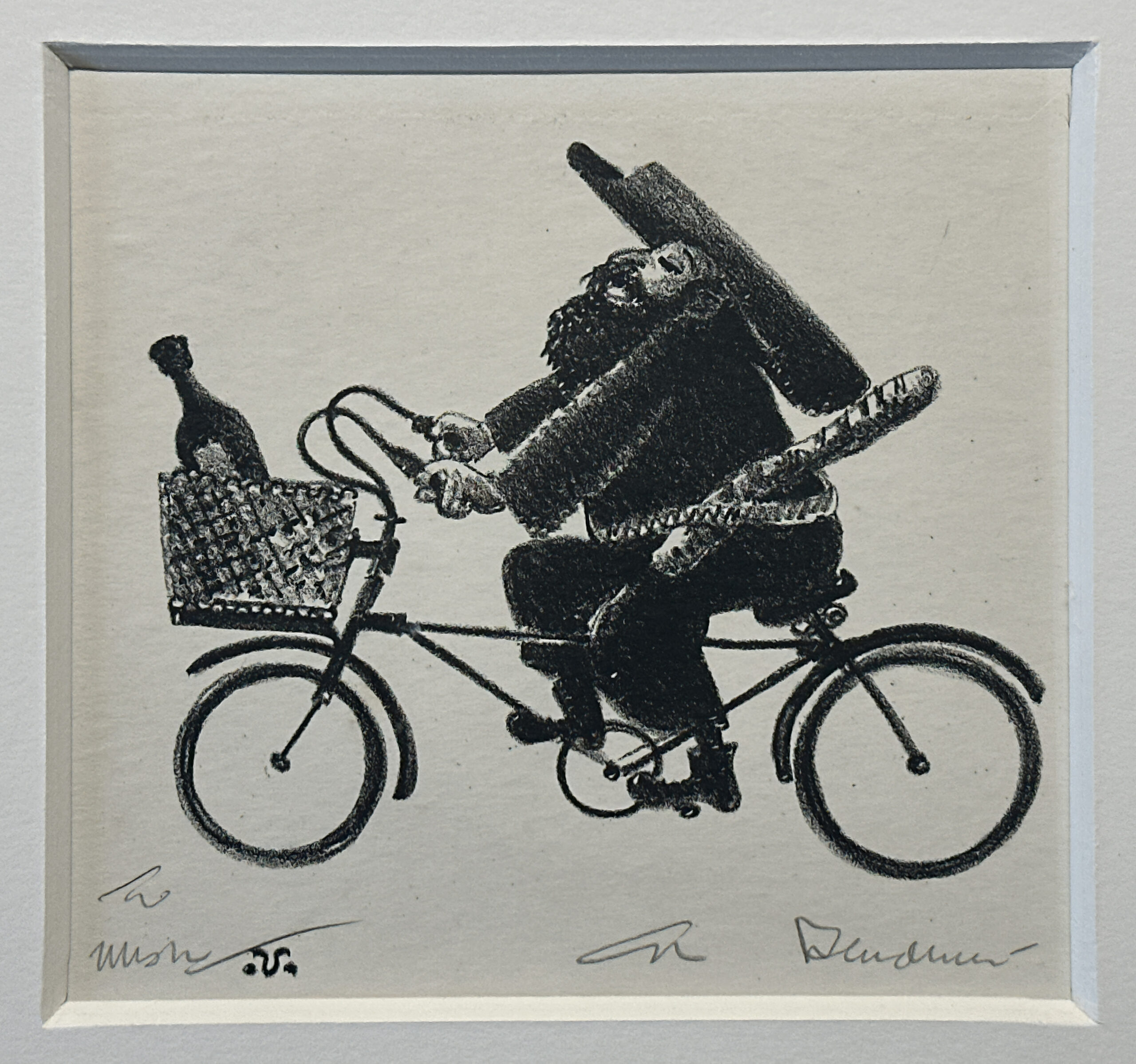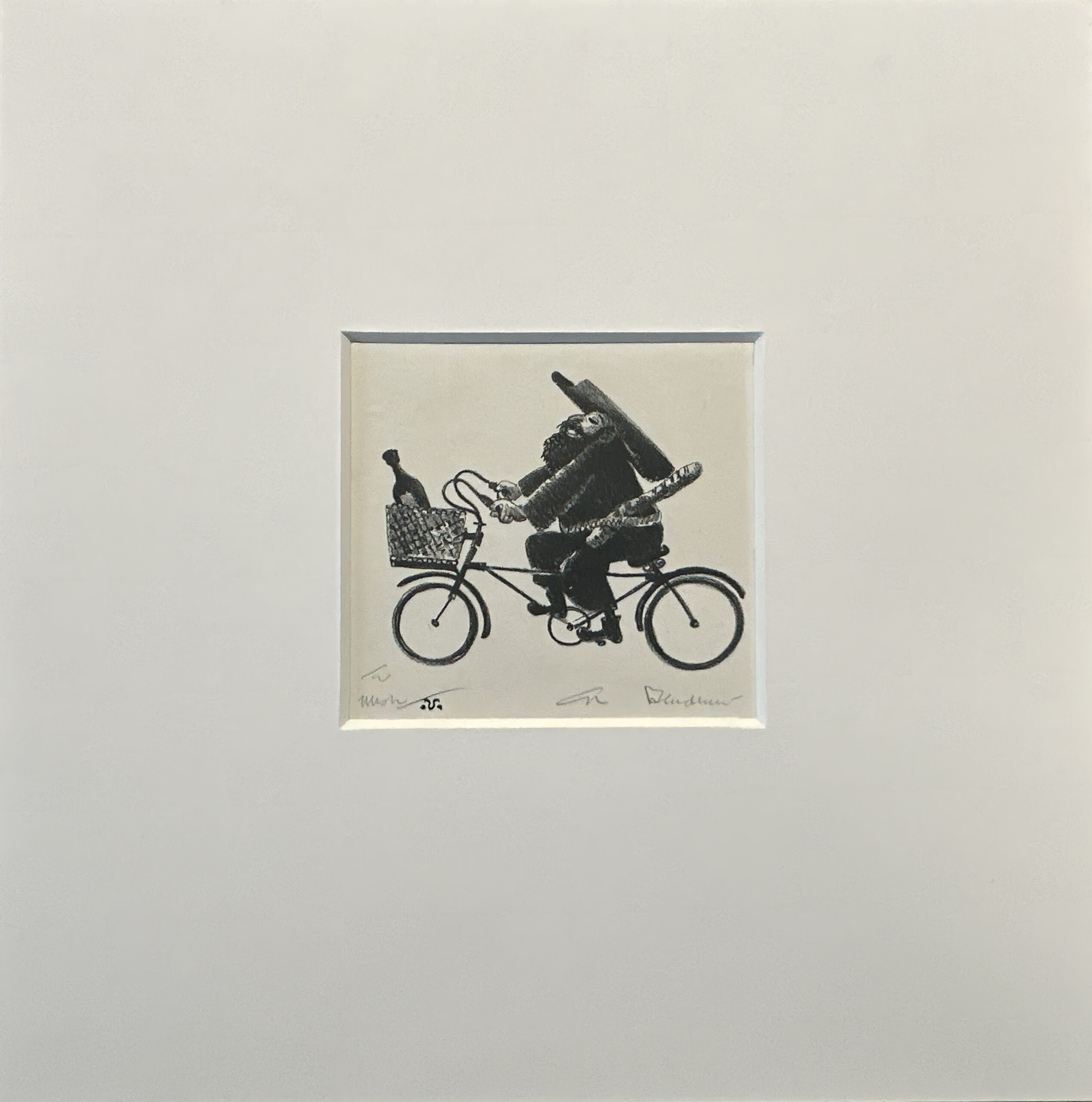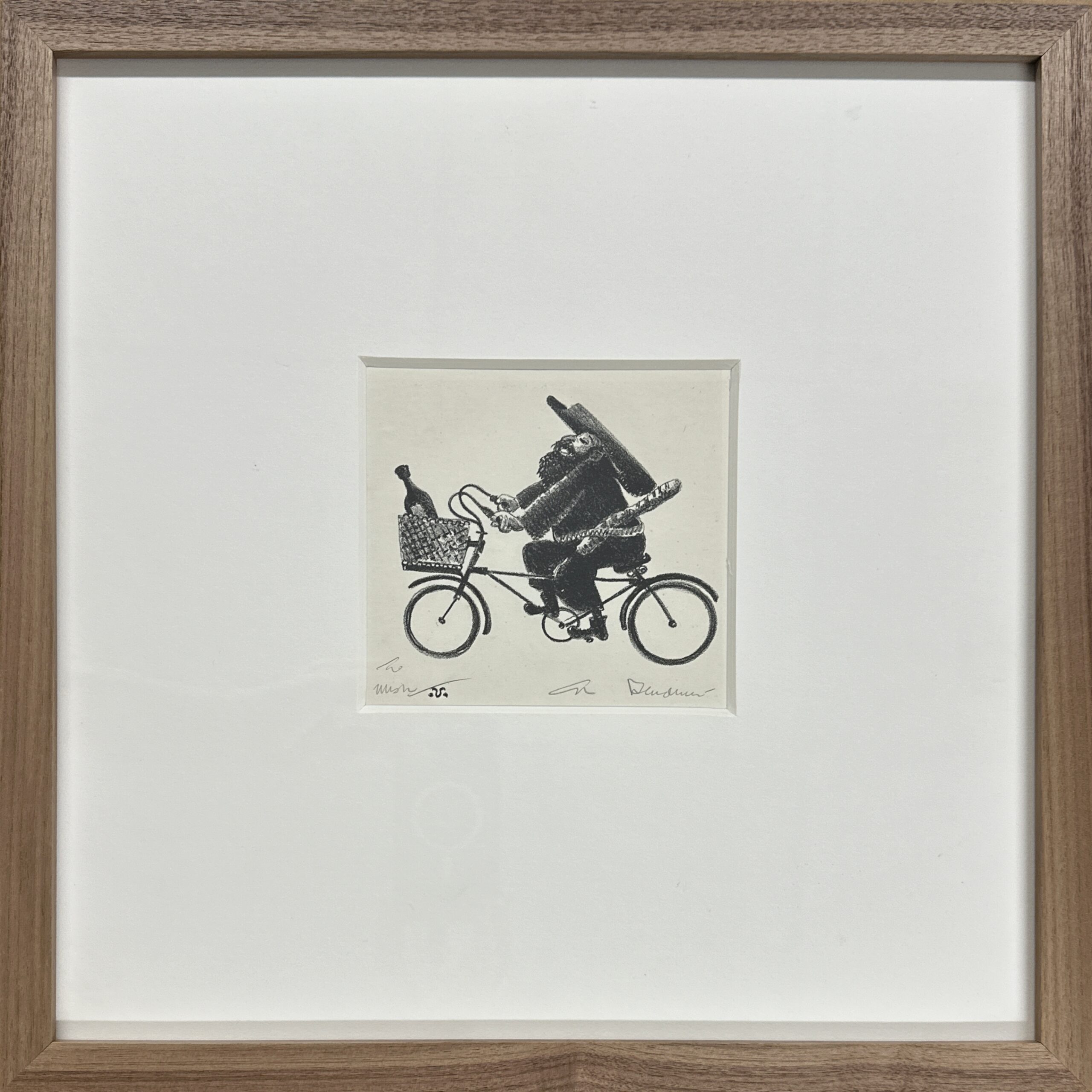 Whimsy on two wheels.  Custom framed in a solid walnut frame using strictly conservation-grade materials behind 99% UV-blocking glass.