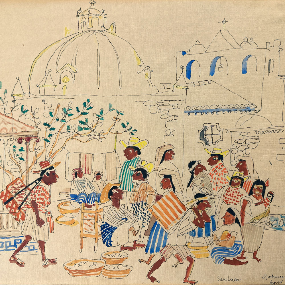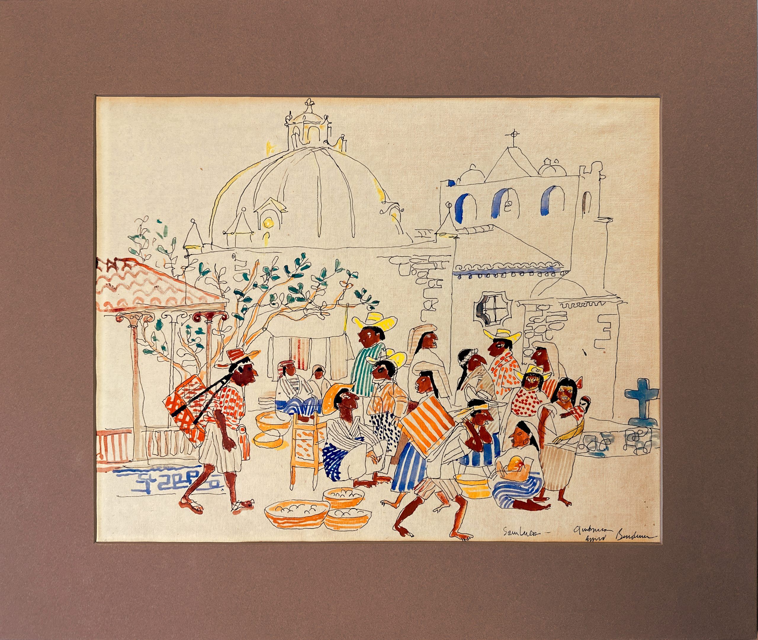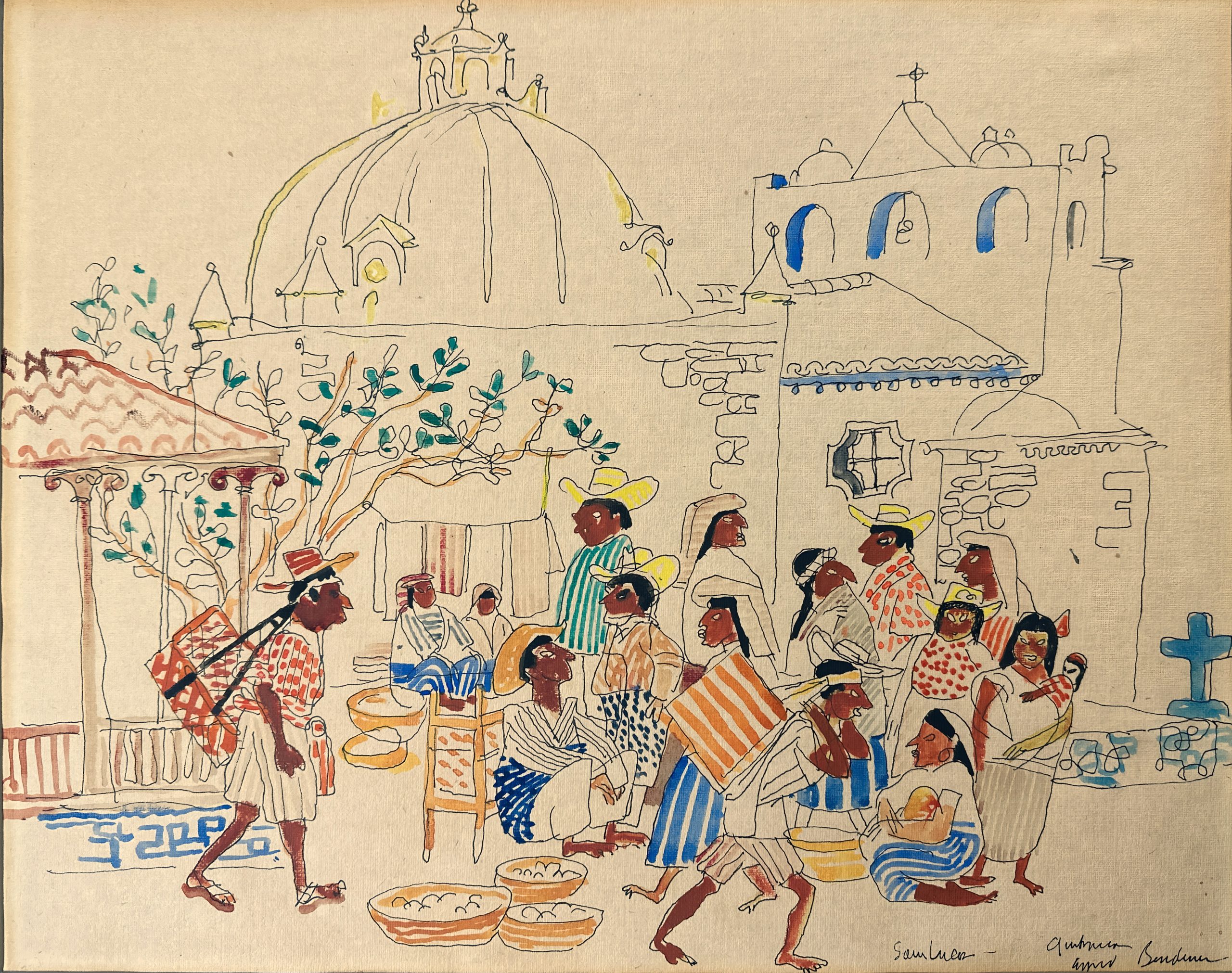 A joyful depiction of island life. Alfred Bendiner retired from the practice of architecture in 1961. Just before his retirement he worked as an archaeological draftsman on a University of Pennsylvania excavation in Tikal-Tikal, Guatemala. It would have been on that trip that Bendiner painted this work.