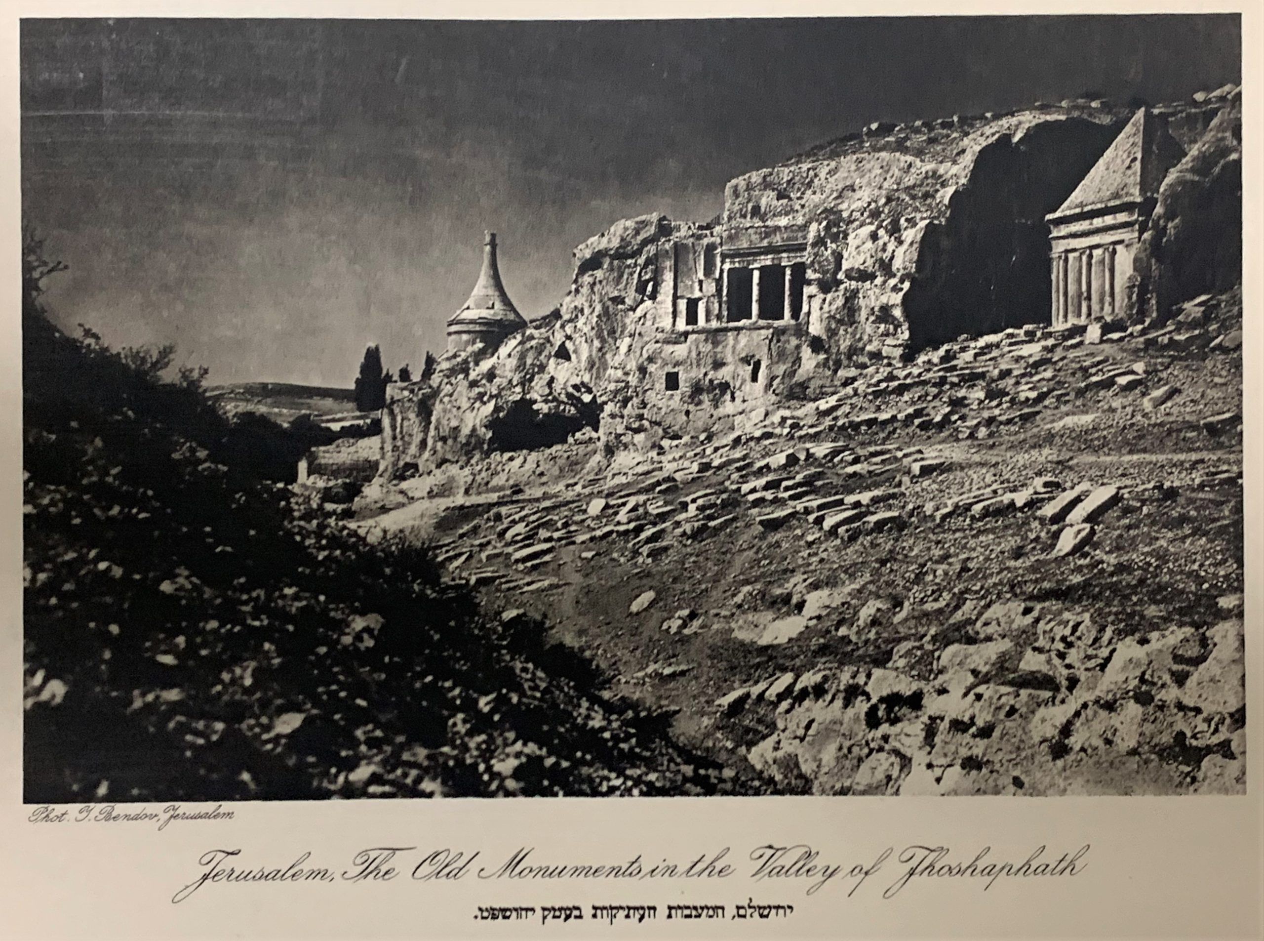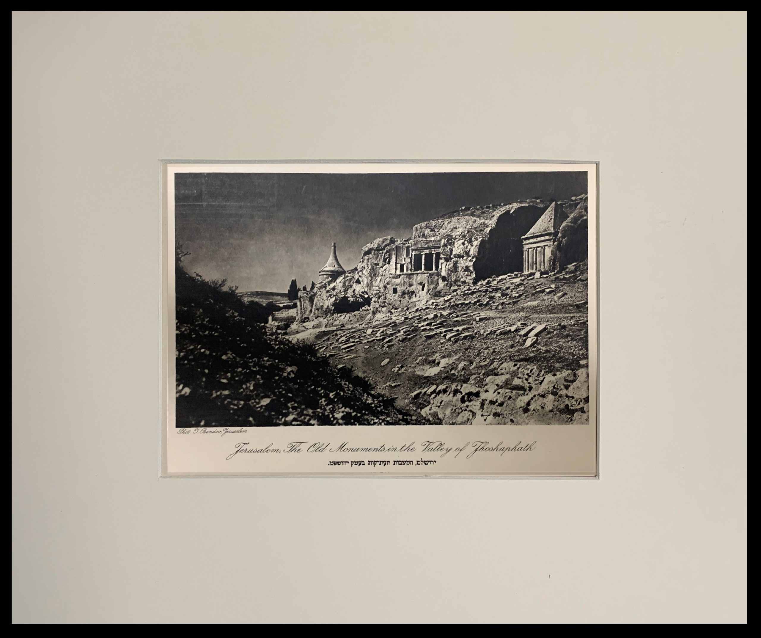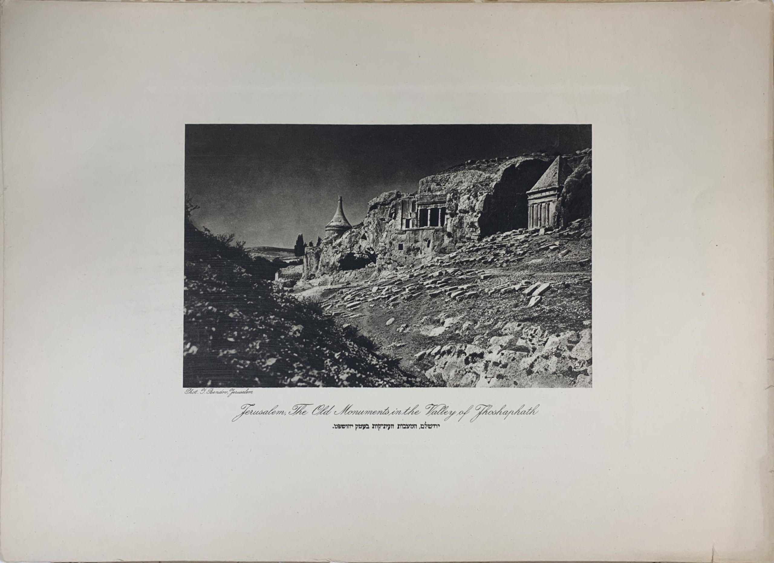 Hanania Brothers were photo technicians on Jaffa Road in Jerusalem, generally thought to be in operation from the 1910s through the 1930s. In 1927 (according to Paris’ Musée d’Art et d’Histoire du Judaïsme), Hanania Brothers published a portfolio of photogravures (also known as héliogravure) from Yaakov Bendov’s photographs of Jerusalem. This work comes from that portfolio, which is now exceptionally rare.