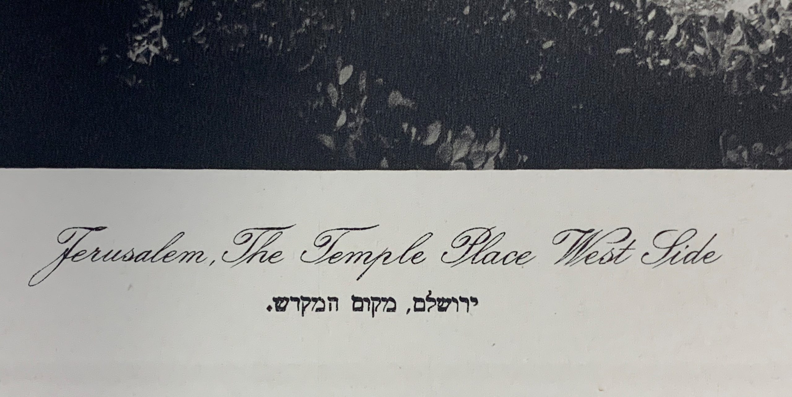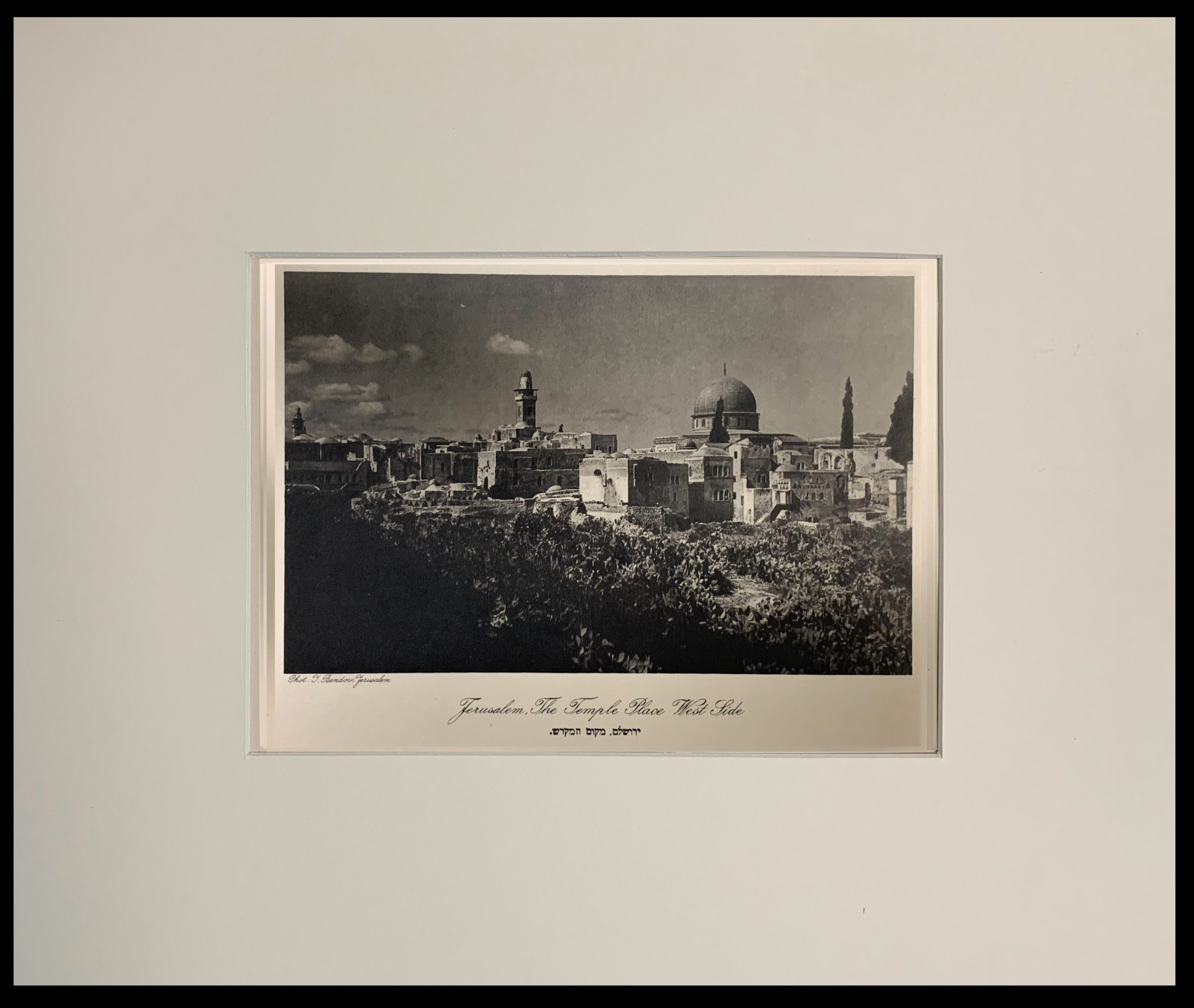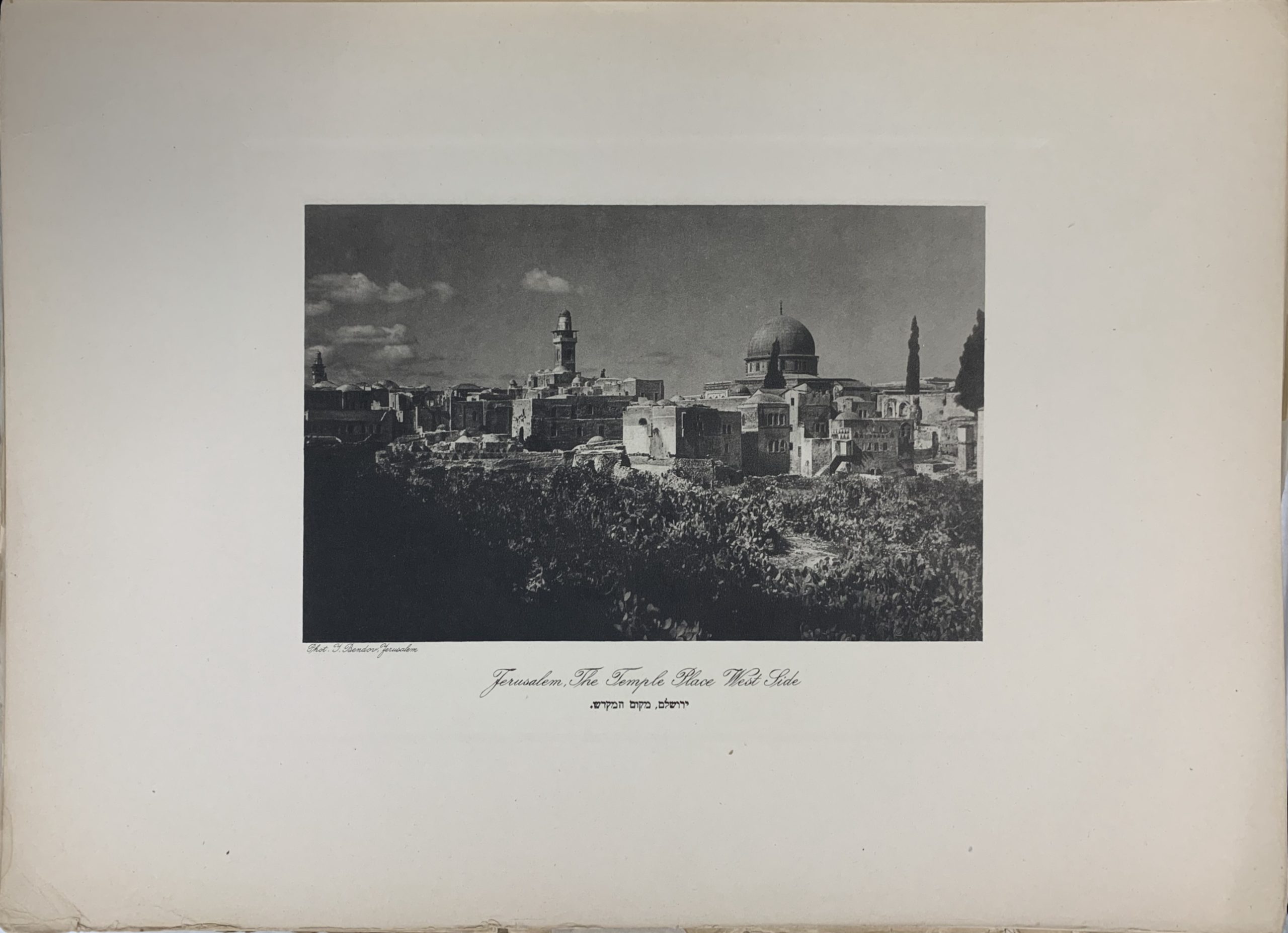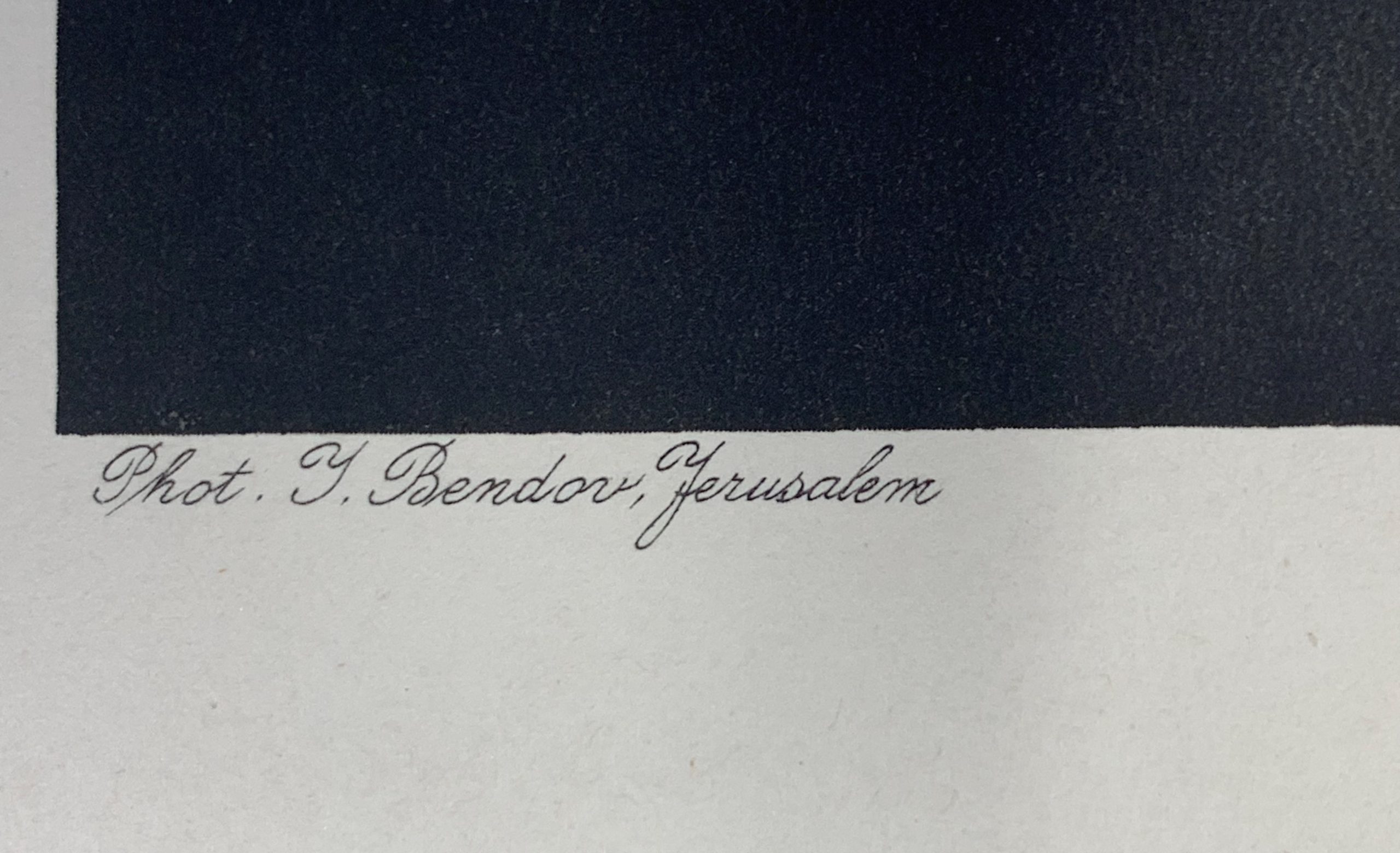 Hanania Brothers were photo technicians on Jaffa Road in Jerusalem, generally thought to be in operation from the 1910s through the 1930s. In 1927 (according to Paris’ Musée d’Art et d’Histoire du Judaïsme), Hanania Brothers published a portfolio of photogravures (also known as héliogravure) from Yaakov Bendov’s photographs of Jerusalem. This work comes from that portfolio, which is now exceptionally rare.