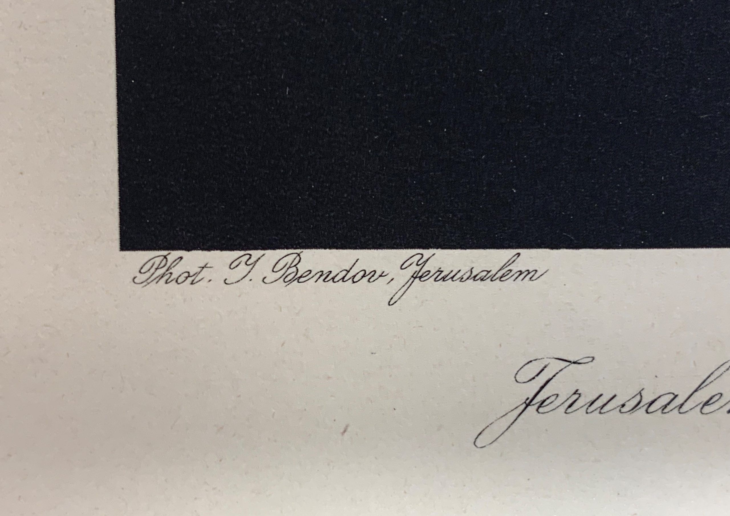 Hanania Brothers were photo technicians on Jaffa Road in Jerusalem, generally thought to be in operation from the 1910s through the 1930s. In 1927 (according to Paris’ Musée d’Art et d’Histoire du Judaïsme), Hanania Brothers published a portfolio of photogravures (also known as héliogravure) from Yaakov Bendov’s photographs of Jerusalem. This work comes from that portfolio, which is now exceptionally rare.