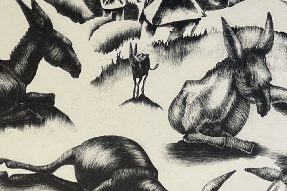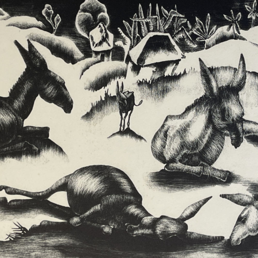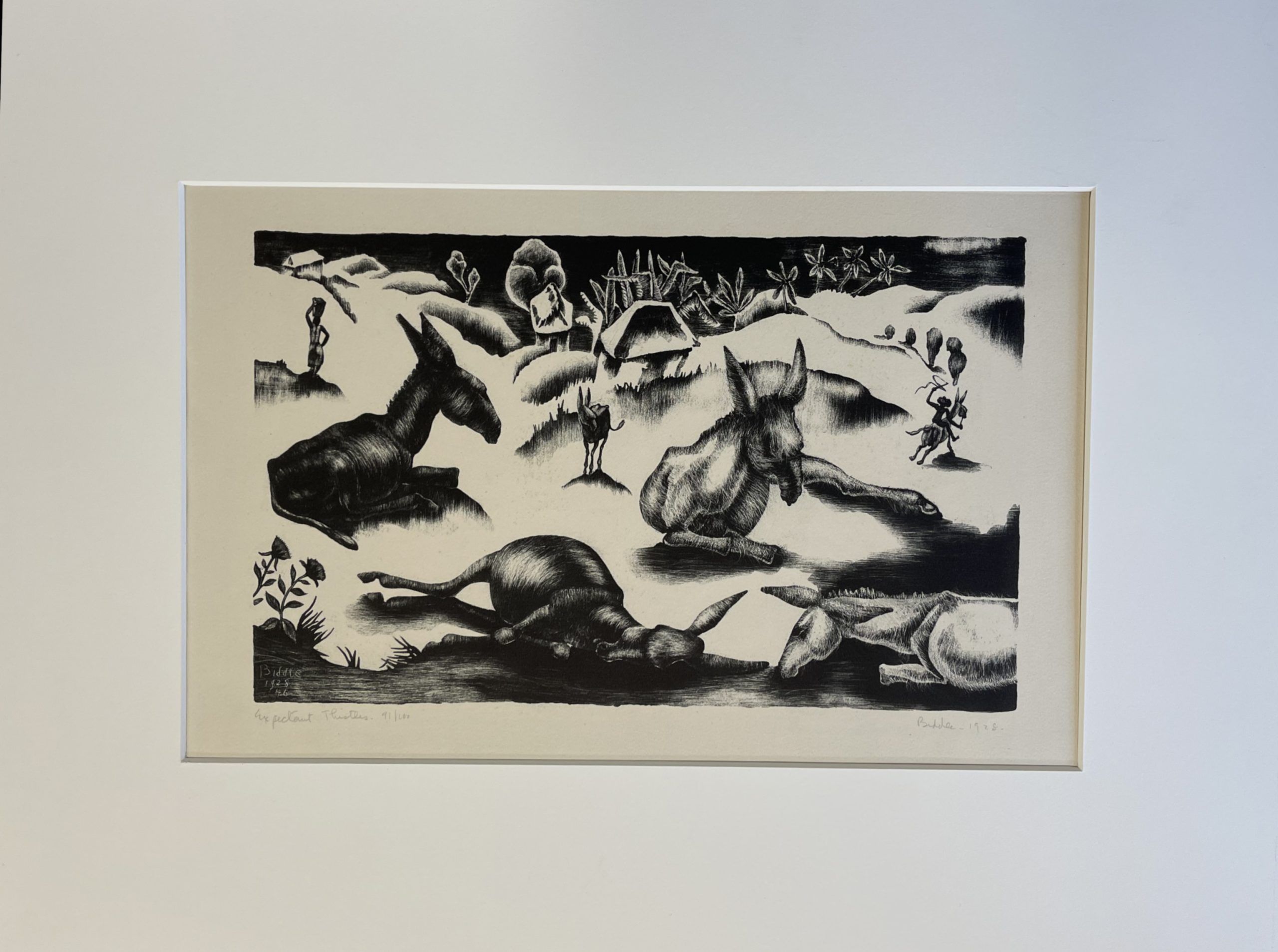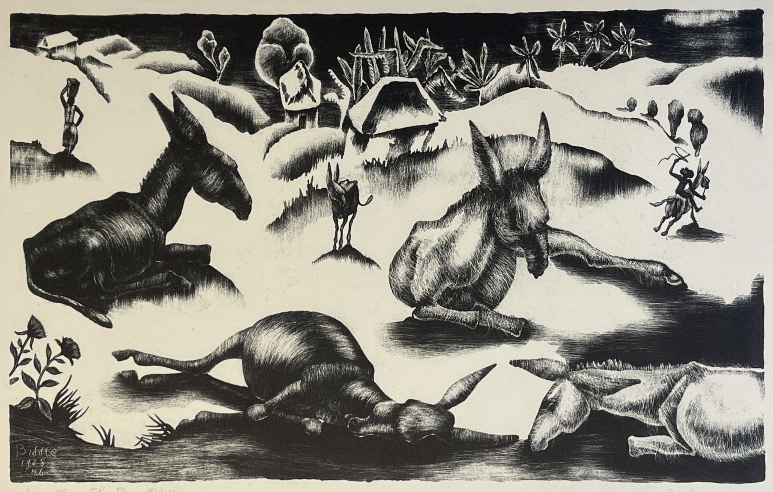 George Biddle was the mastermind behind the Public Works Art Project; it was his petition to FDR for the creation of a national arts program that sparked nationwide interest in government funding of the arts.  This work, depicting donkeys in various states of repose and decay in a loosely American southwestern setting, expresses some of the concerns of the New Deal artists: decay, struggle, rebirth, and the American landscape.  The symbolism of the donkey in the print relates to Biddle’s fascination with the Mexican Muralist movement, to which he was exposed when he toured Mexico with Diego Rivera.