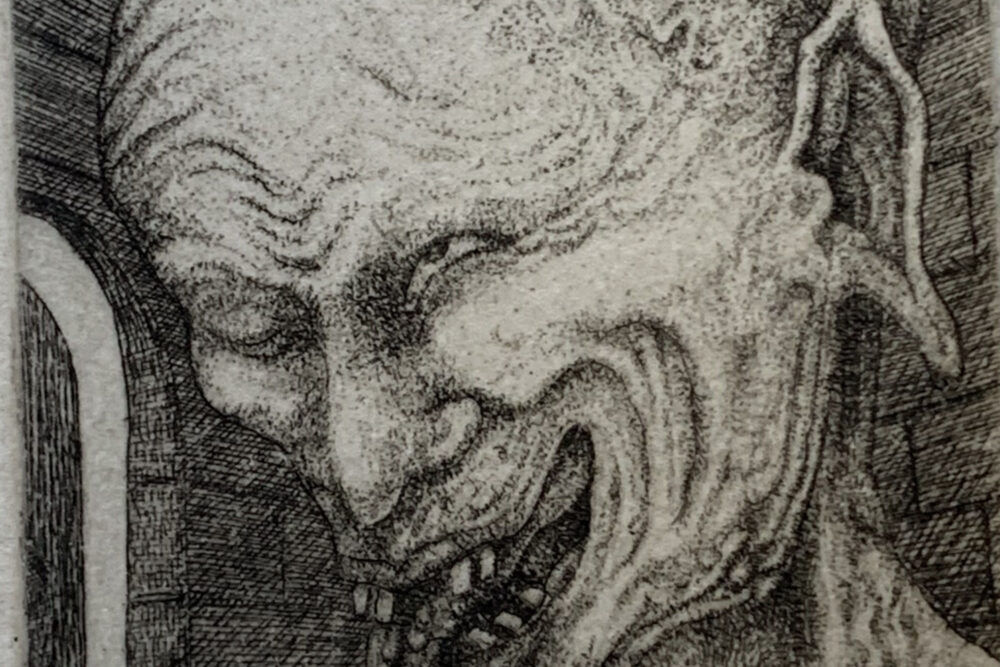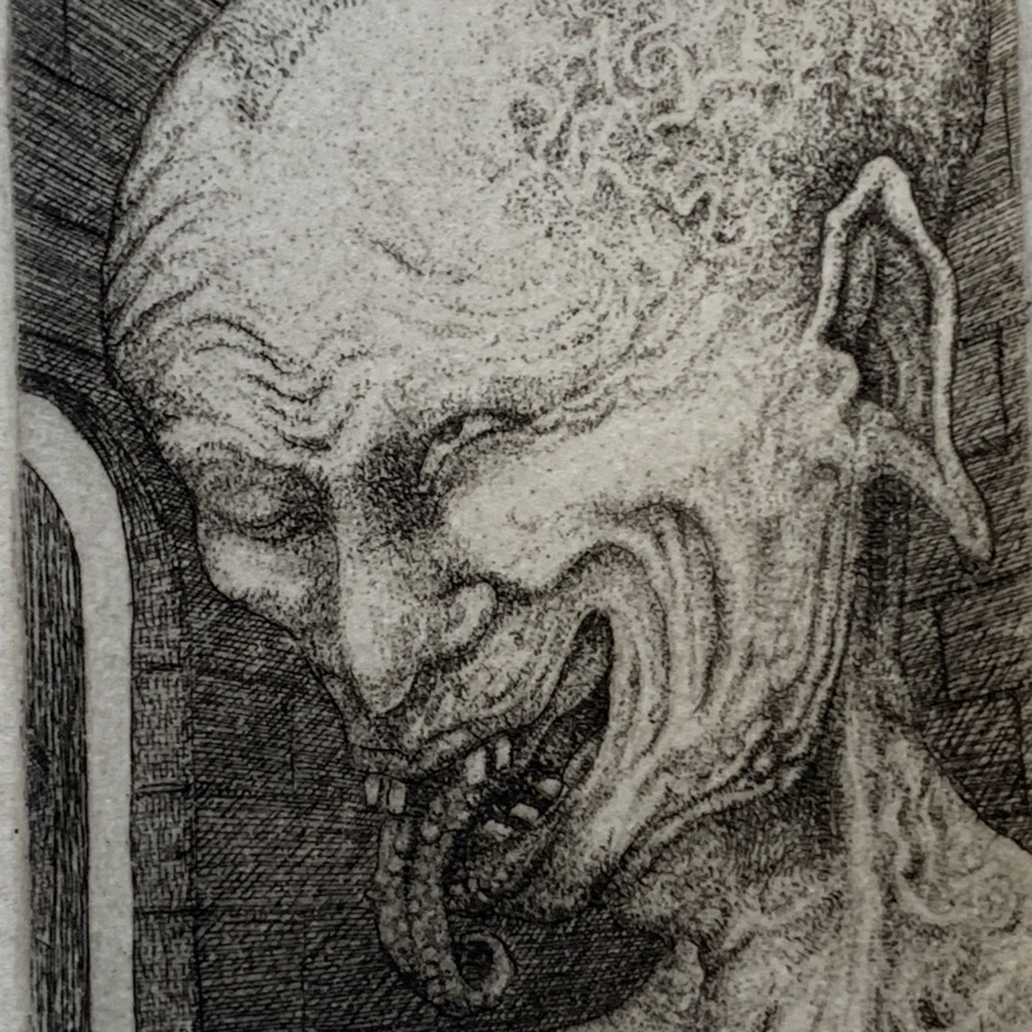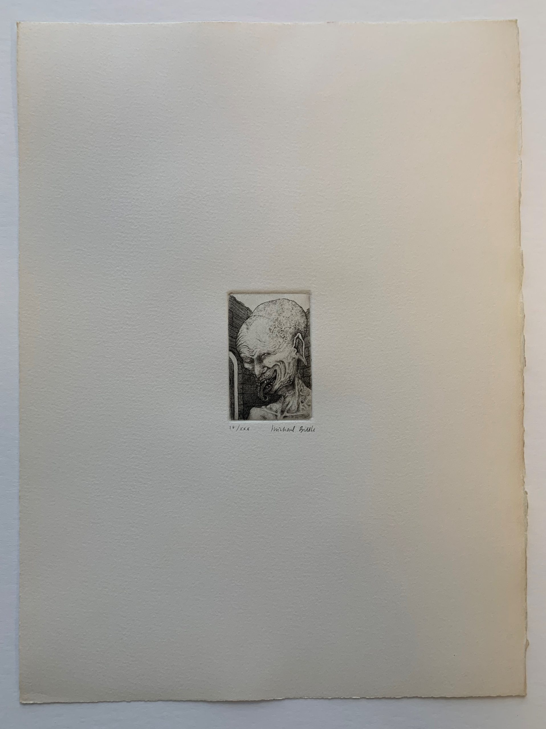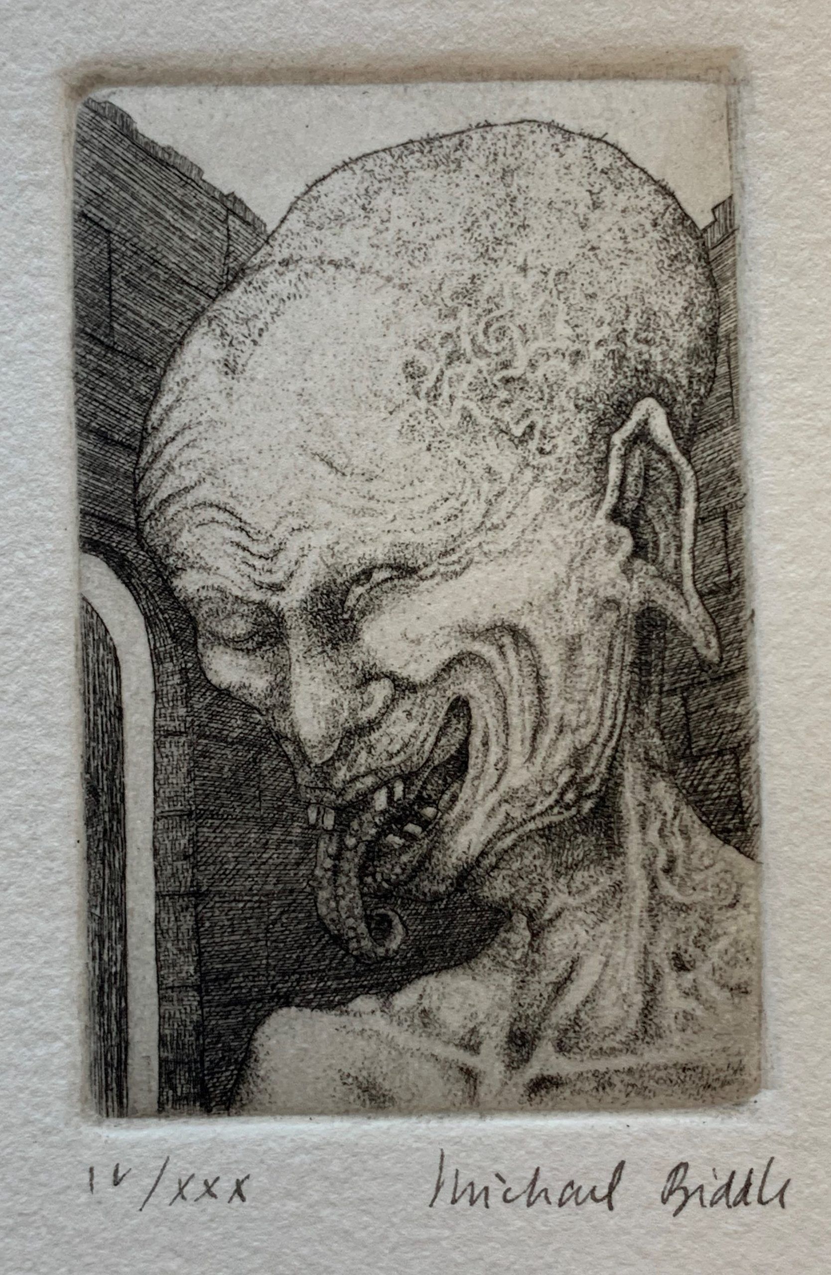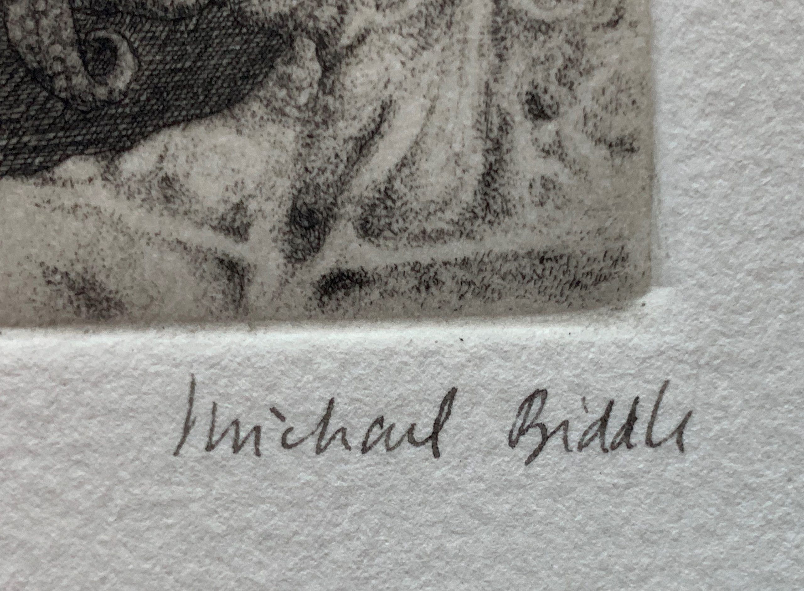 Biddle’s work has often been compared to that of Hieronymus Bosch, the late-Fifteenth Century artist who used fantastic illustrations of religious concepts and narratives to describe his vision of humanity’s desires and deepest fears. In the Victims Portfolio, Biddle portrays humanity’s deepest failures. This etching is a breathtaking depiction of suffering and agony.