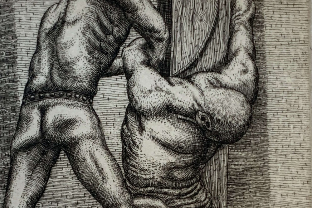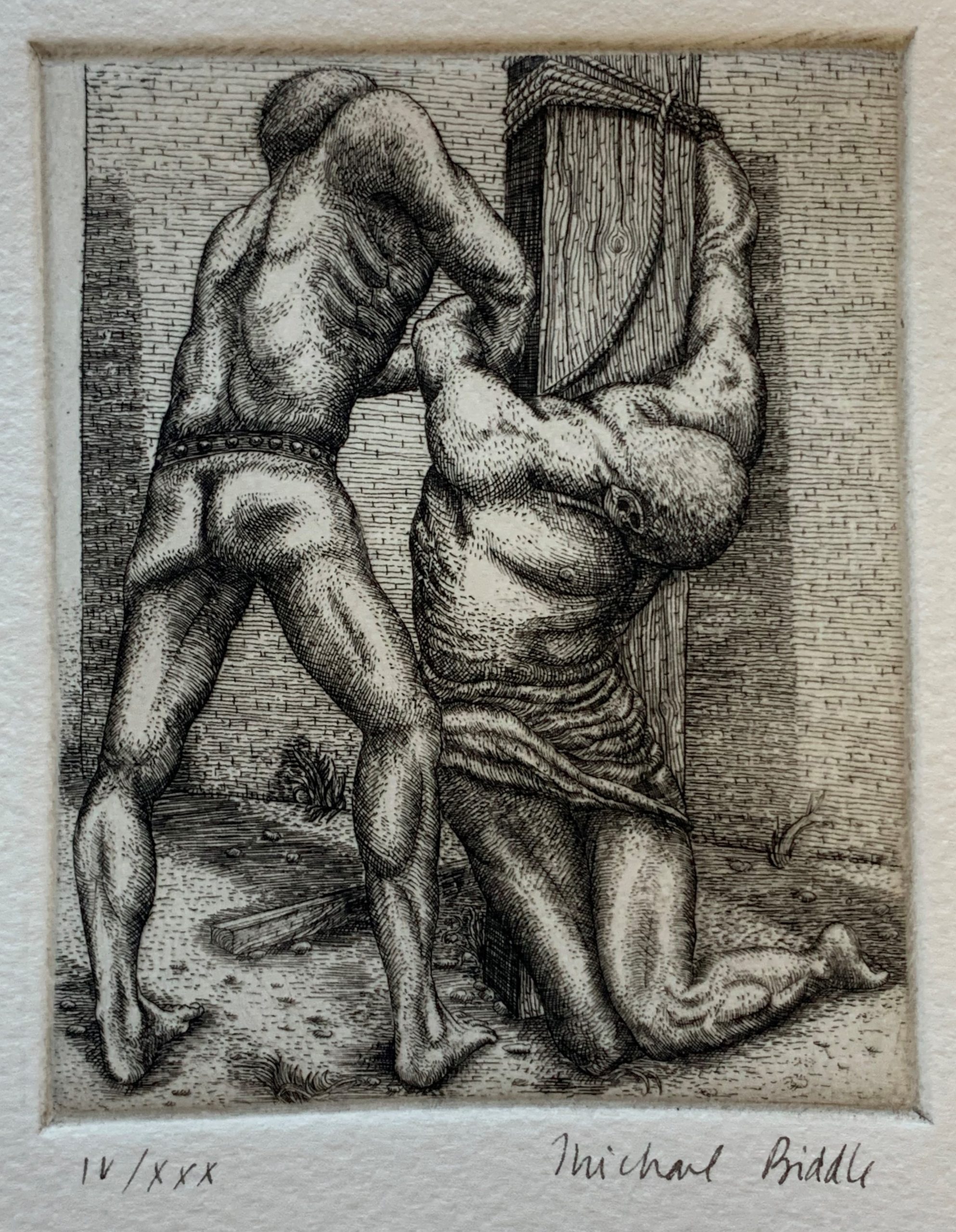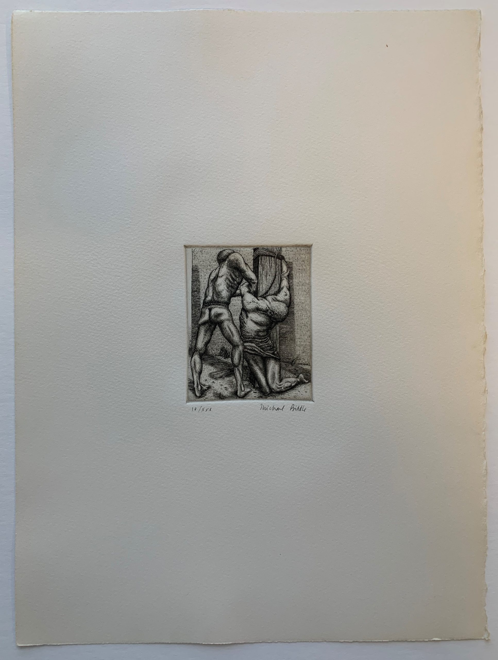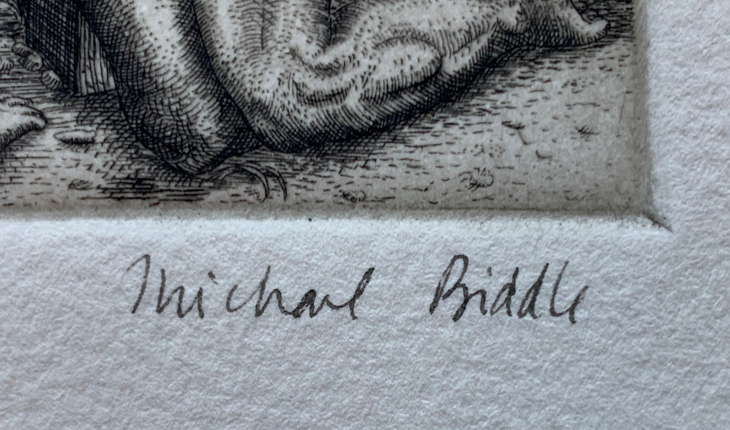 Biddle’s work has often been compared to that of Hieronymus Bosch, the late-Fifteenth Century artist who used fantastic illustrations of religious concepts and narratives to describe his vision of humanity’s desires and deepest fears. In the Victims Portfolio, Biddle portrays humanity’s deepest failures. This etching is a breathtaking depiction of suffering and agony.