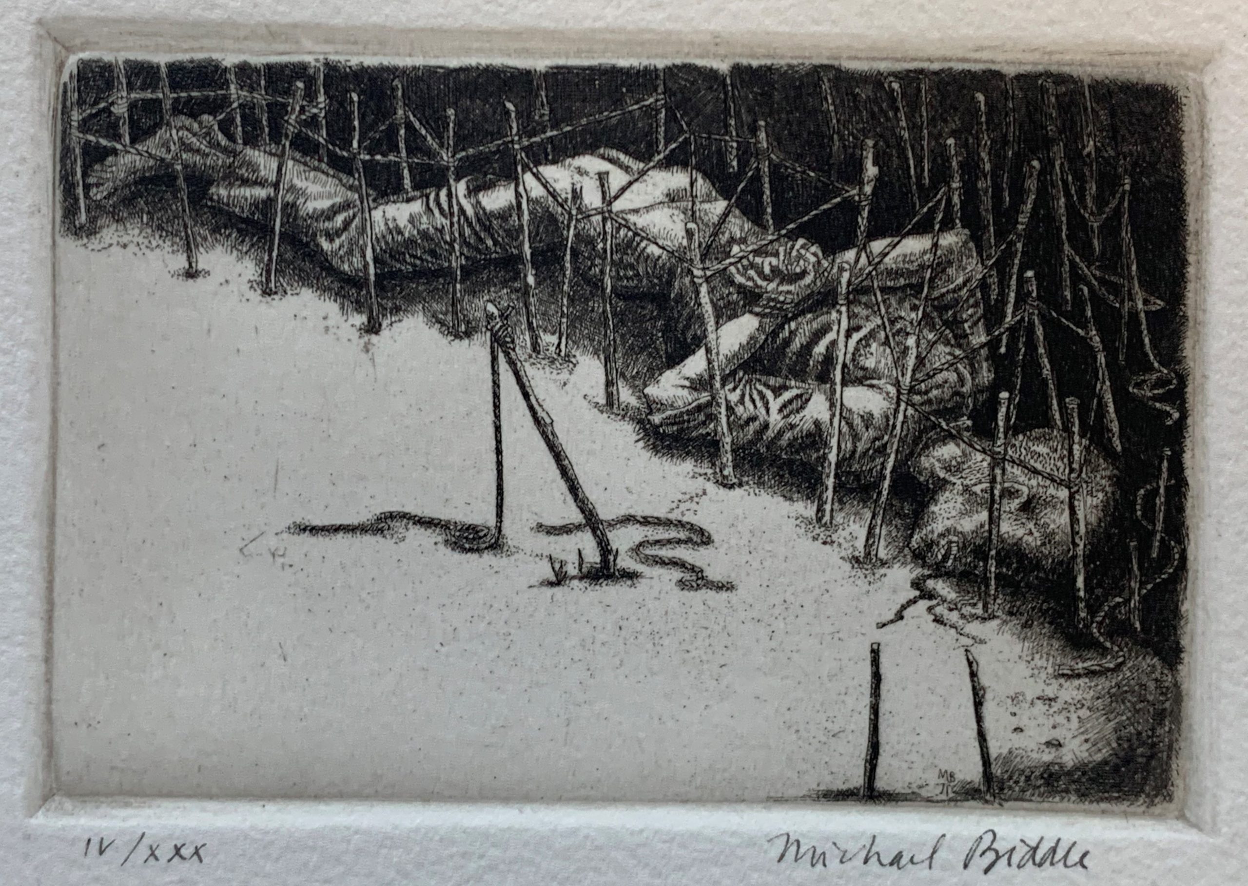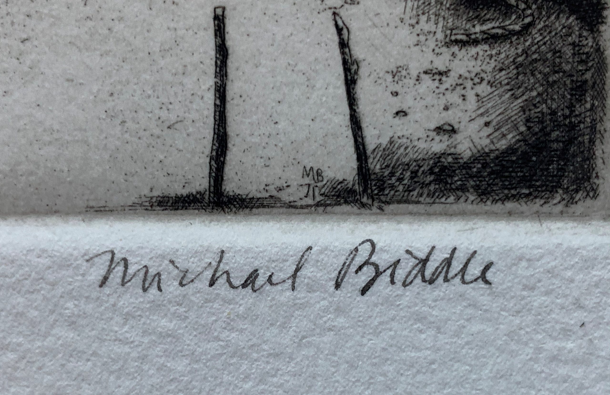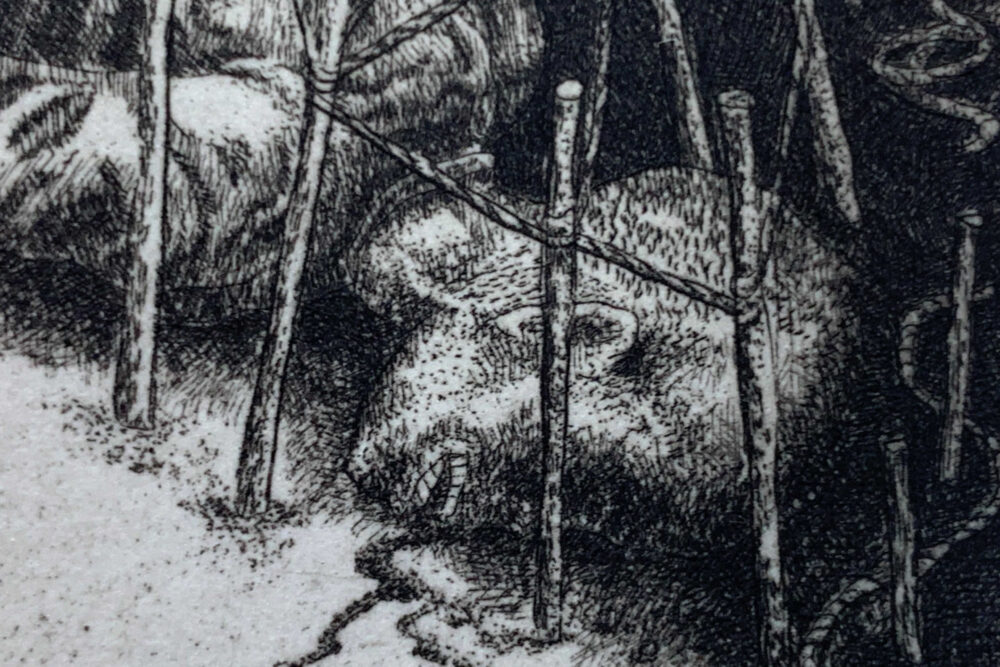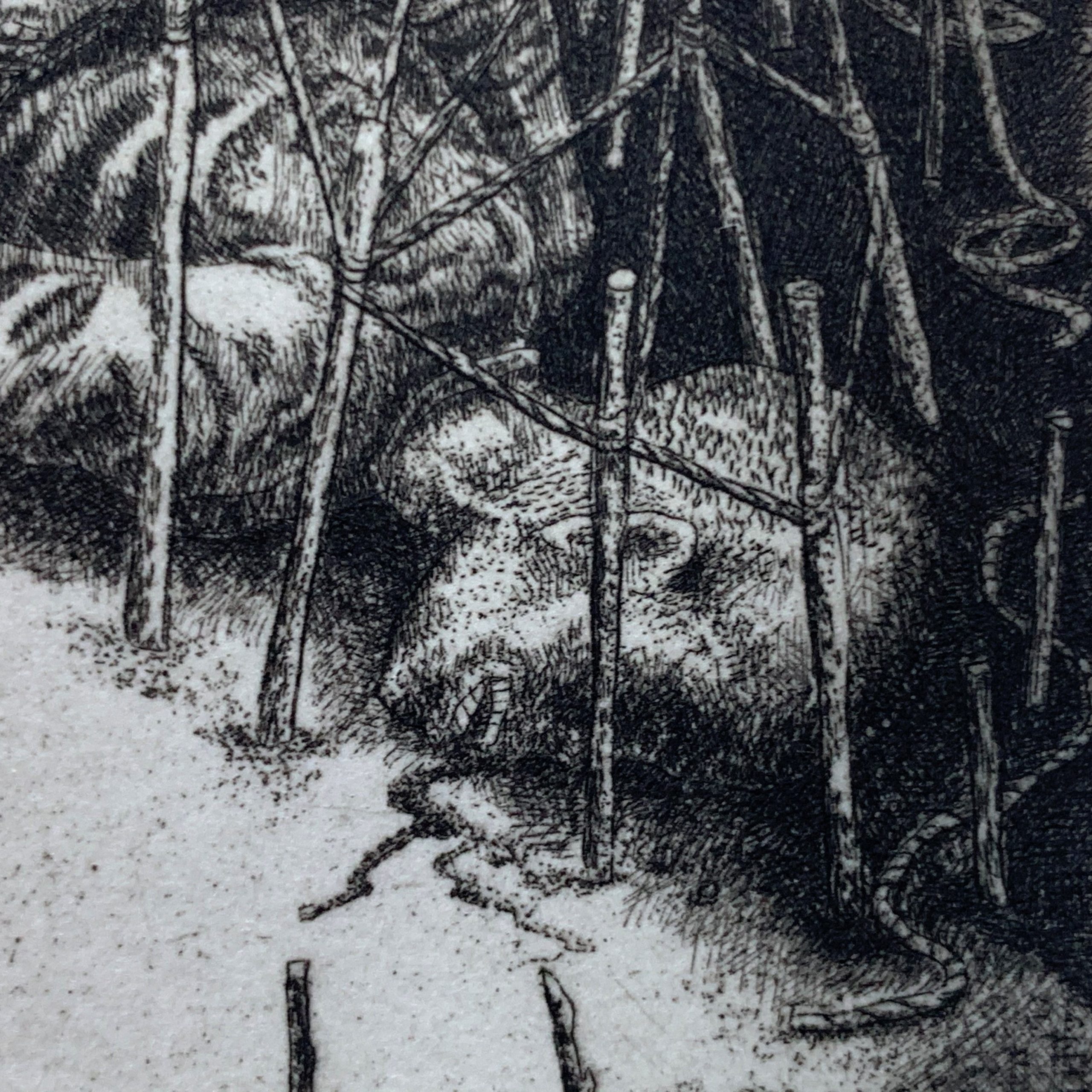 Biddle’s work has often been compared to that of Hieronymus Bosch, the late-Fifteenth Century artist who used fantastic illustrations of religious concepts and narratives to describe his vision of humanity’s desires and deepest fears. In the Victims Portfolio, Biddle portrays humanity’s deepest failures. This etching is a breathtaking depiction of suffering and agony.