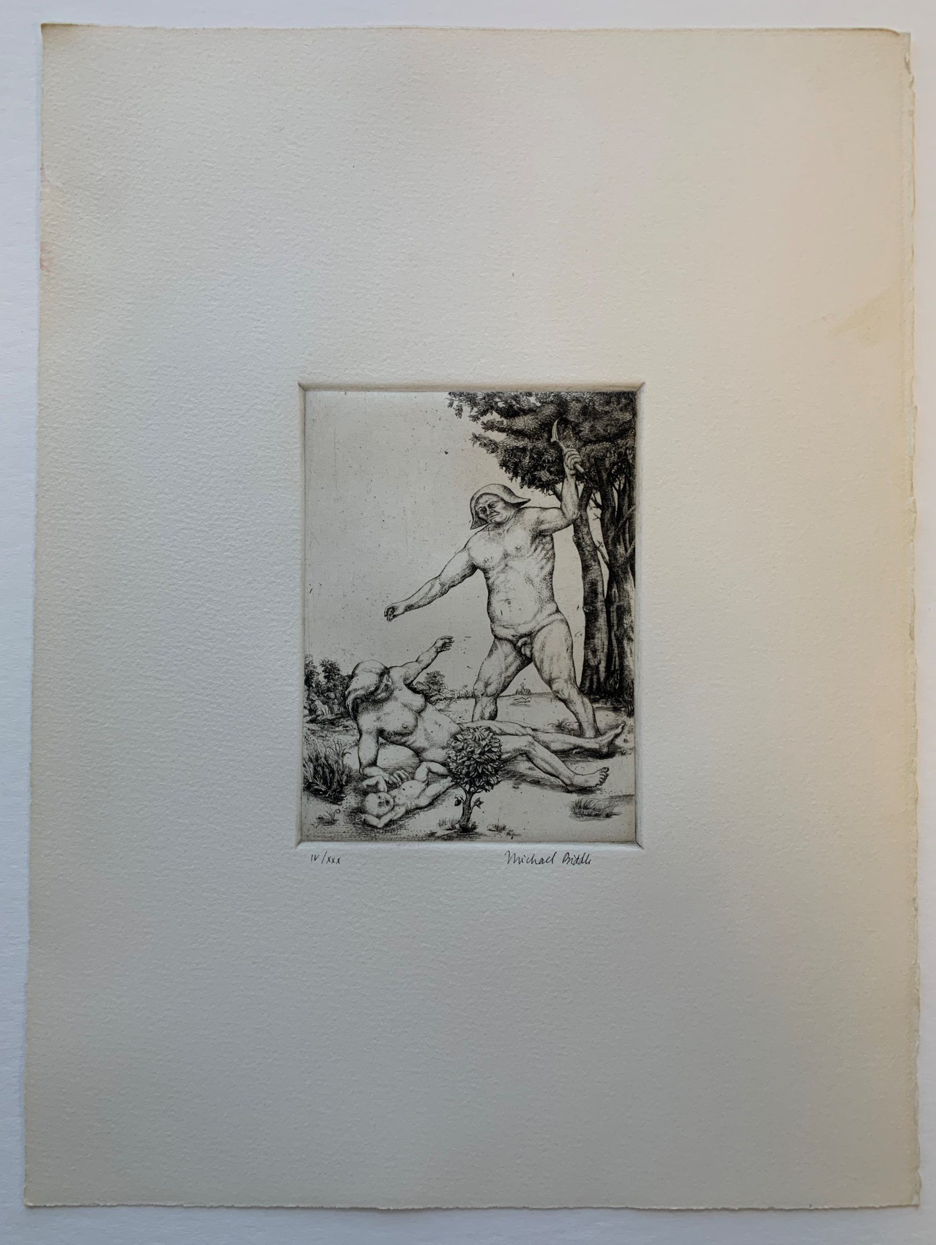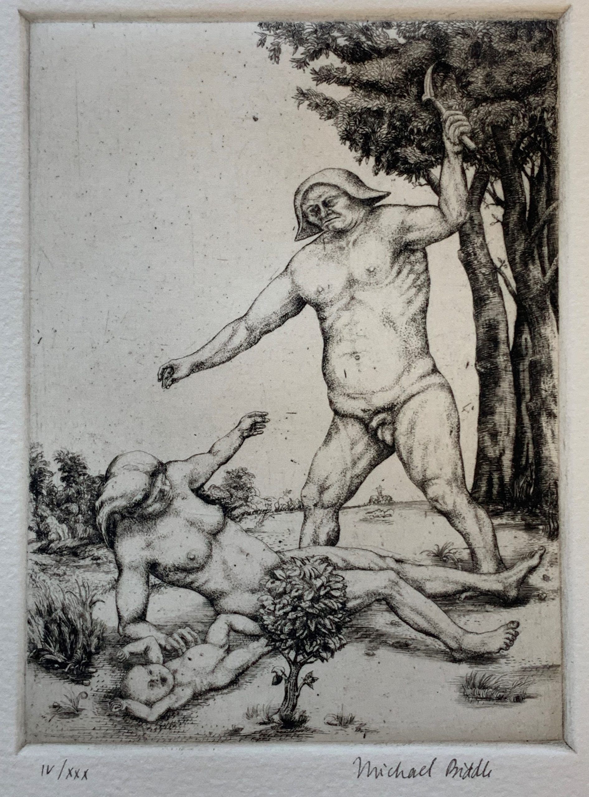 Biddle’s work has often been compared to that of Hieronymus Bosch, the late-Fifteenth Century artist who used fantastic illustrations of religious concepts and narratives to describe his vision of humanity’s desires and deepest fears. In the Victims Portfolio, Biddle portrays humanity’s deepest failures. This etching is a breathtaking depiction of suffering and agony.