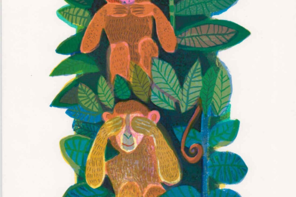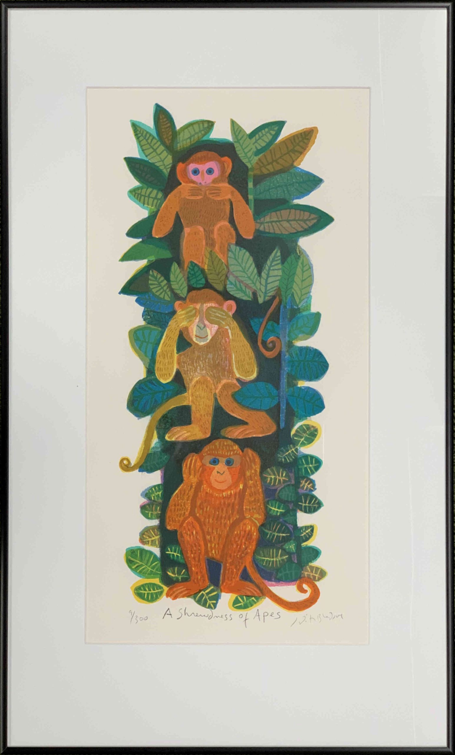 Judith Bledsoe’s imagination and whimsey visit the animal kingdom!  Three monkeys—see no evil, hear no evil, speak no evil.  A great gift for new parents, a teacher, or to decorate a nursery!