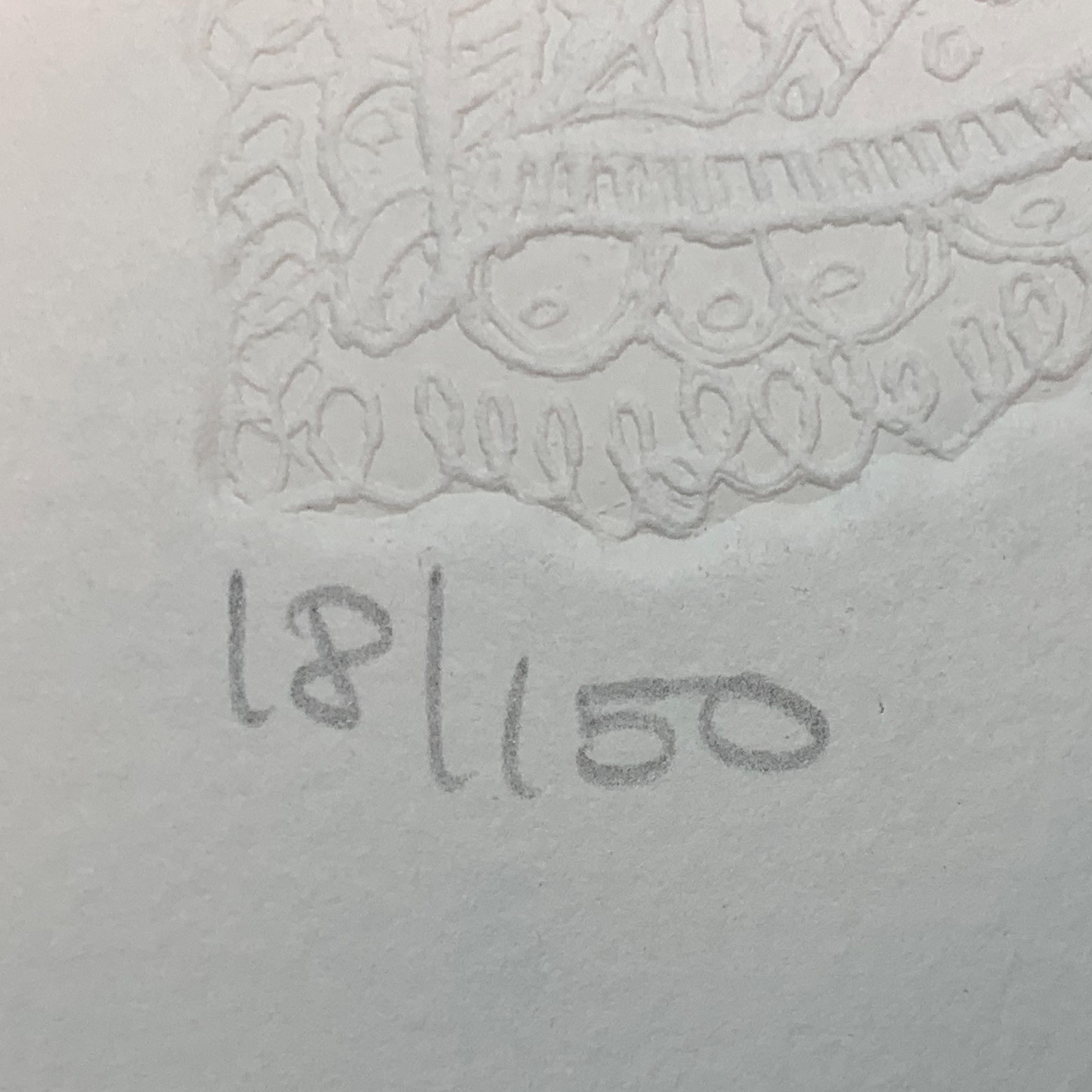 Etching in colors from copper plates printed on Vélin d’Arches, with a beautiful blind-embossed lace border.
