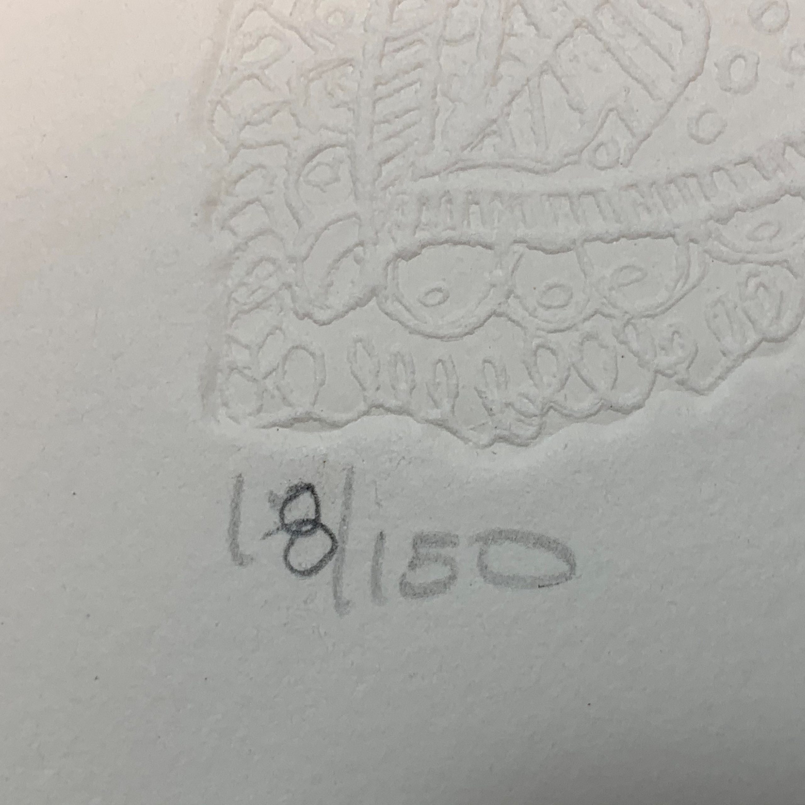 Etching in colors from copper plates printed on Vélin d’Arches, with a beautiful blind-embossed lace border.