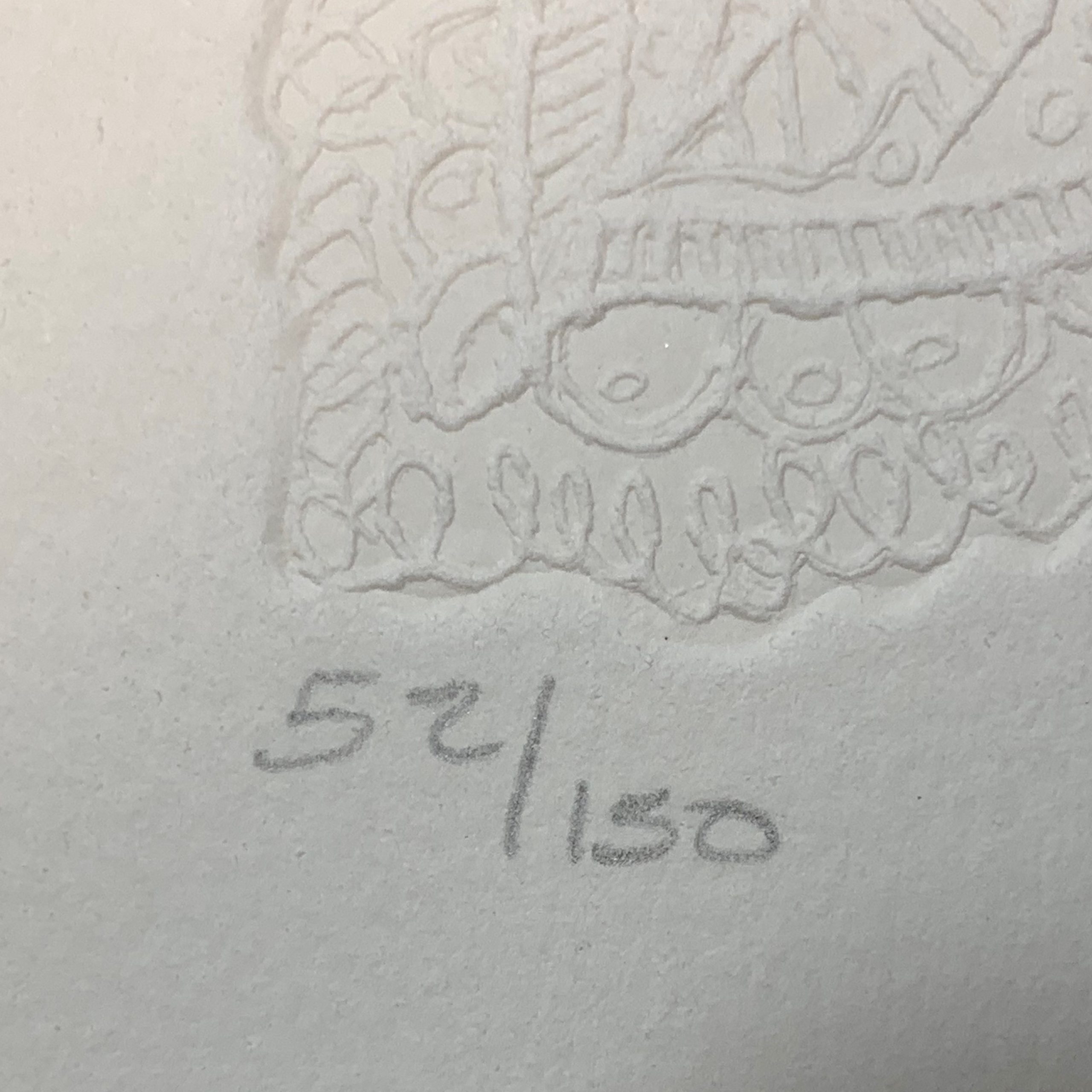 Etching in colors from copper plates printed on Vélin d’Arches, with a beautiful blind-embossed lace border.