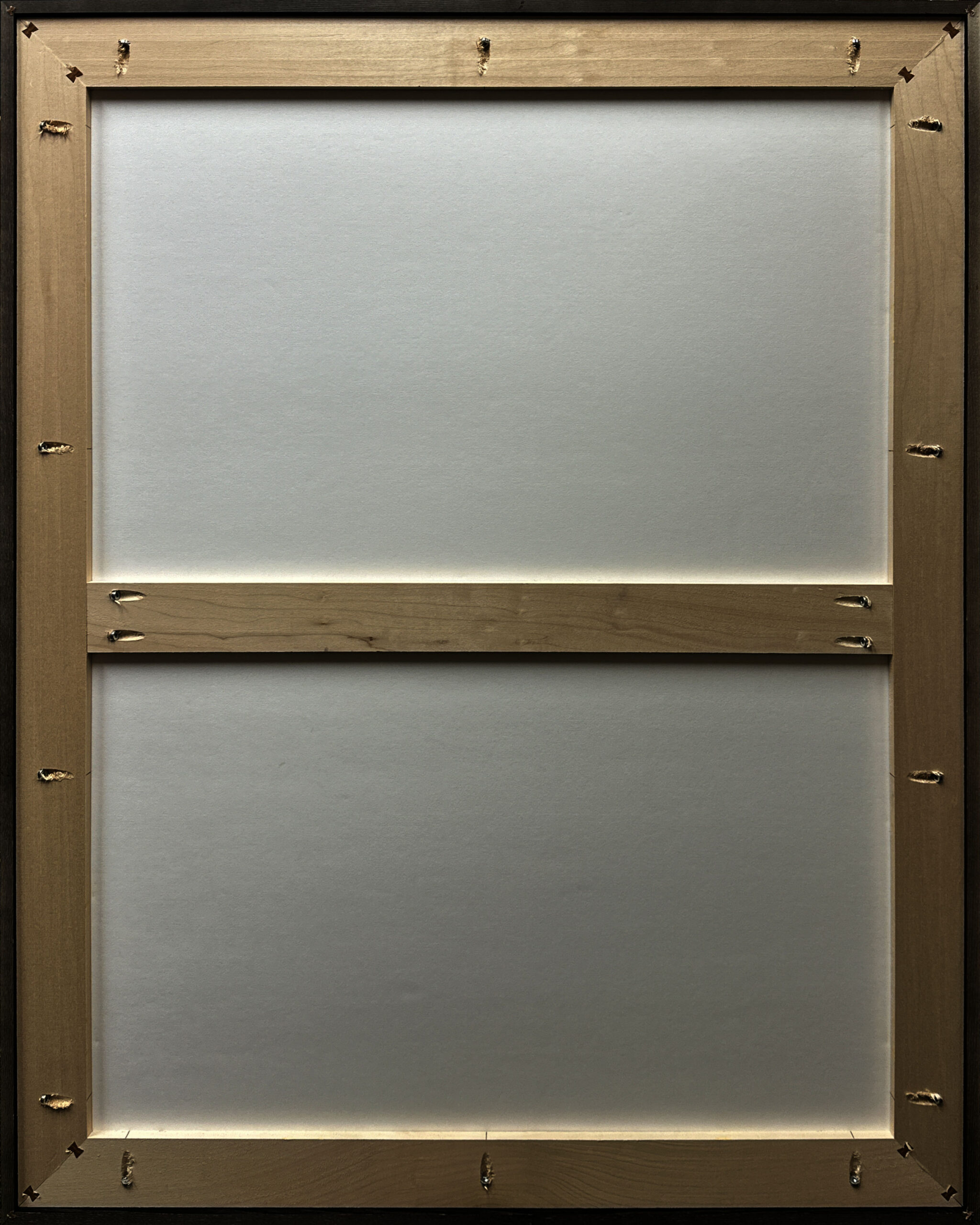 Custom matted and framed in a black-stained solid Ash frame, buttressed with a stretcher, behind 99% UV-blocking art glass using strictly conservation-grade materials.