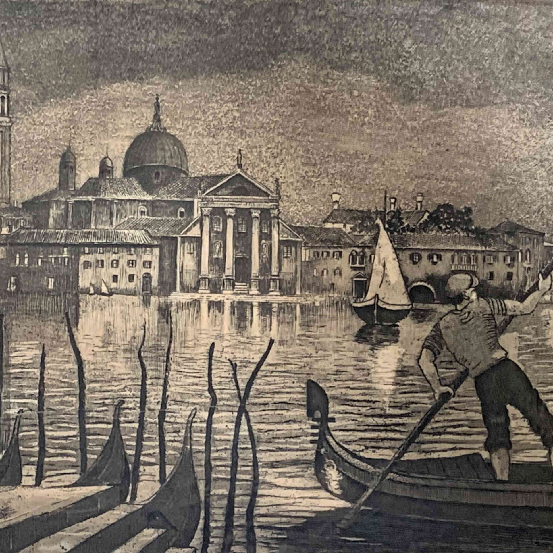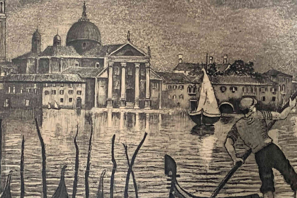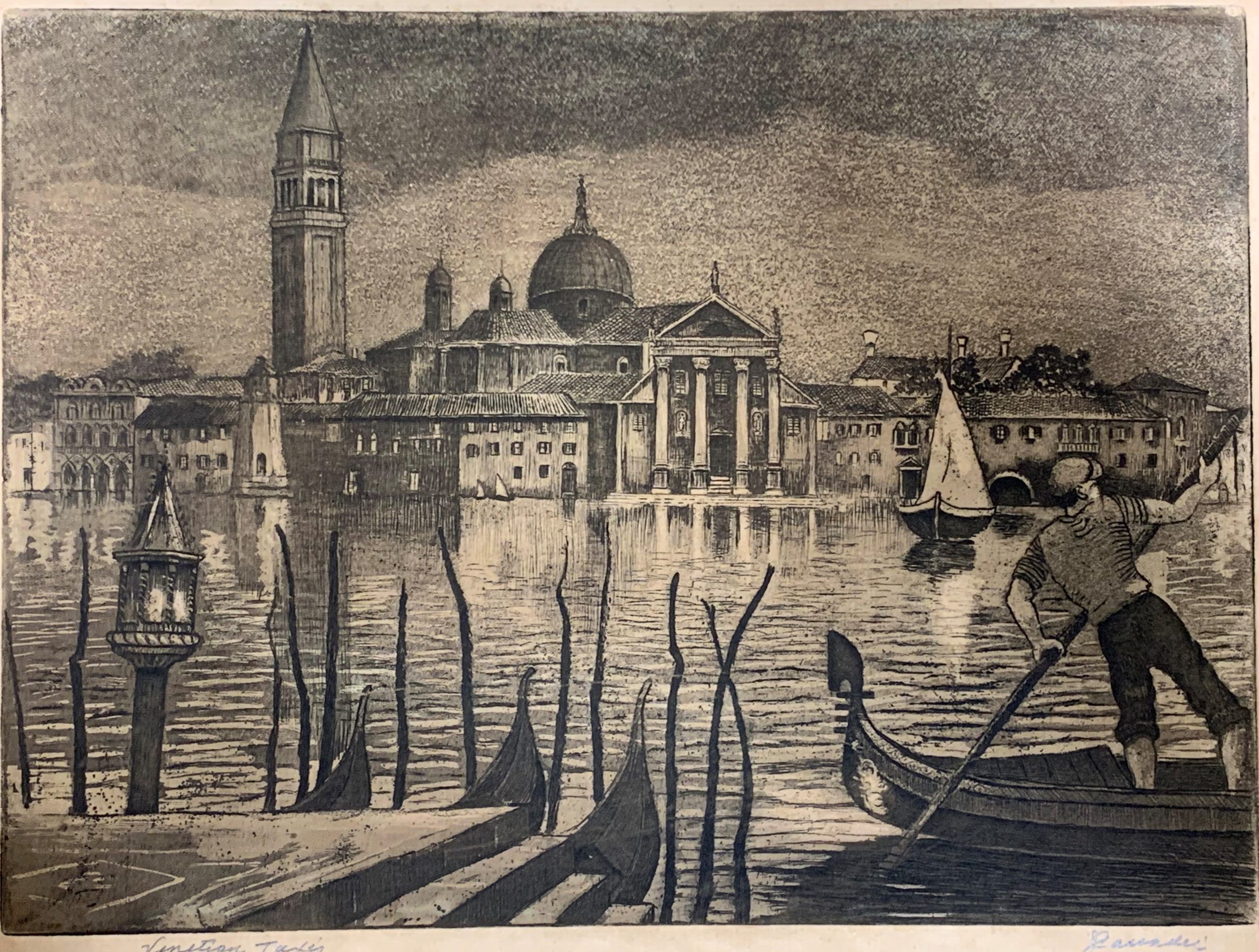 Cassadei, an accomplished Chicago-based etcher, produced a series of works depicting Venice, with romantic images of the people and architecture of the city.