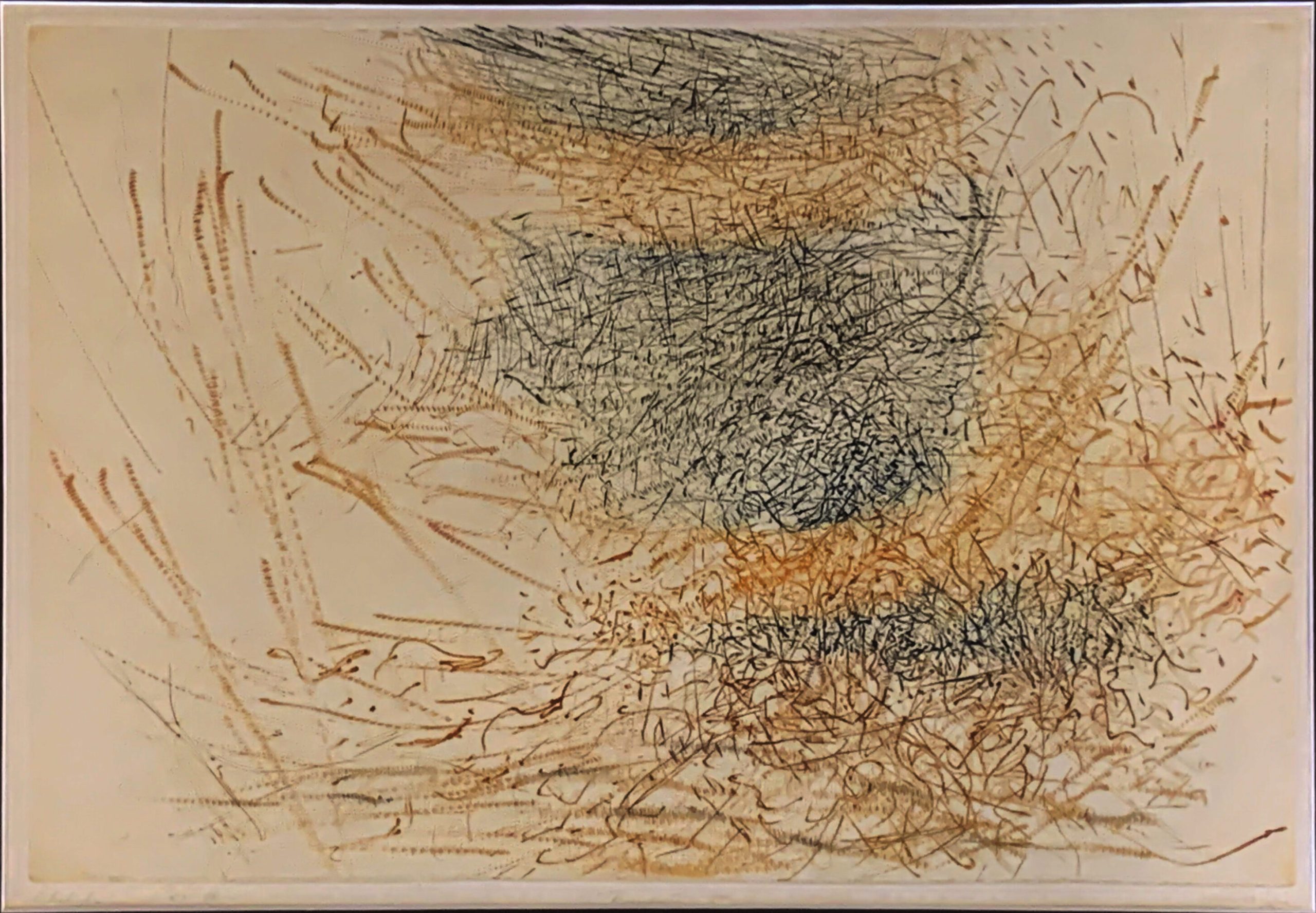 Frumenti is one of the very first prints that Bernard Childs made.  He had already made a name for himself as a painter when he went to Paris in about 1952.  Late in 1954, Childs spent a month or more studying engraving at Stanley William Hayter’s Atelier 17.  It was there that he made Frumenti.  (Childs made 200 impressions of Frumenti, which was so exhausting that he vowed to never again make such a large edition!)