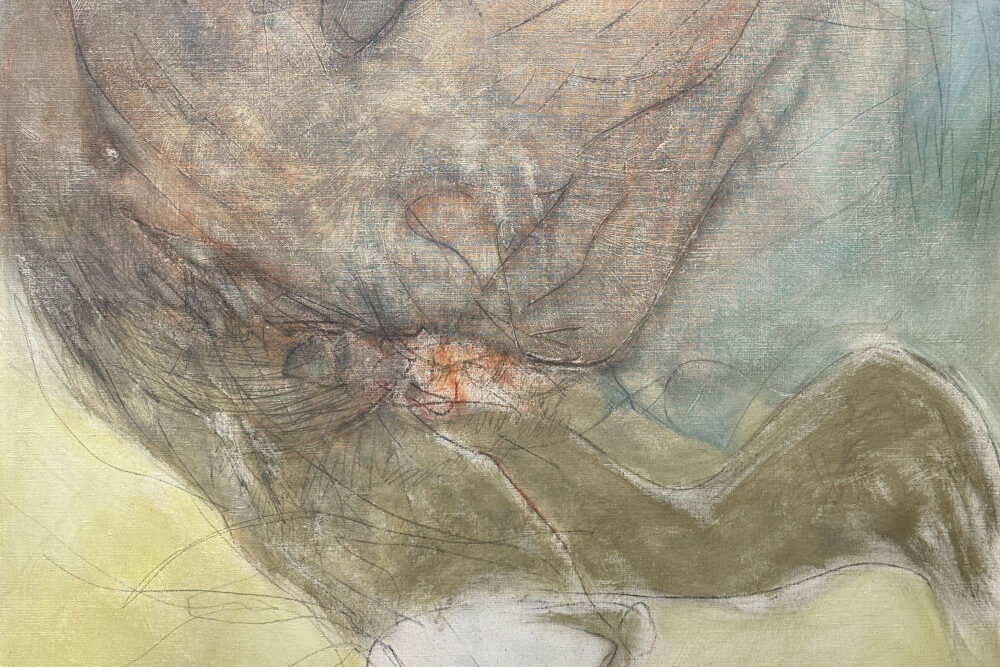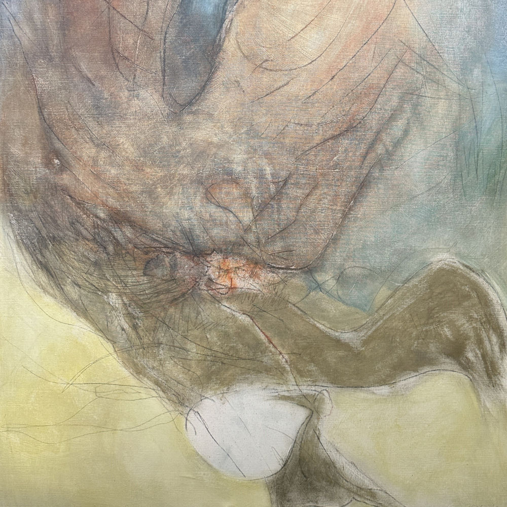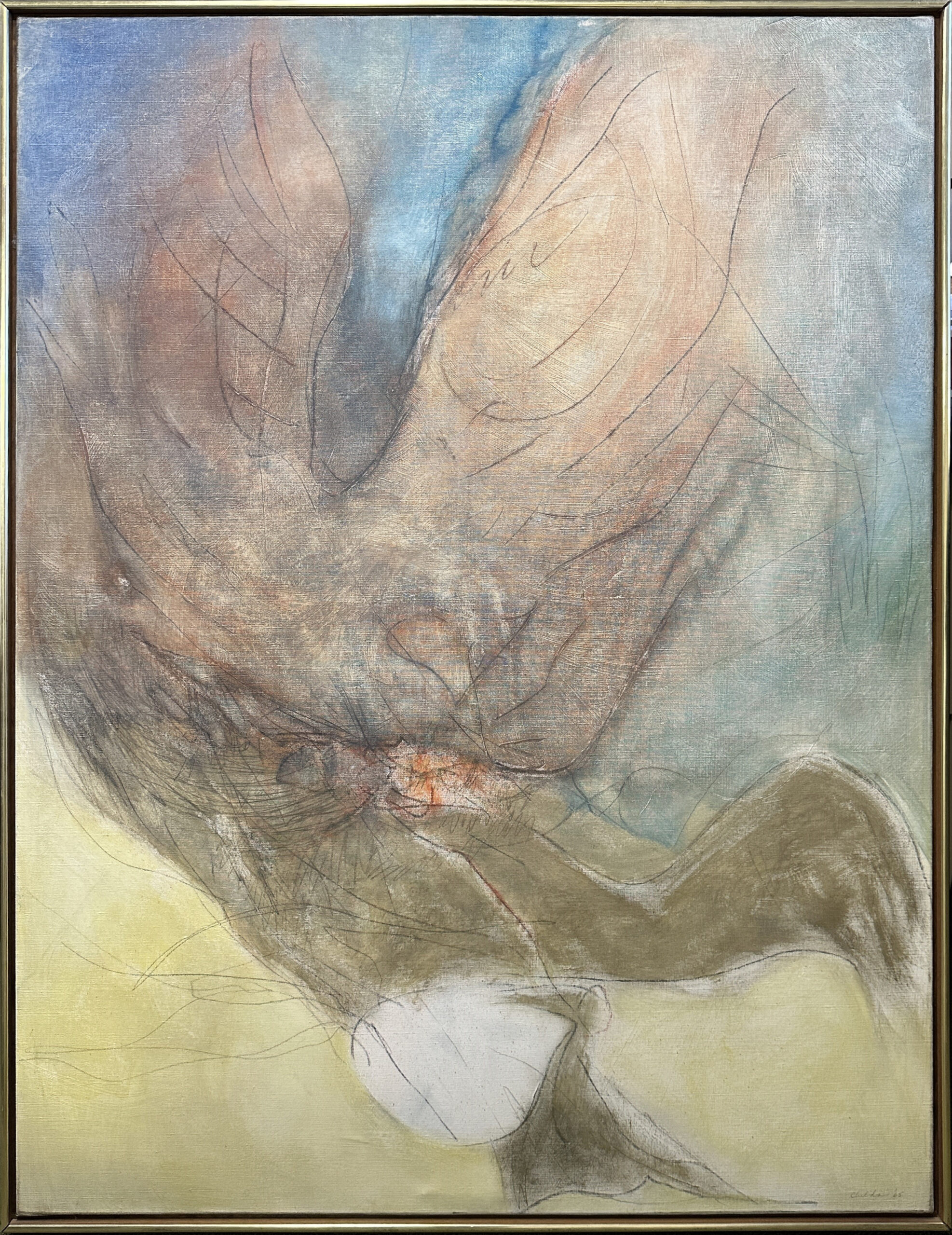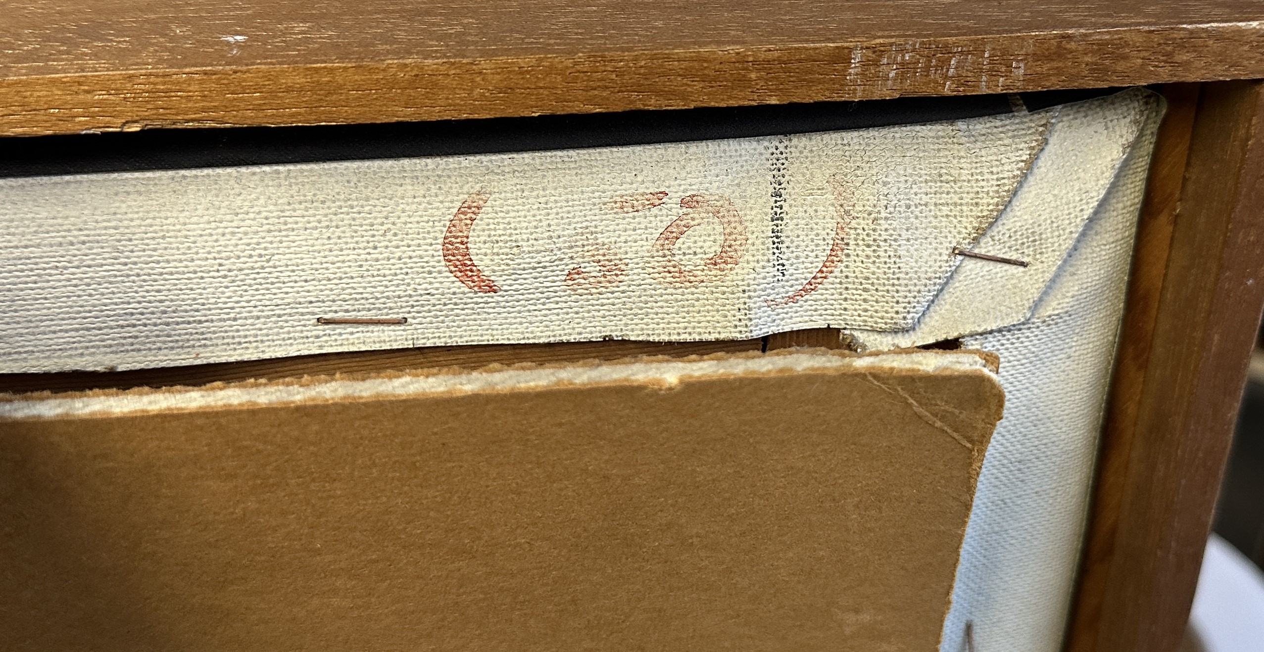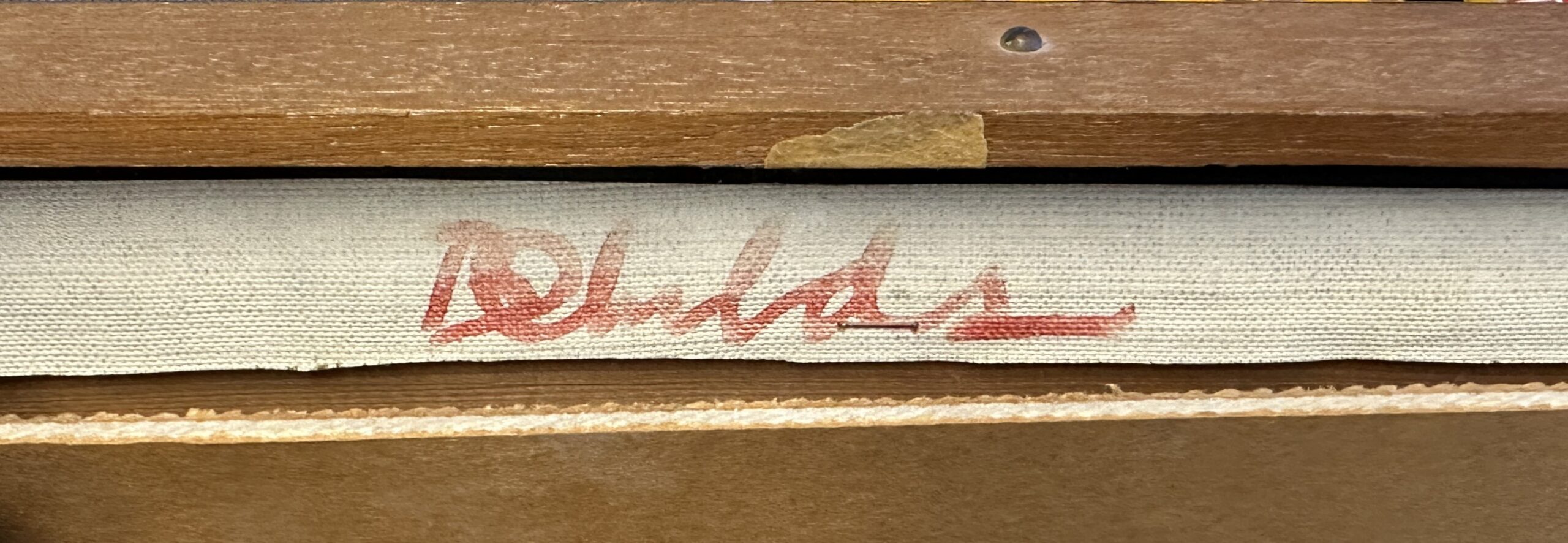 Hand-signed, in pencil, with date, en recto lower right. Signed again, titled, and dated on the canvas overhang en verso.