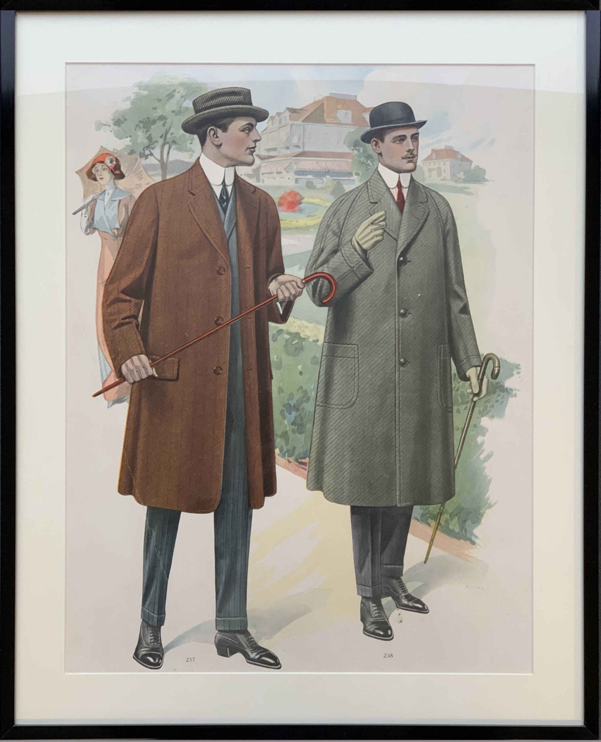 This fine lithograph was included in a beautifully-made portfolio published by the American Art Custom Tailors company. Showing fashions for men from the start of the Twentieth Century, the pictures are romantic depictions of another time. Looked at differently, the pictures have an element of camp. The men in this and the other pictures in the portfolio largely ignore the women in the background; they have eyes only for each other.