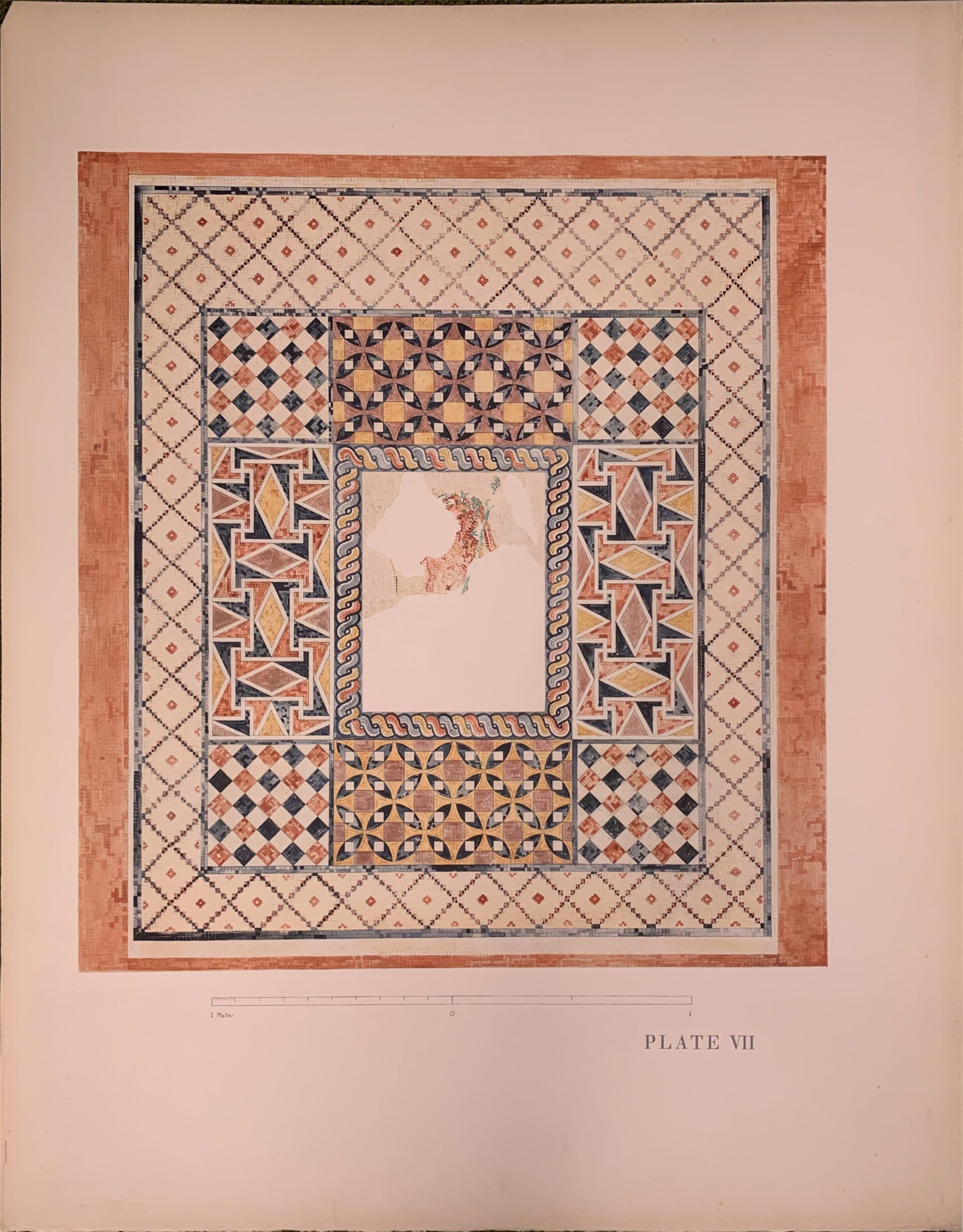 Meanwhile, Jane Norton Grew Morgan visited Corinth in 1924 and was fascinated by it, so she financed the excavation of the villa which the Shears had discovered. Later, Jane’s husband, J. Pierpont Morgan II, financed the production of a folio to document these magnificent discoveries, Corinth: Results of Excavations Conducted by the American School of Classical Studies at Athens, Volume V: The Roman Villa. This folio, written by Dr. Shear, contained a detailed discussion of the excavation and site as well as 13 plates, most made from watercolors which Nora Shear had painted, showing some of the excavated buildings. The plates in the folio are magnificent in size and content, the size dictated by the participants’ desire to produce the head of Dionysus as a frontispiece in exact facsimile of the size of the mosaic itself.